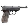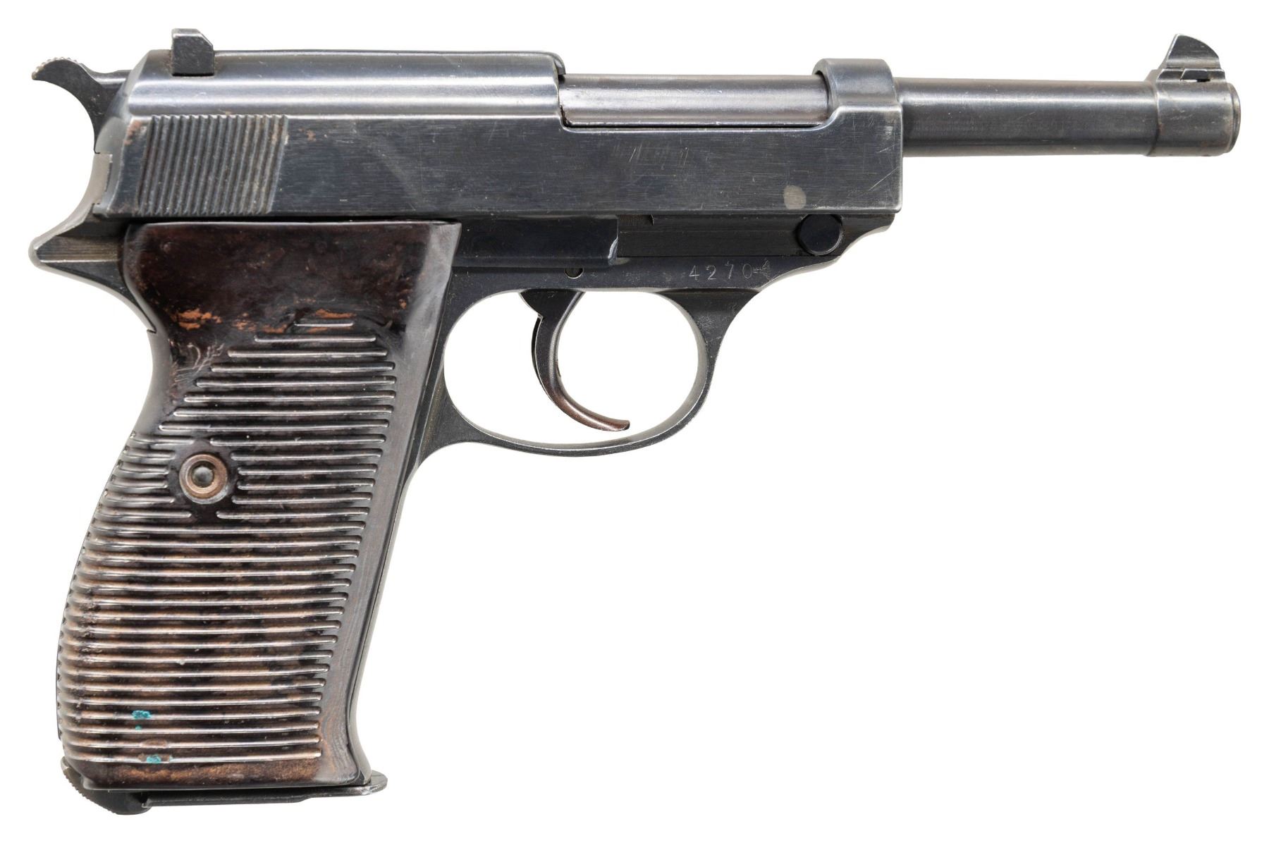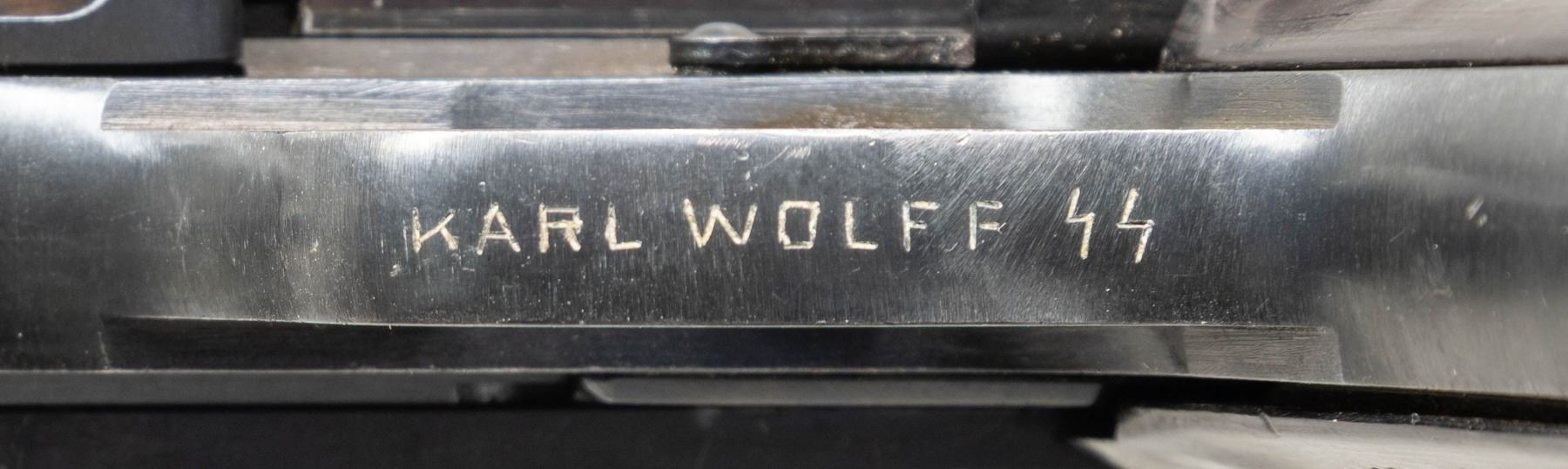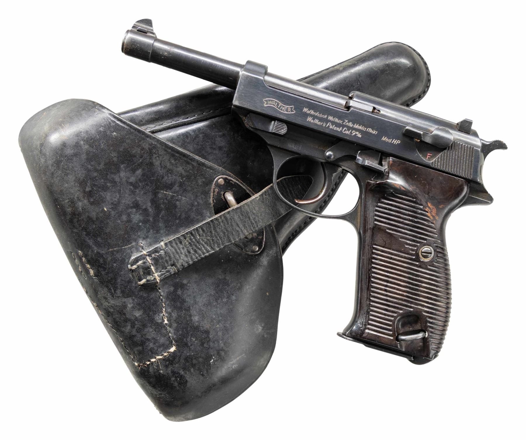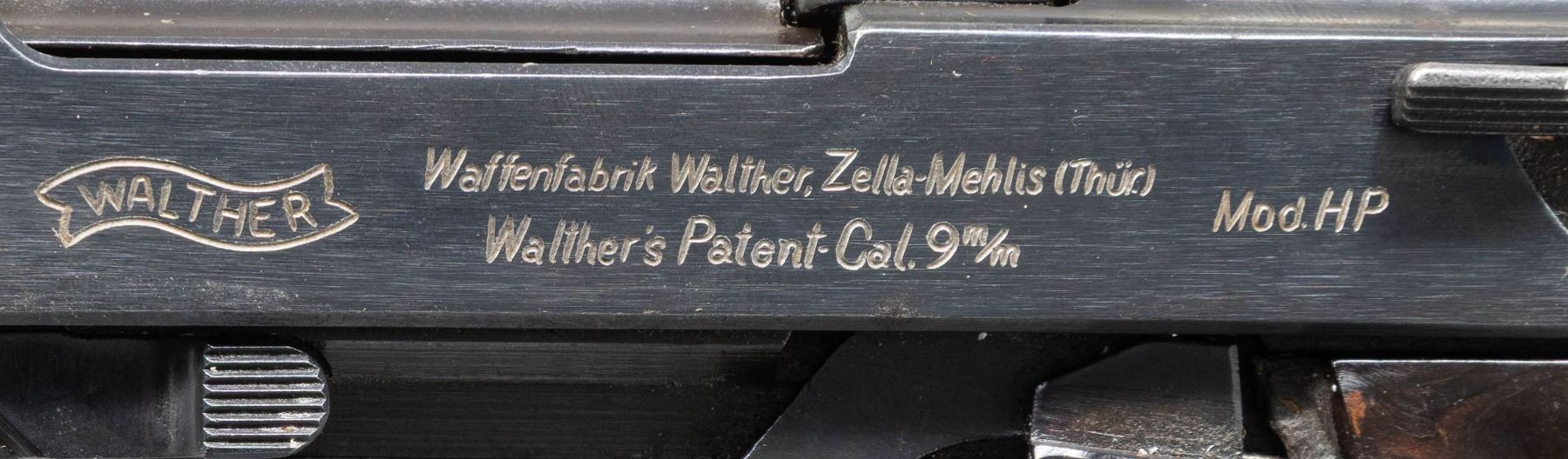 SEMI-AUTOMATIC PISTOL WITH HOLSTER. Cal. 9x19mm Parabellum. S# 4270. Bbl. 4 7/8". Model HP semi-automatic pistol mfg. by Walther and subsequently issued to the Austrian Bundeswehr after World War II. The left side of the slide is marked with a contemporarily engraved Walther banner logo, followed by markings denoting Walther's mfg. information, as well as the model and cal. designations. Left side of the frame is marked with an Austrian Bundeswehr "BH" proof, with the right side exhibiting the S#, followed by a German Eagle/N commercial nitro proof. Right side of the bbl. and locking block also exhibit an Eagle/N commercial nitro proof, with the slide's proof being absent. Underside of trigger guard exhibits a spuriously applied "KARL WOLFF SS". Underside of the bbl. is E.C.C.S.A. import marked. Metal components exhibit a reapplied blue finish overall. Frame is mounted with World War II production grooved mottled brown synthetic grips. All serialized parts are matching and include the frame, slide, bbl., and locking block. Heel mag. release is a checkered phosphate finished replacement. MAGS: 1 reblued likely Post-War 8-rd. mag. UNATTACHED ACCESSORIES: black leather holster, modified likely during the period with a black leather hanger and steel belt hook. Interior of closure flap exhibits a small pouch, for an unidentified tool. Rear of holster is marked with a "jwa" mfg. code, with the date obscured behind the hanger. CONDITION: metal components retain the majority of their reapplied blue finish, exhibiting some spots of light to mild wear and thinning, scattered superficial handling marks and spots of mild surface oxidation, and scattered spots of light pitting beneath the bluing overall. Bore is bright, as refinished, exhibiting consistent dark moderate pitting, while retaining good rifling throughout. Grips show some superficial marks from handling and storage, with the left grip exhibiting some chipping in the top left corner of the panel. Holster remains malleable, exhibiting wear and scattered superficial marks from handling and storage, as well as some spots of light age related cracking, but otherwise remaining sturdy and serviceable. (25-1432/MLW). CURIO. $500-1,000.