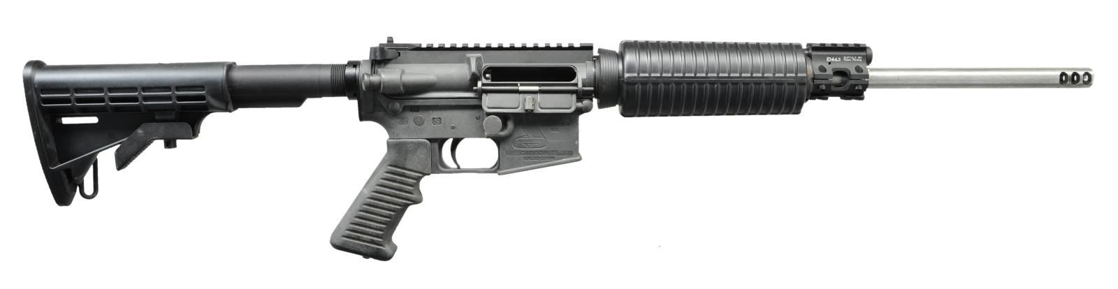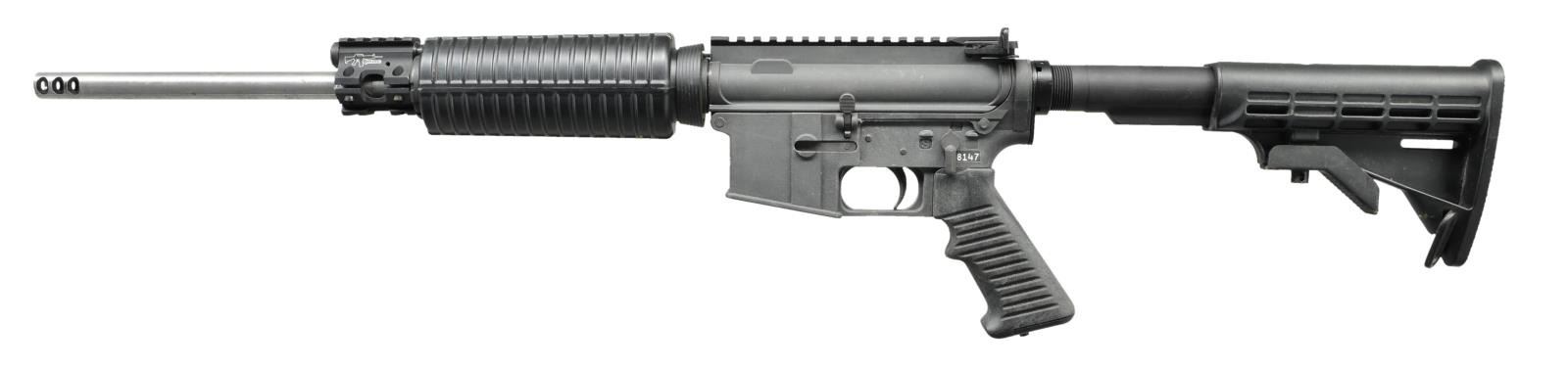 Cal. 5.56x45mm S# E28147 Bbl. 17" ported. A gently customized Carbon series of the AR-15 system by Bushmaster in Lake Havasu, AZ. CMMG K7-A4.2 piston system beneath 6" A2-style carbine handguards. Tapered delta ring. Carbon fiber flat-top upper receiver w/ brass deflector & round forward assist & carbon lower. Extended mag release. Extended charging handle release. 6-position collapsible plastic stock. Serrated pistol grip w/ storage compartment. CONDITION: Some light staining on barrel. CMMG piston kit is installed w/ aluminum gasket between gas block & barrel. Flat-top scope mount is an aluminum insert on carbon upper. Light patina around stock release bolt. Shiny bore w/ strong rifling. Fire control mechanism appears to function correctly when cycled by hand. (22-3290/JZ). MODERN. $600-1000