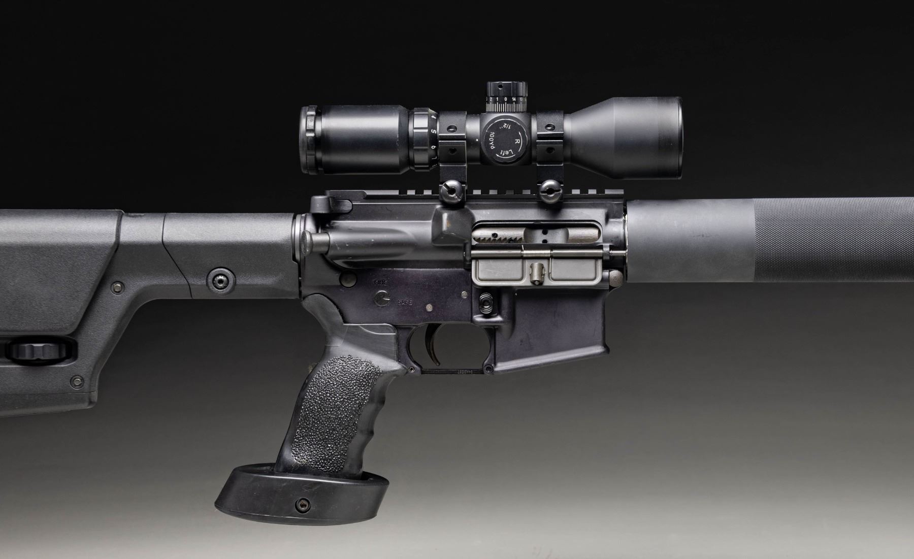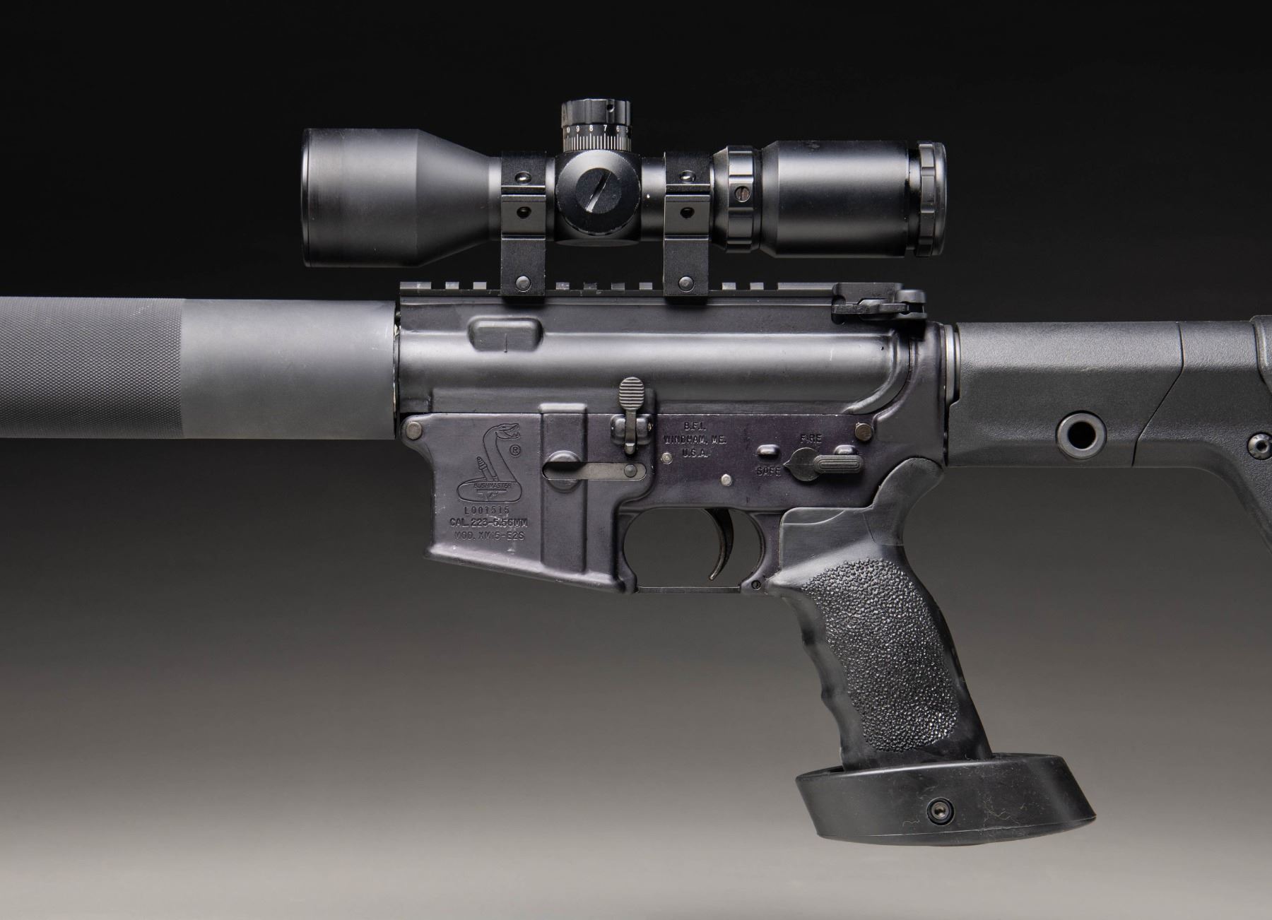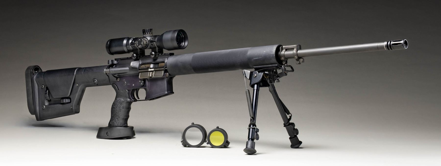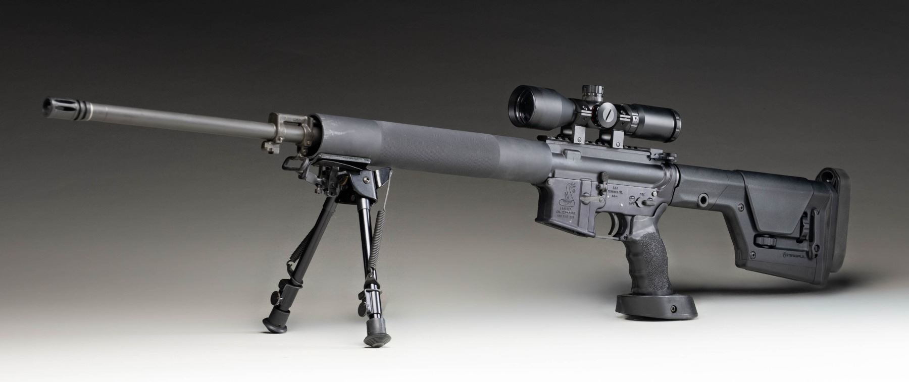 Cal. 5.56 NATO. S# L001515. Bbl. 24". 1:9 HBAR terminated w/ A2 flash hider. Low profile gas block / bayonet lug. Tubular 12.5" free floating handguard. Harris folding & extending bipod. Flat top upper receiver w/ round forward assist & brass deflector. Currently sporting unmarked 3x9 scope w/ illuminated reticle & target knobs. Target pistol grip. Magpul PRS Gen 3 adjustable shoulder stock. SP1 profile bolt carrier. Windham, Maine manufacture. CONDITION: Some light finish thinning, primarily on high spots & in areas of mechanical intervention. Optic glass clear w/ sharp reticle, appears to function as intended. Bright bore w/ strong rifling. Fire control mechanism appears to function correctly when cycled by hand. (25-5239/JZ). MODERN. $500-800.