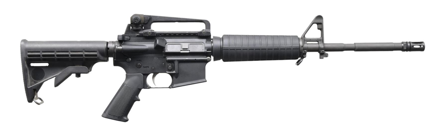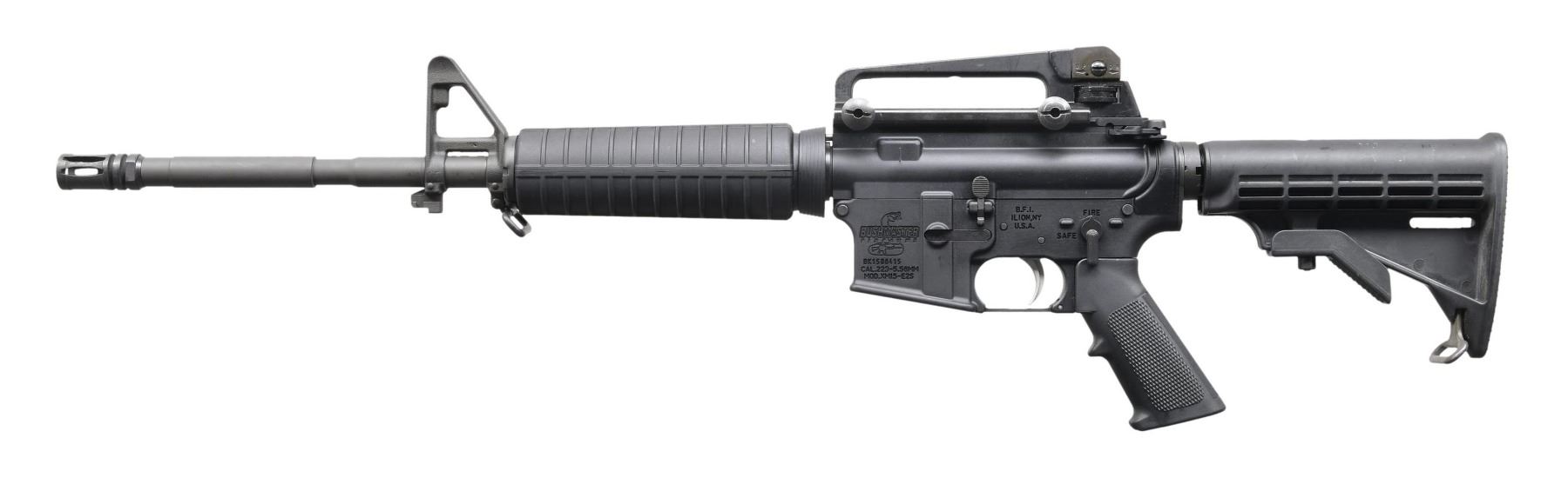 Cal. 5.56 NATO. S# BK1508415. Bbl. 16". Ilion NY Bushmaster rifle. Threaded, M4 profile 1:9 BFI barrel, currently sporting A2 style flash hider. Protected post front sight / gas block / bayonet lug. A2 style carbine round handguards retained w/ tapered Delta ring. Flat top upper receiver w/ round forward assist, brass deflector & removable carry handle w/ windage and elevation adjustable, dual aperture peep sight. Left side controls. 6 position collapsible shoulder stock. CONDITION: Finish complete & consistent w/ little sign of prior use aside from carry handle which illustrates some thinning on high spots. Bore is bright w/ strong rifling. Fire control mechanism appears to function correctly when cycled by hand. (24-5459/JZ). MODERN. $500-900.