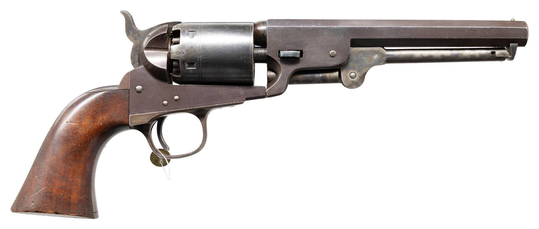 Cal. 36. S# 107133. Bbl. 6 1/2". Brass post front sight. Bbl. top marked "CAP SYSTEM MANUFACTURED BY C. CLEMENT". Belgian made Brevette copy of a Colt 1851 Navy. Cyl. lacks naval scenes but has varied crown proofs such as crown "A". Visible parts have matching numbers. Case colored hammer & ejector rod. Balance of metal has blue finish. Smooth walnut grips. CONDITION: grips show some dings, handling marks & staining. Case colored parts retain most of their case colors with scattered operational wear & moderate oxidation. Balance of metal has a gray appearance with scattered edge wear, handling marks, light oxidation & scratches. Action functions properly when hand cycled. Bore shows scattered pitting & oxidation along its length with evident rifling. (01-27901/MJC). ANTIQUE. $400-600.