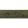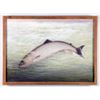 SALMON. Painting depicts a large salmon leaping with a hook in its mouth. The painting signed lower left "Myron Clark". Housed in a wood frame. SIZE: overall 26" x 19", sight 24" x 17 1/2". CONDITION: lightly soiled and with very small puncture lower left. (05-1104/JJ). $700-1,000.