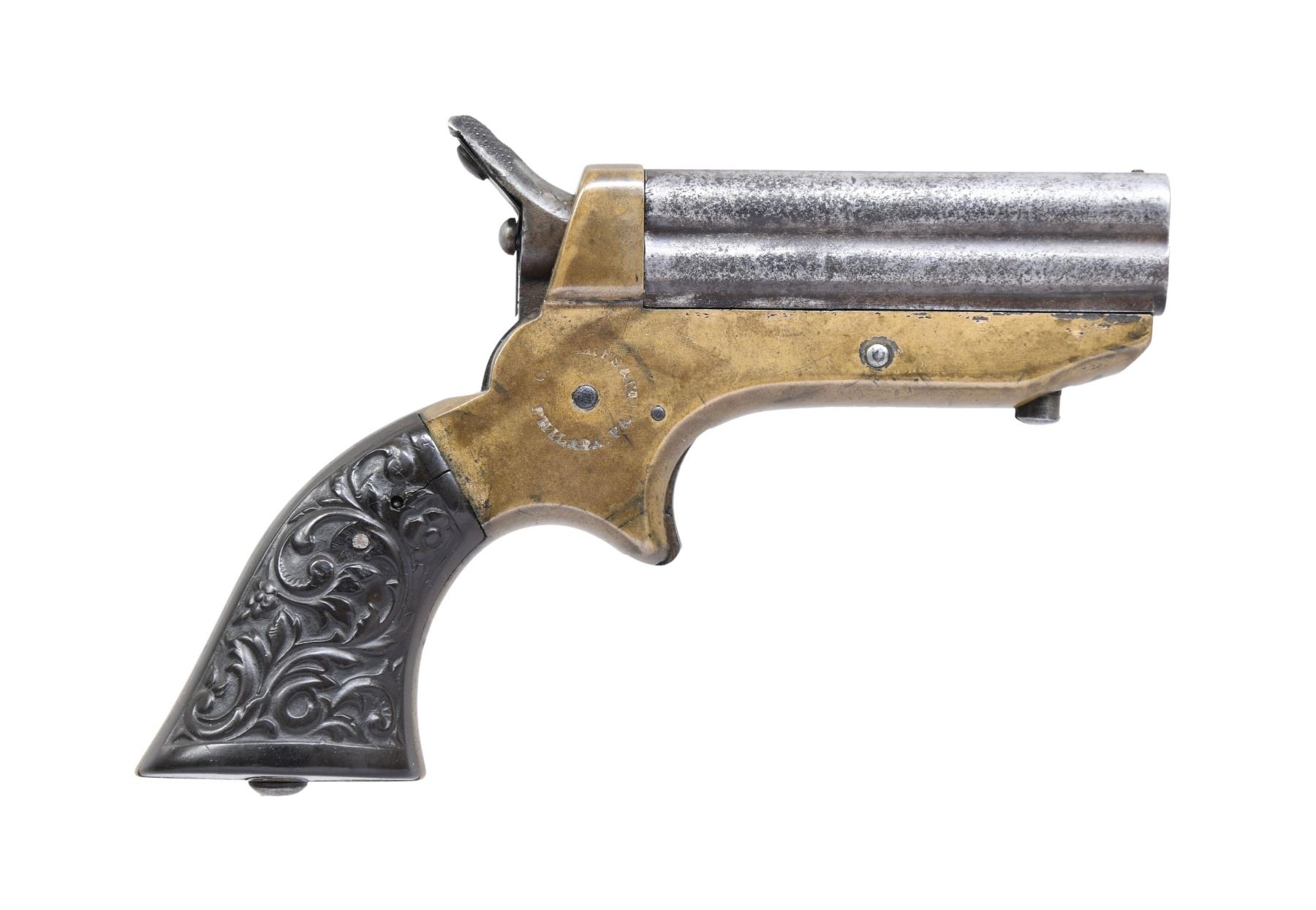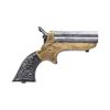 Cal. 22 RF. S# 58066. Mfg. 1859-1874. Matching numbered 2.5" four barrel cluster for brass bead front sight. Brass frame with spur trigger & rotating firing pin on hammer. Two piece Gutta Percha grips. CONDITION: Barrels are gray patina with traces of blue & areas of cleaned pitting. Brass has mustard patina with light marks. Right grip panel has crack with left panel appearing good. Pitted bores. (01-26529/MD). ANTIQUE. $400-600.