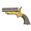 Cal. 30 RF. S# 15968. Bbls. 3" with matching number and brass bead sight. Mfg. 1859-1874; approx. 26,500 units (S#1-30000 and 1-5000). Medium brass frame having straight juncture of checkered gutta-percha grips to frame. CONDITION: good patina appearance to both brass and barrels; very good finish on blued trigger and hammer. Near excellent brown toned grips. Proper rotational functioning of firing pin. Fair bores with areas of scattered pitting. (01-22149/NW). ANTIQUE. $350-500.