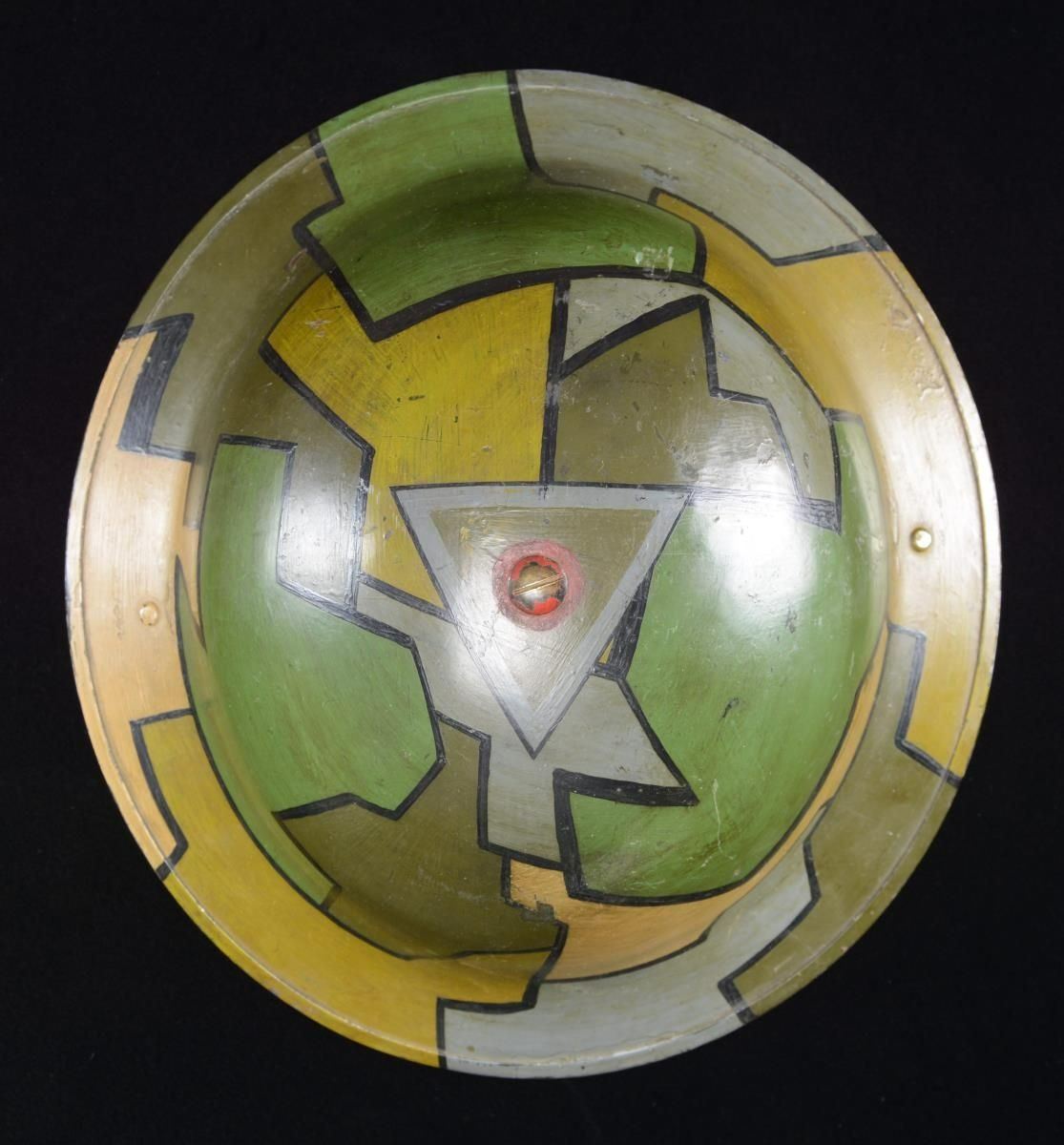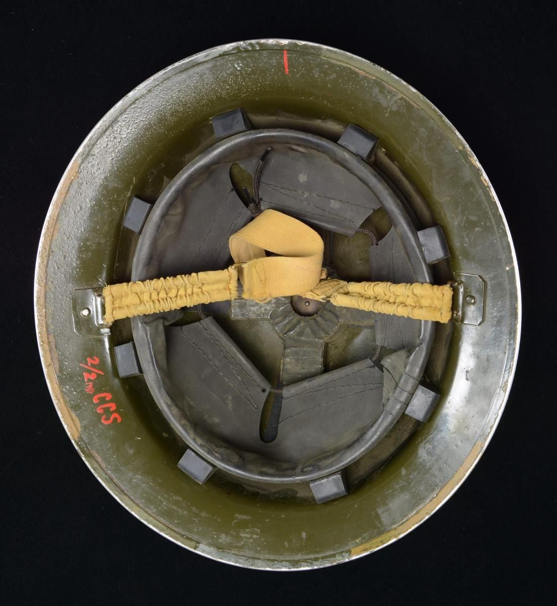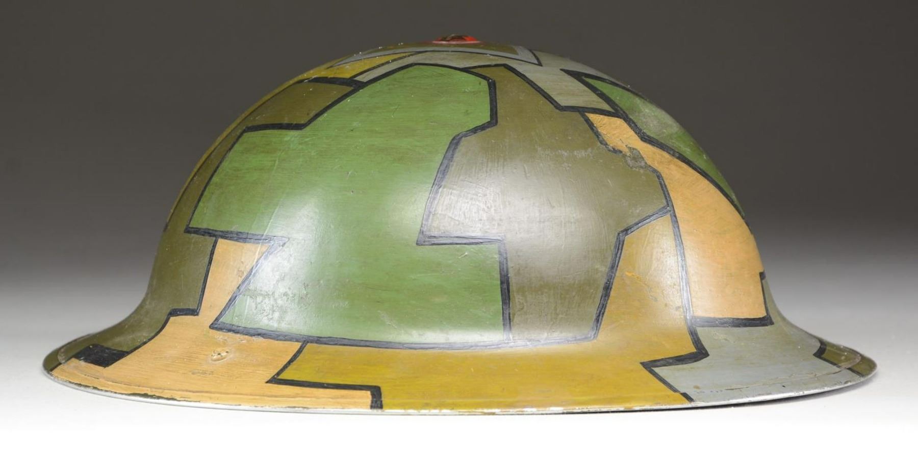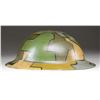 This helmet is of classic WWI “doughboy” style with a camouflage painted finish in green, brown, tan, mustard, & gray. There is a screw attachment at the crown of the helmet. The interior right side is painted “2/2 no CCS” in red paint. This is believed to stand for “Canadian Corps of Signals”. Rubberized liner & khaki cotton elastic chinstrap. UNATTACHED ACCESSORIES: a letter dated “October 13, 1993” identifying the helmet as possibly Canadian Corps of Signals. CONDITION: helmet finish is nearly 100%. Liner shows light wear. PROVENANCE: From the Lifelong Collection of Glen E. Mattox. (02-18921/BF). $200-400.