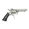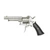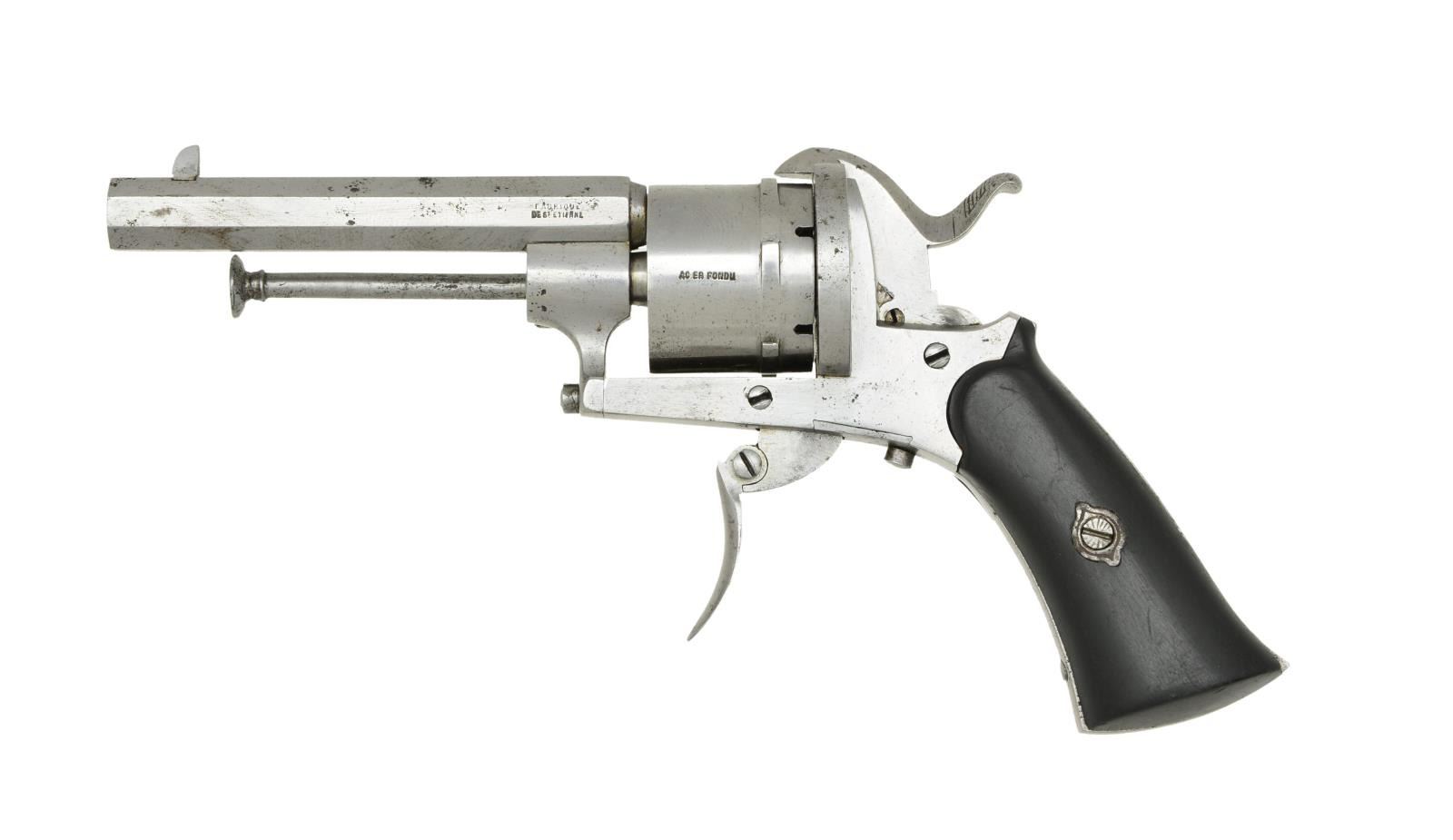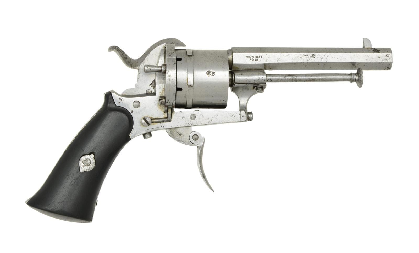 REVOLVER. Cal. 7.65 Pinfire. NSN. Bbl. 3 3/8" oct. w/ blade sight & right side ejector. Top flat has Canadian retailer marking "PAILLON A QUEBEC". Left bbl. flat has St. Etienne French mfg. markings. Right bbl. flat is marked "MOUVEMENT ACIER". Six shot rnd. cyl. w/ raised cyl. stops. Cyl. is marked "ACIER FONDU" (cast steel). Right side of recoil shield has swing out loading gate. Folding trigger. Two piece ebony square butt grips. CONDITION: metal is cleaned bright showing scattered spots of pitting. Grips show light wear. Sound action. Bore shows spots of light pitting & retains sound rifling. (01-20645/DS). ANTIQUE. $300-450.