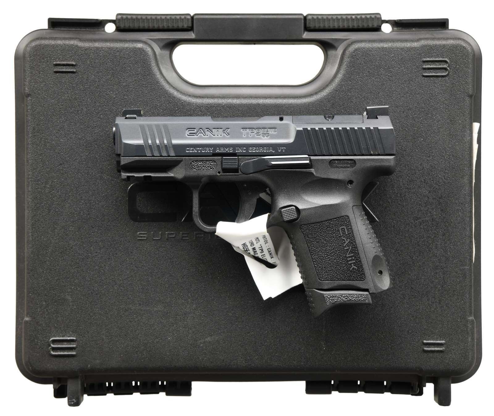 Cal. 9x19. S# 22CB03426. Bbl. 3 1/2". Yellow dot front sight. Fixed black rear sight. Slide cut for RMR plate. Black finish. Turkish made compact striker fired pistol imported by Century Arms. Importer hang tags present on trigger guard. MAGS: 1-12 rd. & 1-15 rd. UNATTACHED ACCESSORIES: factory hardcase matching numbered to gun w/ foam inserts, chamber flag, factory holster, trigger lock, spare backstrap, cleaning rod, manual, paperwork, bore brush, RMR plate, spare mag baseplate & small tool kit. . CONDITION: all aspects near excellent. PROVENANCE: The Collection of Gun Sport Ltd owned by Jon R. Thomas. PROVENANCE: The Collection of Gun Sport Ltd owned by Jon R. Thomas. (23-2815/MJC). MODERN. $300-500.