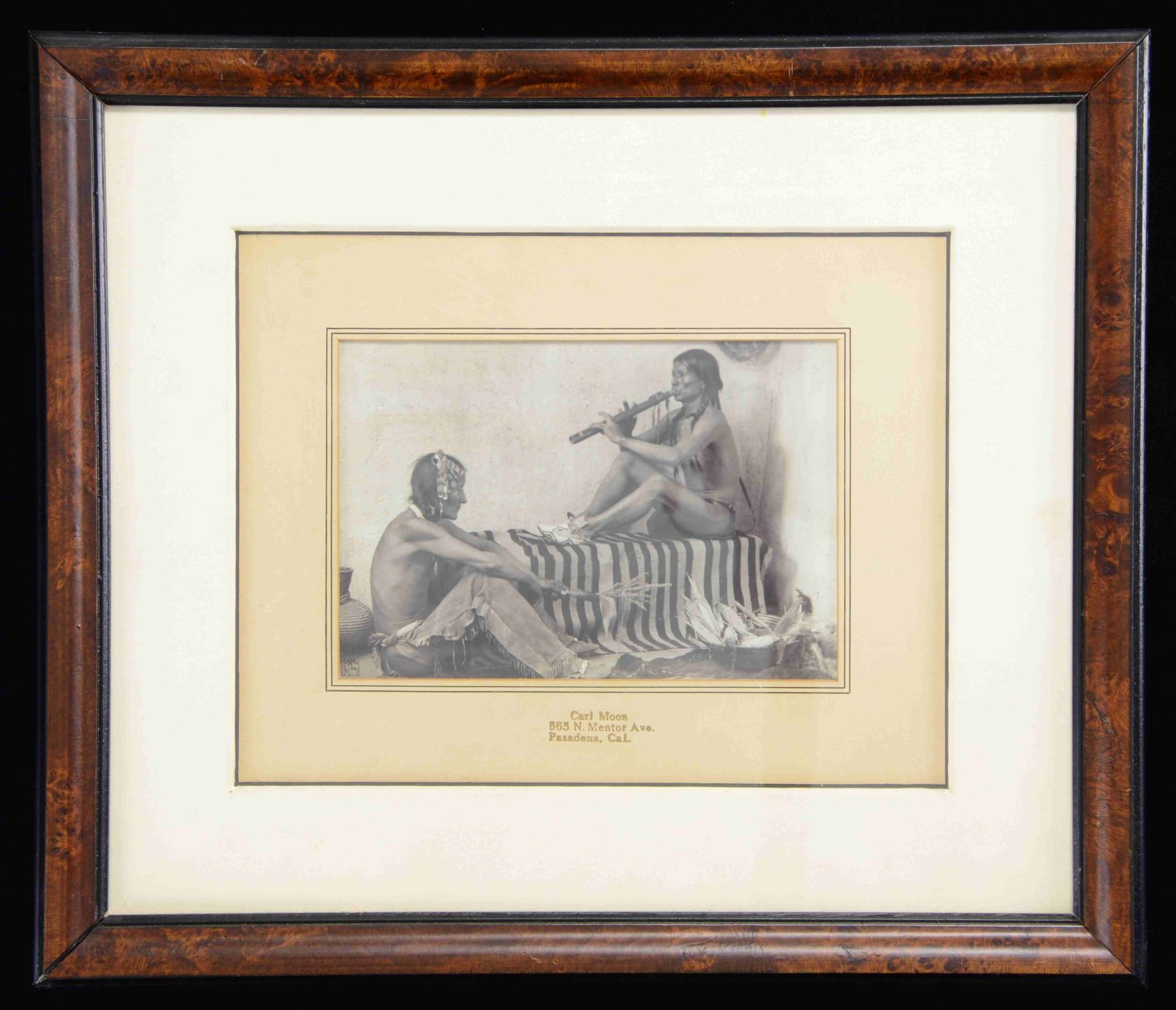 FLUTE. Framed 9" x 6" silver print photo on 12.5" x 10" mat embossed "CARL MOON / 565 N MENTOR AVE / PASADENA, CAL". "The Corn Song" Taos Indians taken during the fiesta of San Geronimo at the pueblo of Taos about 1912. UNATTACHED ACCESSORIES: descriptive sheet. CONDITION: appears fine, not removed from frame. PROVENANCE: Martin Lane Historic & Western Americana Lifetime Collection. (02-21583/JS). $400-600.