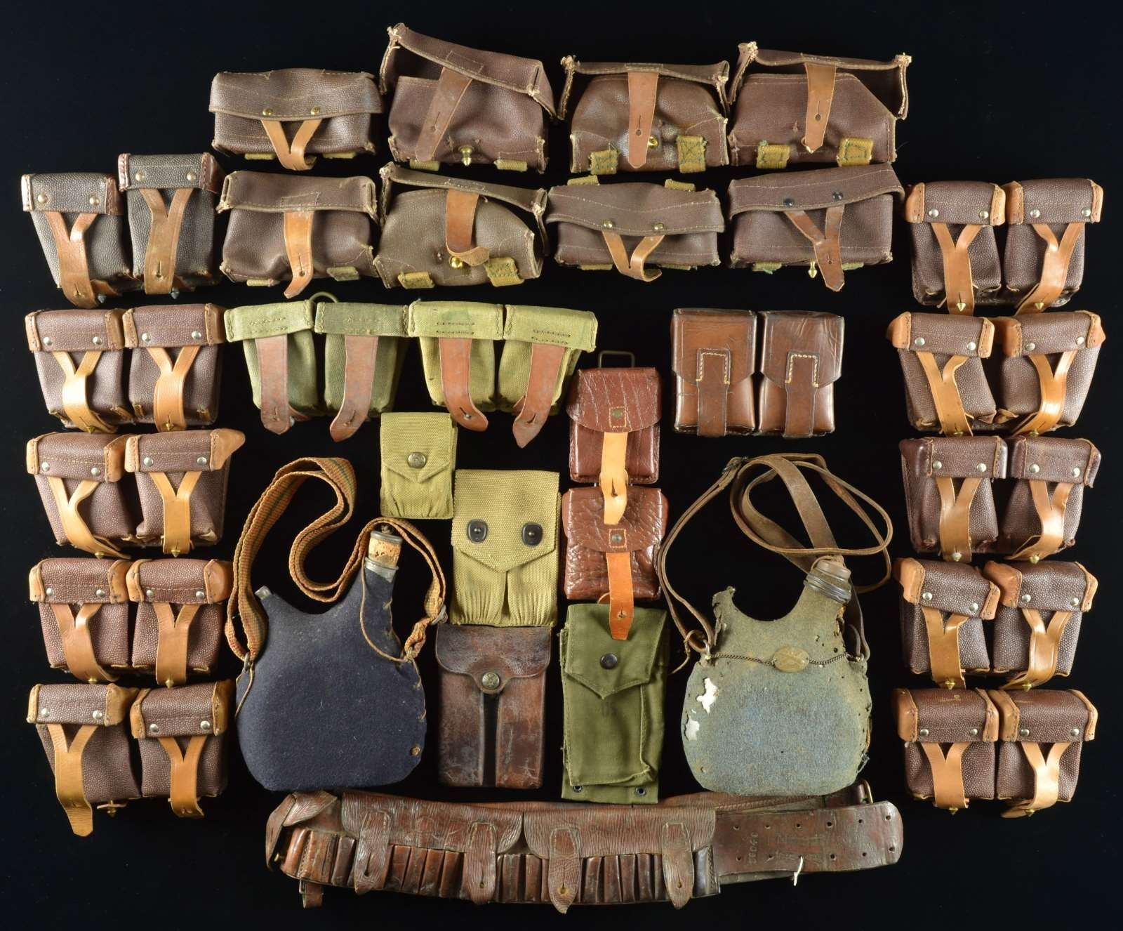 This lost consists of 10 Mosin-Nagant 2-pocket ammo pouches of tan leather and pebbled rubberized canvas. / 8 Chinese SKS ammo pouches. / 2 Mosin-Nagant 2-pcoket ammo pouches of tan leather and heavy green canvas. / 1 Yugoslavian Mauser M-48 ammo pouch. / 2 Single pocket Eastern European cartridge pouches of tan leather & brown patterned leather. / 2 Small WWI US canvas pouches likely for a compass. / 1 WWI US canvas clip pouch for a 45 auto. / 1 WWI US leather clip pouch for a 45 auto. / 1 US M-14 rifle cleaning kit pouch. / 1 WWI French canteen with separate vent or drinking spout. Canteen has a dark blue wool cover and a woven cotton sling. / 1 WWI French canteen with separate vent or drinking spout. Canteen has a light blue-gray wool cover and leather sling. There is an artillery medallion suspended between the strap rings. / 1 British pattern 1882 leather bandolier for carrying 50 rounds of 303 cal. ammunition. CONDITION: most cartridge pouches show light overall wear. Canteens show some insect damage to the covers. Bandolier shows expected wear but remains in quite serviceable condition. (02-16435-4/BF). $300-500.