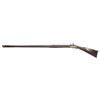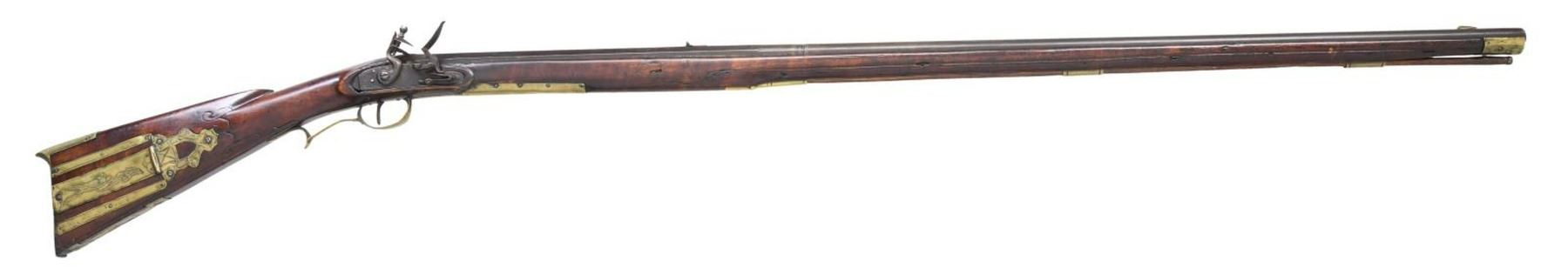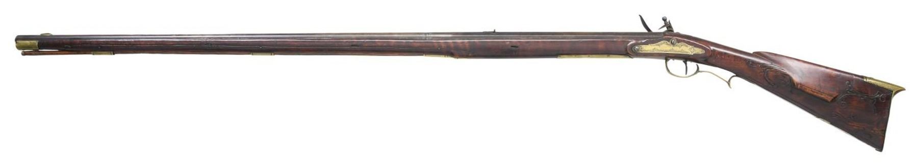 Cal 48. NSN. 60" overall, 44" octagon to round unsigned smooth bore barrel, fixed rear and inset brass front sights. Brass furniture, 4-piece pierced & engraved patch box, incised scroll carving forward of patch box and on either side of cheekpiece. CONDITION: good to very good overall, complete and original, original flintlock configuration, stock is sound, old refinish, inset repairs forward of lock, mechanics weak, no mainspring tension, dark clear bore. (01-24552/JS). ANTIQUE. $1,200-1,500.