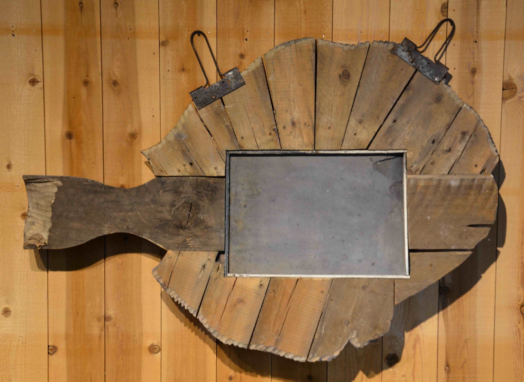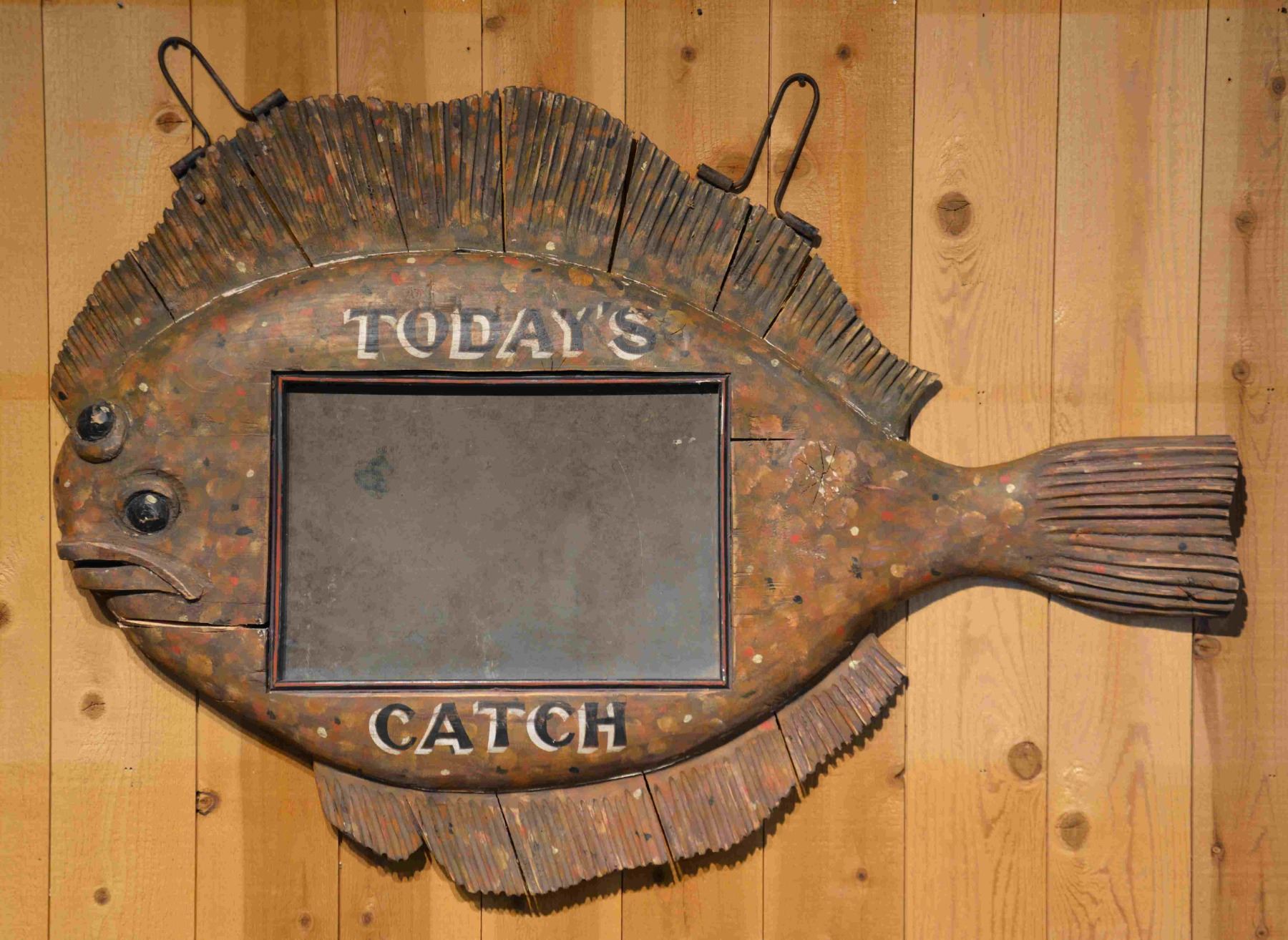 A unique painted and carved hanging pine sign with a slate insert at the center; "Today's Catch" frames the slate. The fish is nicely carved with detailed stylized fins, mouth, and protruding faceted eyes. The olive green surface is mottled with colorful daubs of paint. SIZE: 38" h x 54" l. CONDITION: surface with normal and expected weathering and wear. A shrinkage crack below the fish's mouth will need stabilizing. Otherwise good. (05-871/TG). $2,000-2,500.