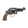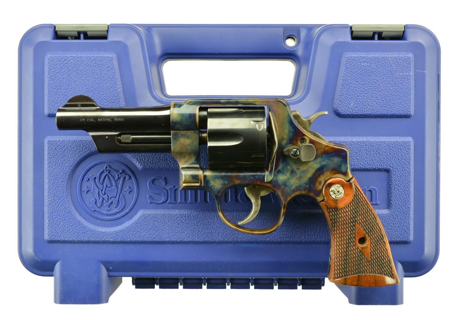 Cal.45 ACP S# DAZ7623. Bbl. 4" N Frame double action revolver. Blued barrel w/ case hardened frame. Round blade front sight w/ square notch rear sight. Checkered hammer spur. Blued, fluted cylinder. Checkered, single diamond service grips w/ S&W medallion. Barrel marked "45 CAL MODEL 1950" on left, & SMITH & WESSON" on right. UNATTACHED ACCESSORIES: Blue plastic, numbered factory hard case & paperwork. CONDITION: All aspects indicate as new. (22-2667/JZ). MODERN. $600-900