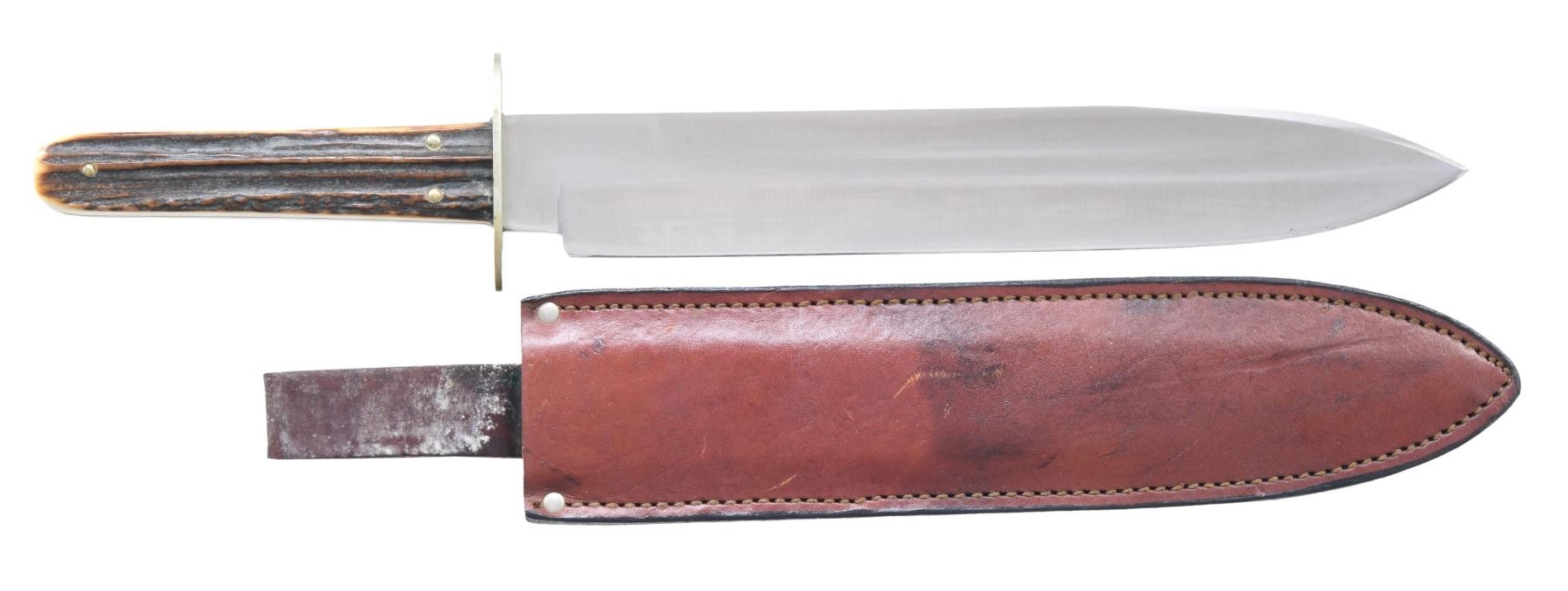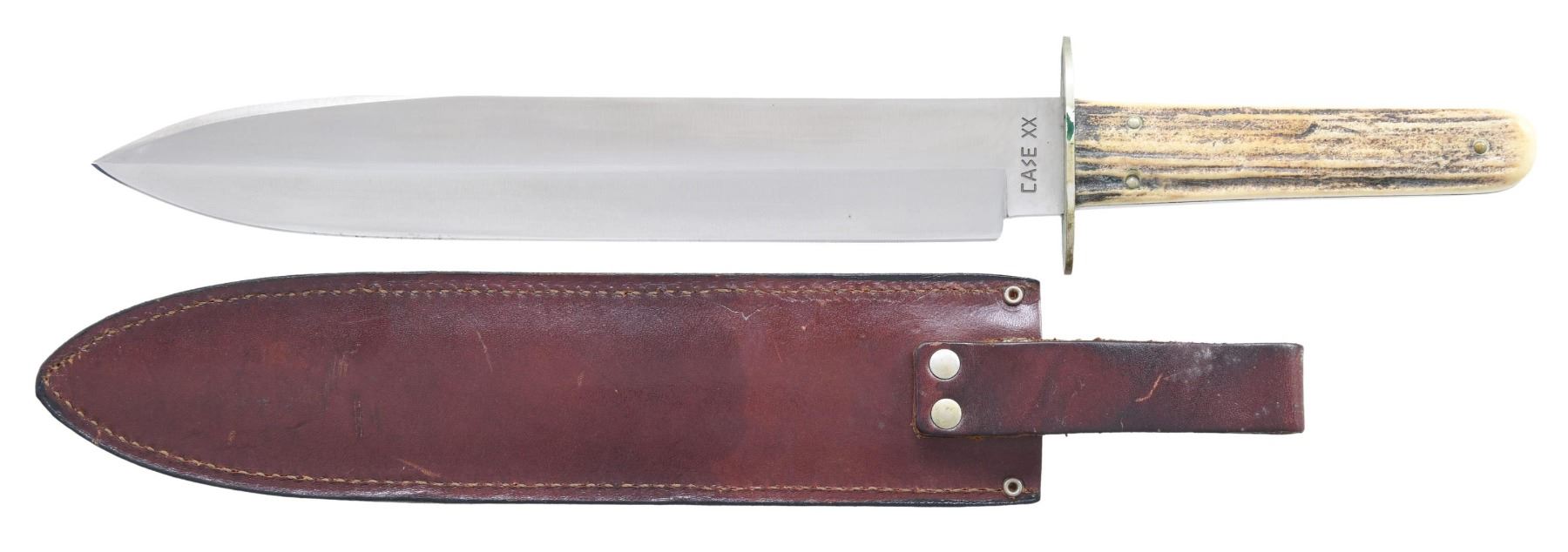 Overall length: 15". Blade 10" marked "CASE XX". German silver oval double hilt. Two piece stag panels with brass rivets. Brown leather sheath with belt loop. CONDITION: Blade has near excellent appearance with light tarnish. Hilt shows tarnish & verdigris deposits. Very good grips. Good intact sheath with mildew & wear. PROVENANCE: from the renowned collection of quality sporting arms from Lewis Drake together with inventory of Lewis Drake Associates. (02-23558/MD). $250-450.