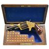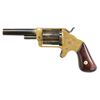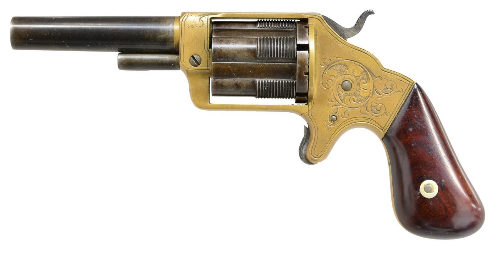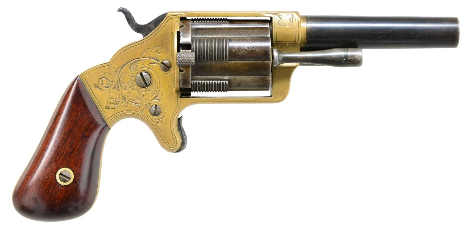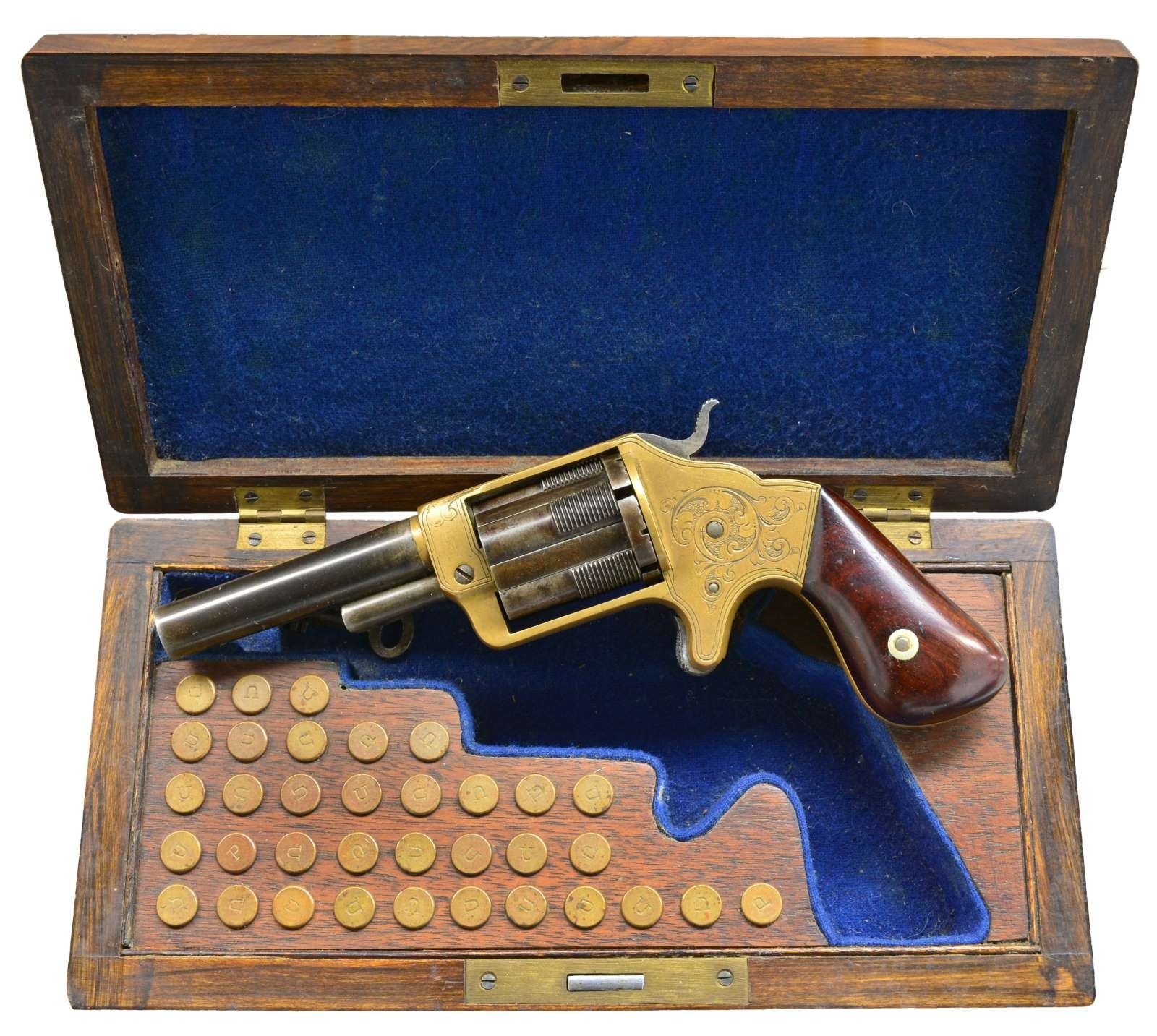 POCKET REVOLVER. Cal. 32 RF. S# 906. Standard production w/ sliding chambers marked "B. A. CO. PATENT APRIL 14TH 1863" on top of 3" rnd. bbl. Brass frame engraved w/ New York style lg. shaded scroll. Unique bag shaped 2 piece grips are of rosewood. UNATTACHED ACCESSORIES: walnut case, has German silver escutcheon on top & blue cloth lining. Bottom compartment is French fitted for revolver, 35 cartridges & original key. CONDITION: iron parts w/ old refinish, markings partially obscured, no silver on frame. Grips w/ old refinish. Mechanically good. Case w/ most of its finish. Interior cloth is good. PROVENANCE: The Estate Collection of Gary Parietti. (01-19786/MGM). ANTIQUE. $1,200-1,500.