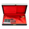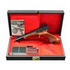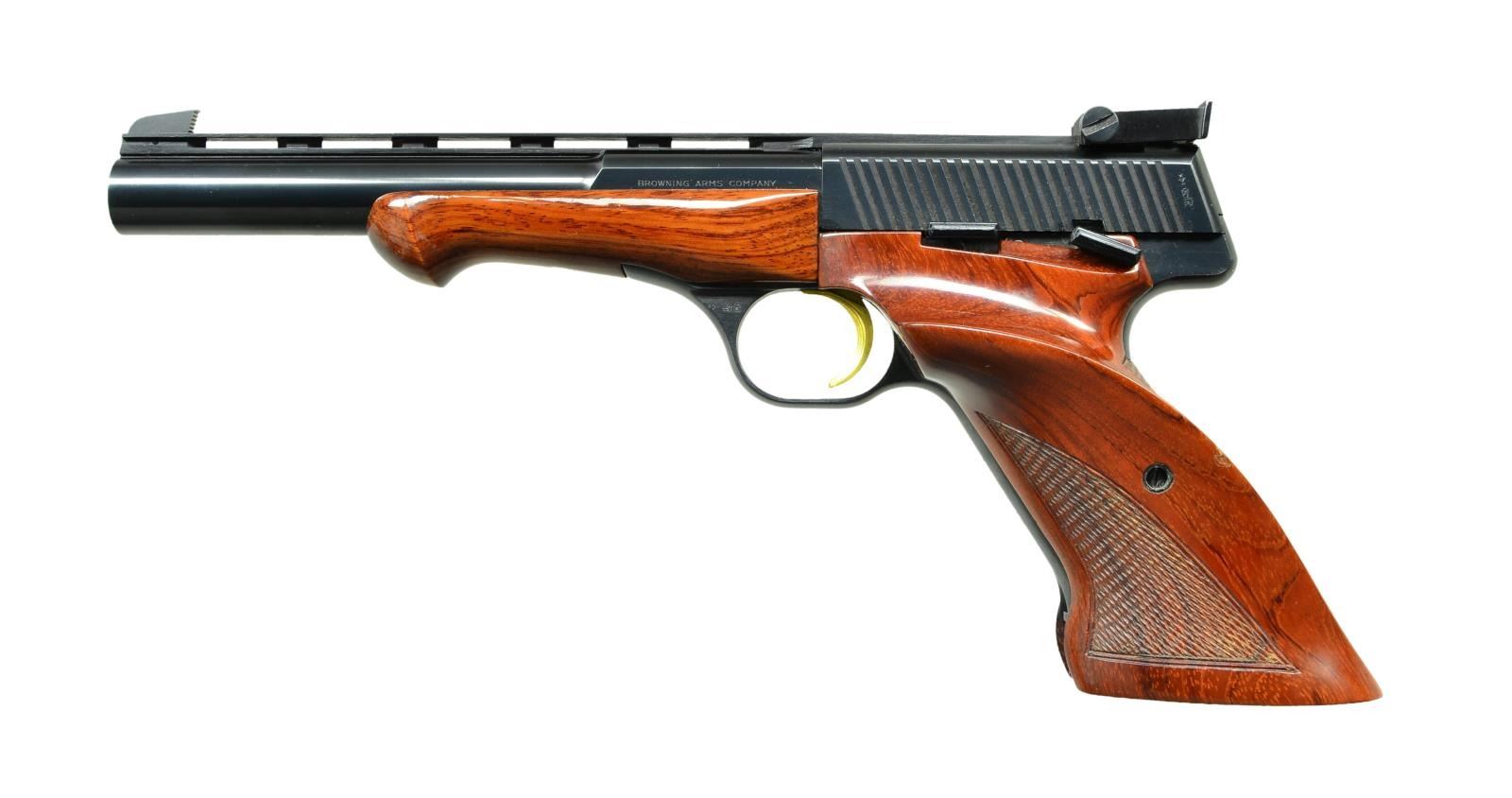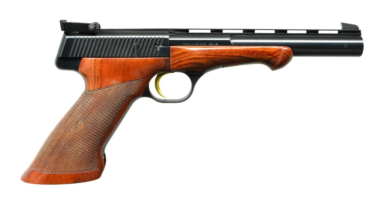 Cal. 22 LR. S# 100207T8. Bbl. 6 3/4" VR having grooved faced back cut front sight & target adjustable rear. Mfg. 1968 (1962-1976; 24,001 units - 3,039 in 1968) in Belgium by FN w/ reddish toned checkered target grip having RH thumb rest; smooth schnable tipped matching forend. Numerous Belgian proofs, gold trigger & provision for weights (w/ forend removed). MAGS: 2 factory 10 rd.; very good & near excellent. UNATTACHED ACCESSORIES: black leather grained factory case having brass plaque on lid & red felt compartmentalized interior containing factory accessories: cartridge block, 2 case keys, manual, screwdriver & 4 piece weight set. Very good exterior w/ faint edge scuffs; near excellent interior. CONDITION: couple of extremely faint marks on stock set w/ balance near excellent including bore.(22-6421/NW). CURIO. $1,000-1,500.