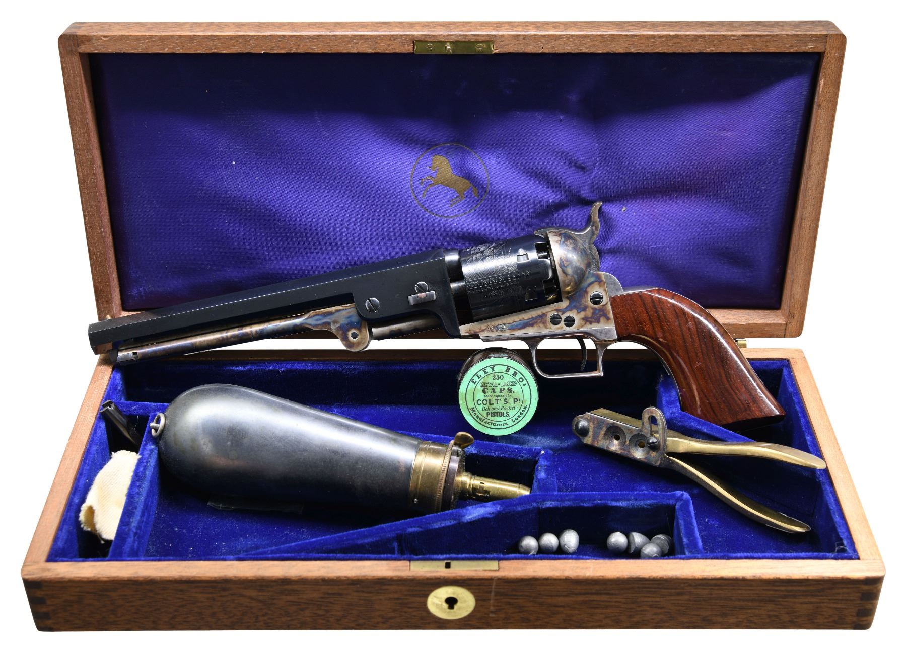 Cal. 36. S# 14892. Bbl. 7.5" octagonal with cone front sight & hammer notch rear. 6 Shot cyl. has roll stamped Naval scene. Case hardened frame, hammer & loading lever. Bright royal blue finished Bbl., cyl & screws. Silver plated trigger guard & square back grip frame. 1 Piece walnut grip. UNATTACHED ACCESSORIES: compartmentalized Walnut Colt display case with lined with blue velour. Interior of lid lined with purple fabric bearing gold Rampant Colt logo. Lid has inlaid "COLT" medallion. Case contains "COLT'S NAVY FLASK" marked powder flask, brass 2 cavity bullet mold for conical bullets & round balls, nipple wrench/combination tool and "ELEY BROS COLT'S PT" cap tin. CONDITION: metal components near, excellent; appears unfired. Silver is beginning to darken with age. Grips have very few scattered light handling marks. Crisp, shiny bore. Very good to near excellent case, exterior shows a few light handling marks. Interior is complete and in very good condition. (01-26589/BH). $500-800.