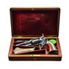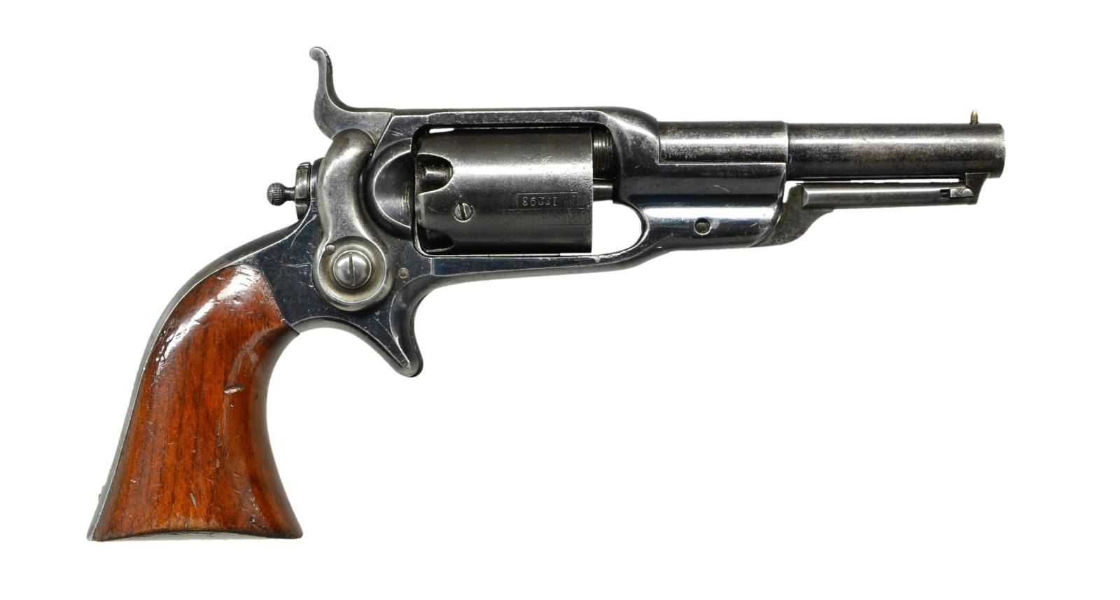 REVOLVER. Cal. 31. S# 13293. Bbl. 3 1/2” w/ New York address. Brass bead sight. Round five shot cyl. w/ stagecoach scene roll engraving. Blue finish w/ case colored hammer. 1 piece walnut grip. Mfg. 1856. UNATTACHED ACCESSORIES: period casing w/ red cloth fitted interior. Interior shows moderate wear. Lid has brass shield engraved w/ initials “WAB”. Case contains an ornate pocket size powder flask, 2 cavity mold, wrench & cap tin. CONDITION: very fine. 70% lightly faded blue showing carry wear. Cyl. has weak scene. Hammer retains traces of case colors. Wood has worn finish w/ numerous marks & small dents. Sound action. Bore retains sound rifling. (01-22858/JB). ANTIQUE. $2,500-4,000.