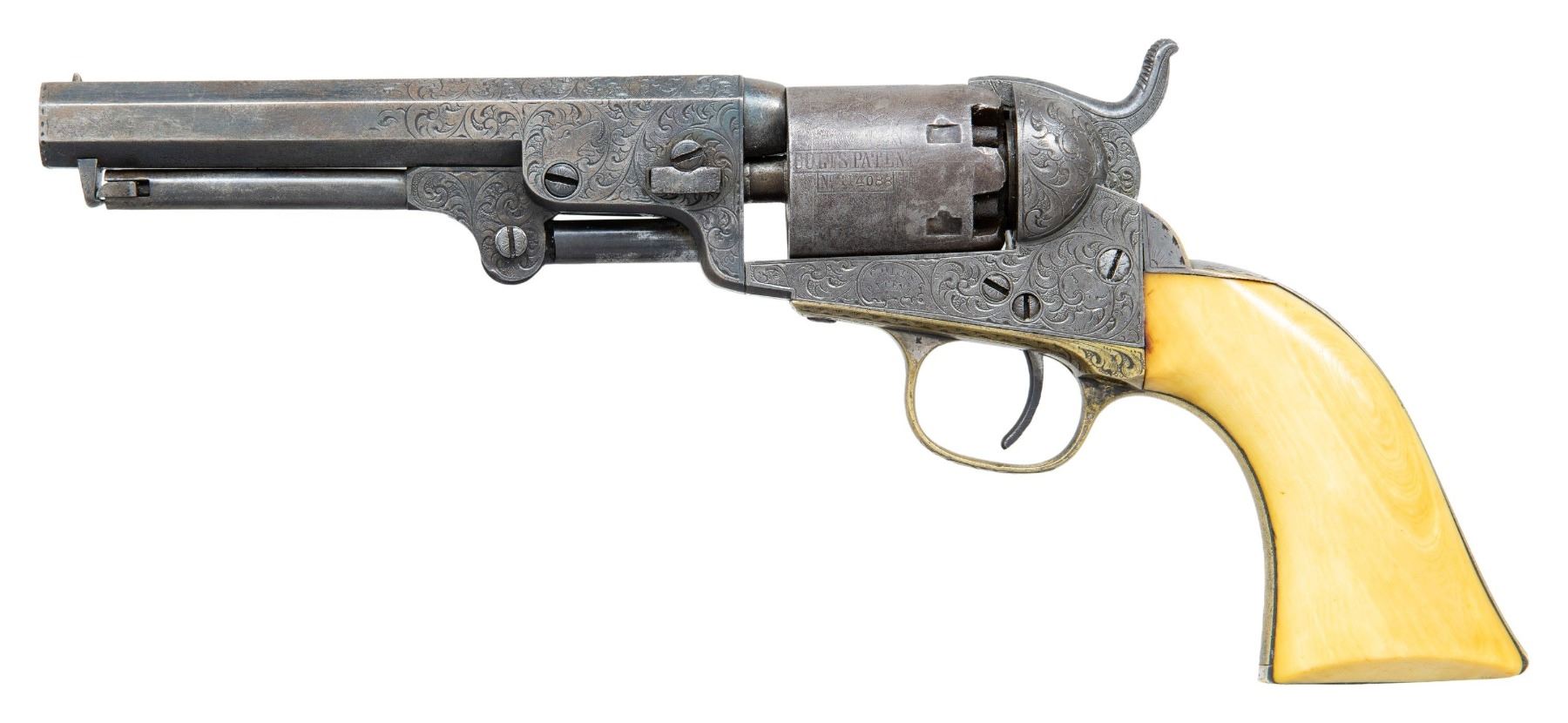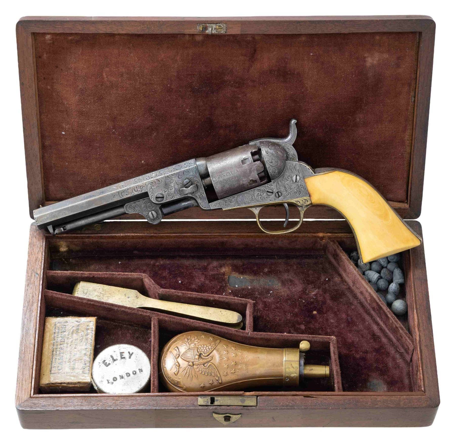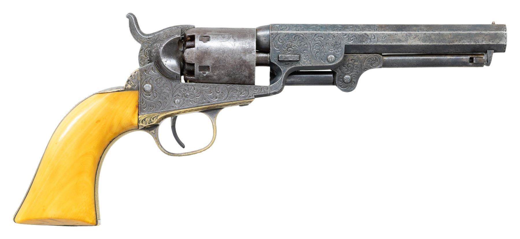 REVOLVER, IVORY GRIPS. Cal. 31. S# 114088. Standard configuration 5" octagonal barrel engraved: "SAML COLT". "COLTS PATENT" engraved in arc on frame, full coverage engraving of Gustav Young shop, scrolls terminating in flowers and hound's head on left barrel lug, well patinaed factory ivory smooth ivory grips. Housed in red velvet lined mahogany casing fit for COLTS PATENT eagle & stars flask, 2-cavity COLTS PATENT brass mold, embossed ELY cap tin, unopened pack of cartridges, and loose balls. CONDITION: very good overall, about 10% thinning reapplied blue on barrel, half of reapplied silver plate remains, discernible stagecoach holdup scene on cylinder, markings & engraving good, mechanics good, crisp rifled bore. Well fit smooth ivory grips. Casing is very good, components good to very good. (01-28153/JS). ANTIQUE. $3,000-5,000.