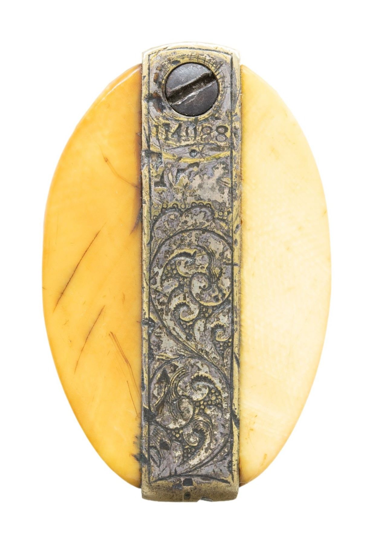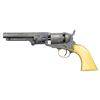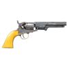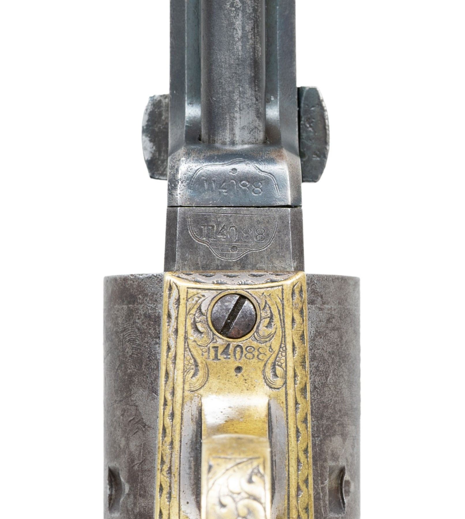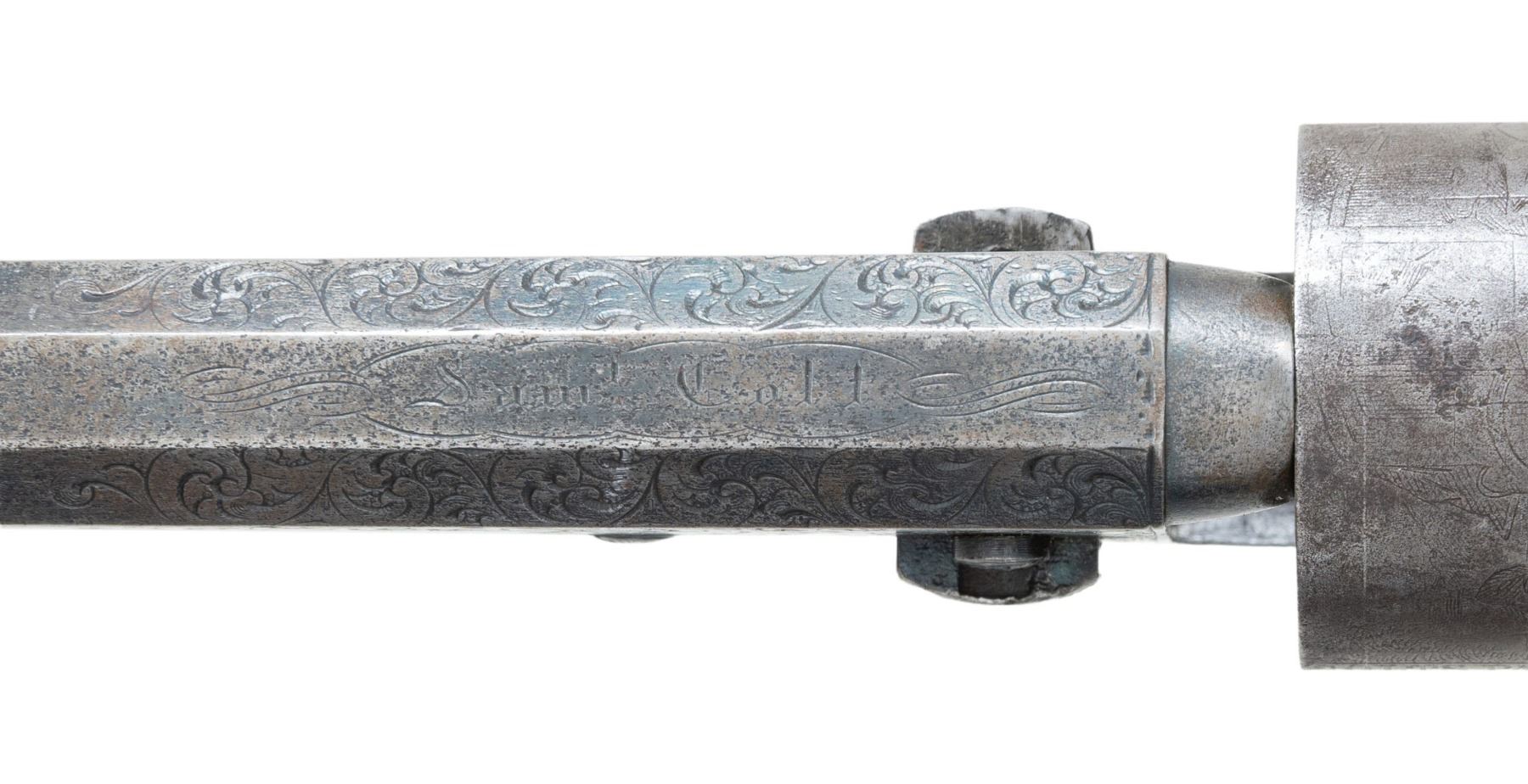 REVOLVER, IVORY GRIPS. Cal. 31. S# 114088. Standard configuration 5" octagonal barrel engraved: "SAML COLT". "COLTS PATENT" engraved in arc on frame, full coverage engraving of Gustav Young shop, scrolls terminating in flowers and hound's head on left barrel lug, well patinaed factory ivory smooth ivory grips. Housed in red velvet lined mahogany casing fit for COLTS PATENT eagle & stars flask, 2-cavity COLTS PATENT brass mold, embossed ELY cap tin, unopened pack of cartridges, and loose balls. CONDITION: very good overall, about 10% thinning reapplied blue on barrel, half of reapplied silver plate remains, discernible stagecoach holdup scene on cylinder, markings & engraving good, mechanics good, crisp rifled bore. Well fit smooth ivory grips. Casing is very good, components good to very good. (01-28153/JS). ANTIQUE. $3,000-5,000.