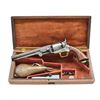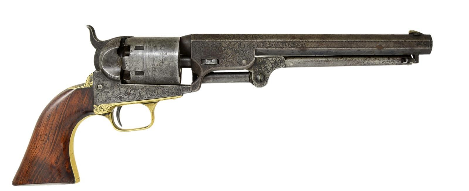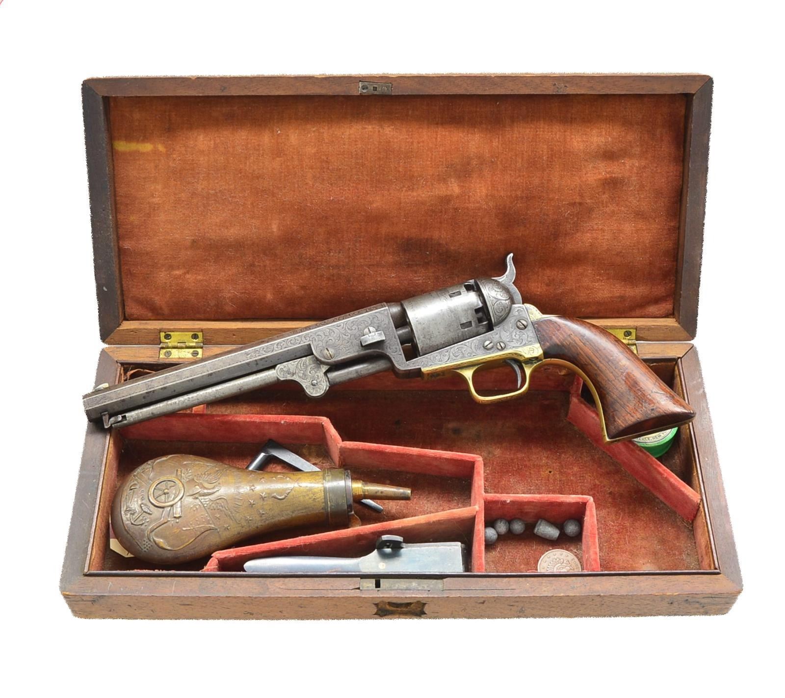 REVOLVER. Cal. 36. S# 2045. Bbl. 7 1/2" oct., marked "METROPOLITAN ARMS CO. NEW YORK" on top flat. Blued cyl. has Battle of New Orleans 1862 scene. Frame & grip straps unmarked. All numbers match. Revolver engraved in classic Young style shaded lg. scroll, sides of hammer w/ wolf's head. Grips are 1 piece rosewood. UNATTACHED ACCESSORIES: revolver is housed in a Mahogany case lined in red velvet & contains 6 1/2" brass bodied cannon & eagle flask w/ angled spout, combination tool, unmarked blued iron bullet mold & green pasteboard box for Goldmark percussion caps. CONDITION: bbl. w/ perhaps 20% original blue on bottom is mostly gray brown patina. Scant traces of case color are on gray brown frame. Brass grip straps are lightly worn. Grips considerably worn have possible old refinish. Fair to good bore, pitted. Mechanically good, bbl. loose on frame. Exterior of case w/ considerable dark stains & marks, cracks in top & has escutcheon missing. Faded interior cloth is good. Accessories good to fine. PROVENANCE: The Estate Collection of Gary Parietti. (01-19793/MGM). ANTIQUE. $2,000-3,000.
