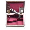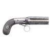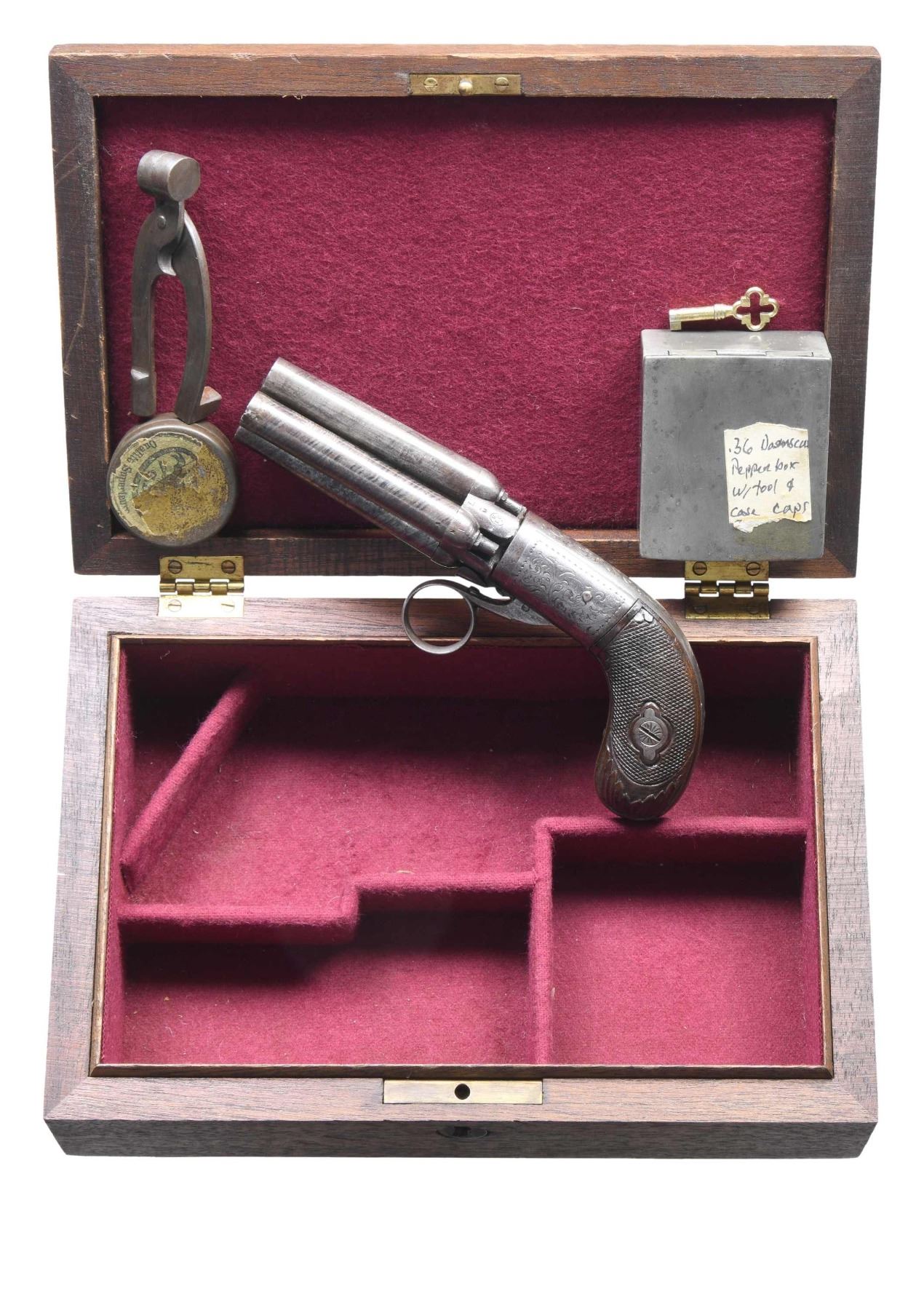 6.5" overall, four 2.75" screw-in damascene barrels, ring trigger, carved bag grips, modern casing is fitted for pistol and an old scarce mold/nipple wrench/barrel wrench combination tool, & cap tins. CONDITION: good very good overall, gray metal. Mechanics need attention, cocking moves cylinder but not far enough to engage hammer. (01-26621/JS). ANTIQUE. $300-500.