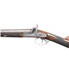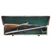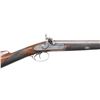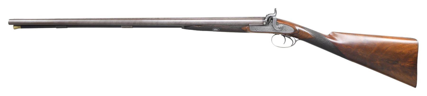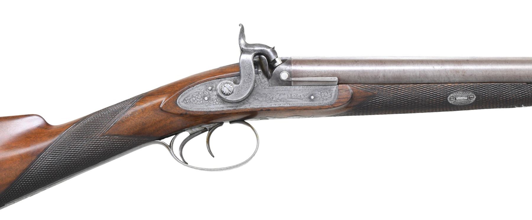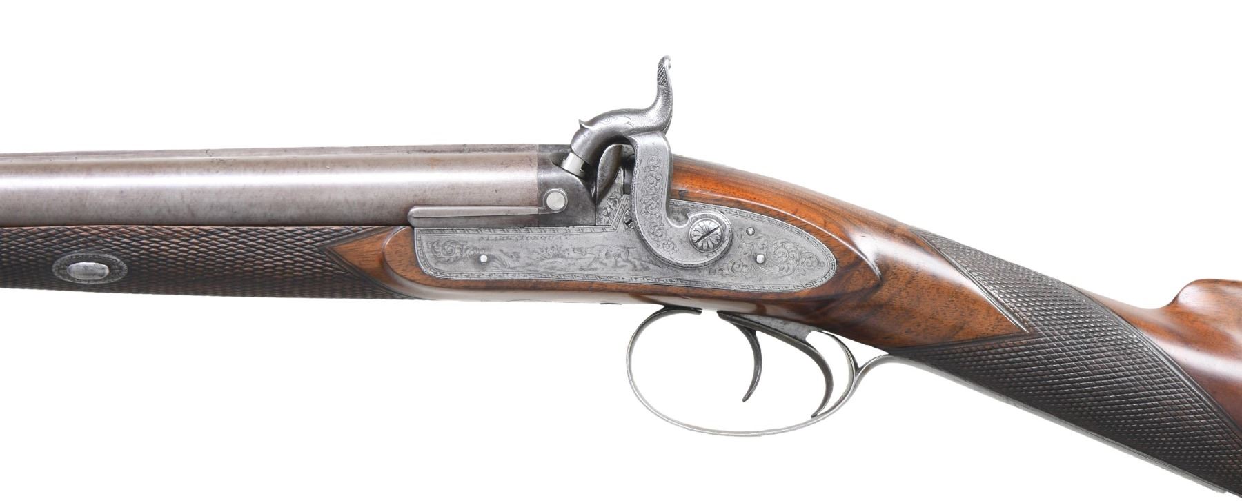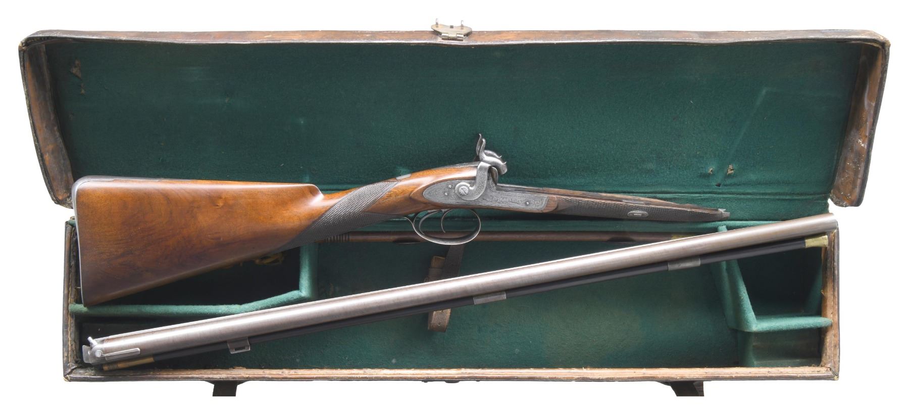 PERCUSSION SHOTGUN. Cal. 16 Bore. NSN. The 29 3/8" barrels have brass bead; chokes measure approx. IC & Cyl. Breeches have modern nipples. Locks have floral scroll engraving, "STARK TORQUAY" & field hunting scenes on locks. Wedge fastened walnut stock with steel spear tip finial thimble, wrap around checkering at wrist, & German silver wrist plate. LOP: 13.5" to buttplate. Spear tip finial triggerguard has engraved field hunting scene on bow, & floral scroll engraving at top of tang. Brass tipped ebony ramrod. UNATTACHED ACCESSORIES: brown leather luggage case has magic marker " ROBERT STARK / #5 CRESTON BC". Green cloth interior contains 2 piece cleaning rod & key. Case in fair condition with 1 broken leather strap & separation of lid corners. CONDITION: Barrels have faded brown finish mixed with spots of patina & marks. Locks & triggerguard have gray patina appearance. Lightly sanded & refinished wood shows light marks, repair chip & missing piece of wood along left barrel channel of forearm. Dark pitted bores. Both locks appear functional when cycled by hand. PROVENANCE: from the renowned collection of quality sporting arms from Lewis Drake together with inventory of Lewis Drake Associates. (01-26143/MD). ANTIQUE. $500-1,000.