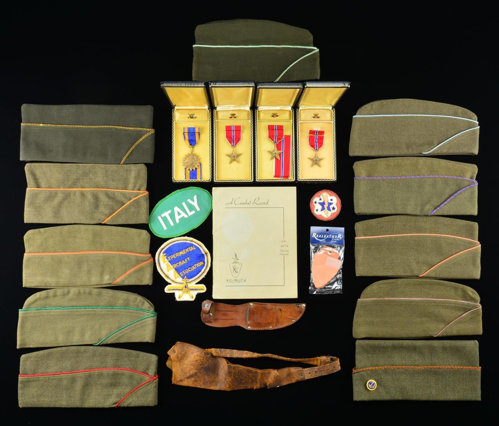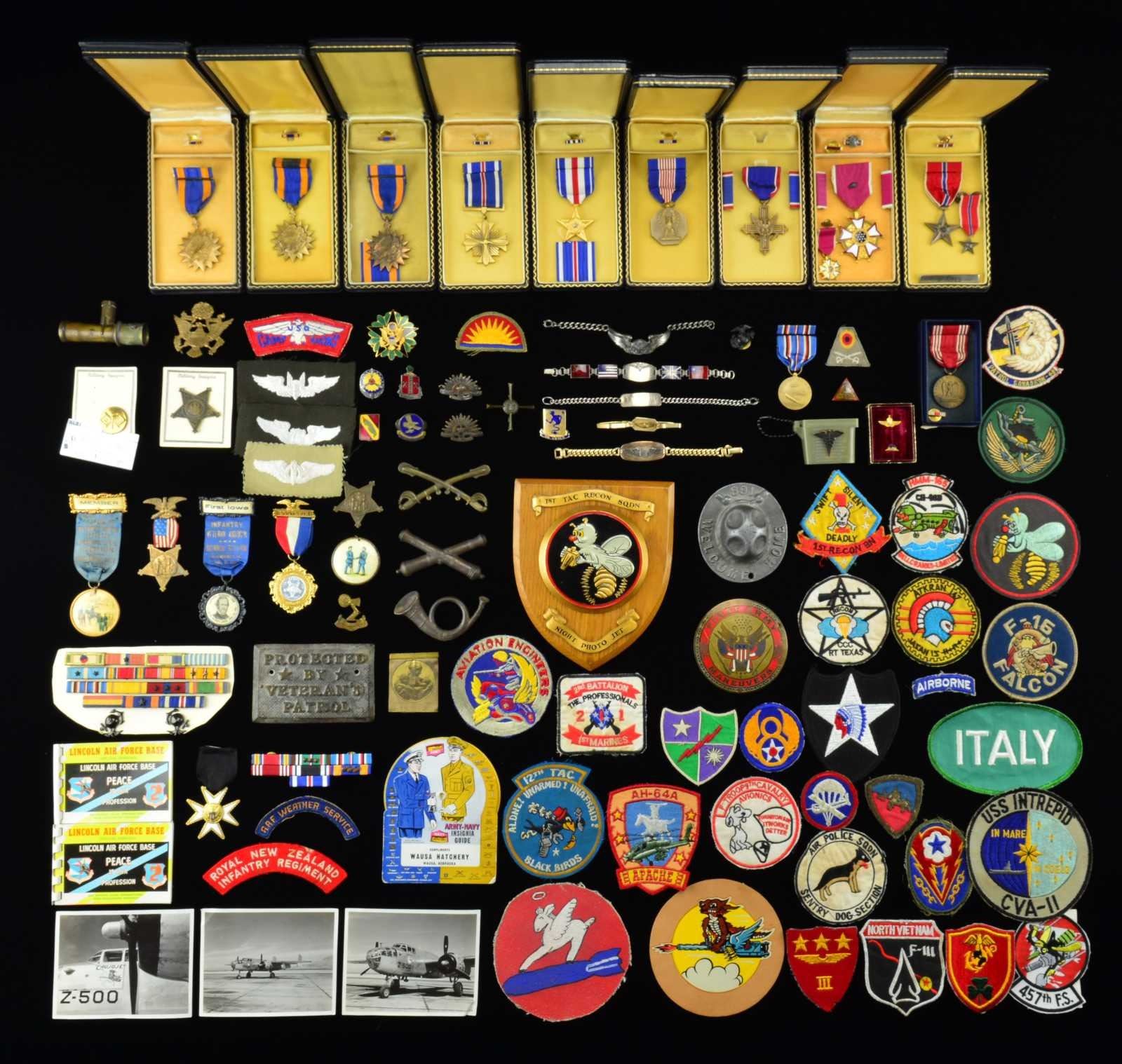 VARIOUS MILITARIA. This lg. and varied group includes 14 cased medals including Silver Star, Distinguished Service Cross, Legion of Merit, Distinguished Flying Cross, Air medal, Bronze Star & more. / 11 Army Overseas caps. / 1 Leather knife sheath. / 1 Worn holster. / 1 Compass pouch. / 1 1st TAC RECON SQDN wall plaque. / 1 GAR medal & 1 planchet for a GAR medal. / 3 Restruck Civil War hat insignia. / 4 GAR Reunion souvenir medals. / 1 Cast aluminum 3 1/4” campaign hat that reads “WELCOME HOME 168”. / A sm. book titled “ A Combat Record of the 407th Infantry Regiment”. / 36 Various military patches from different branches. / 3 WWII nose-art photos. / 1 GAR Mourning medal. / 1- 7-Award ribbon bar. / Lincoln Air Force Base booklet. / A First Army Maneuvers license plate tag. / 1 Brass plaque that reads “Protected by Veterans Patrol”. / 1- 15 award ribbon bar for a Marine. / A bag of approx. 25 various military insignia, patches, medals & related items. CONDITION: nearly all items show light wear w/ no damage & appear fully functional. PROVENANCE: Collection of Brian C. Pinkerton. (02-15439-2/BF). $600-800.