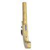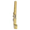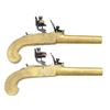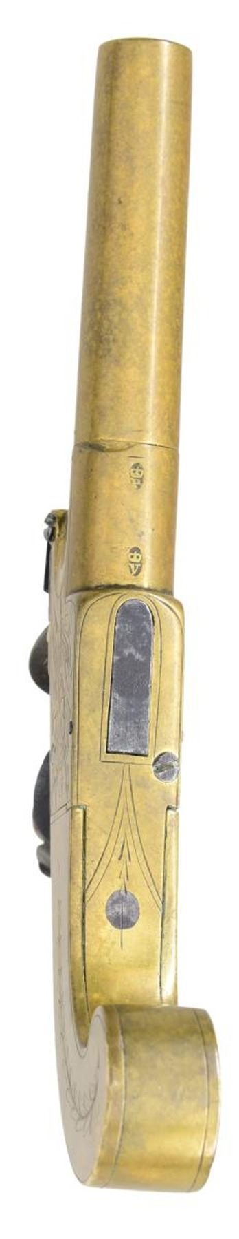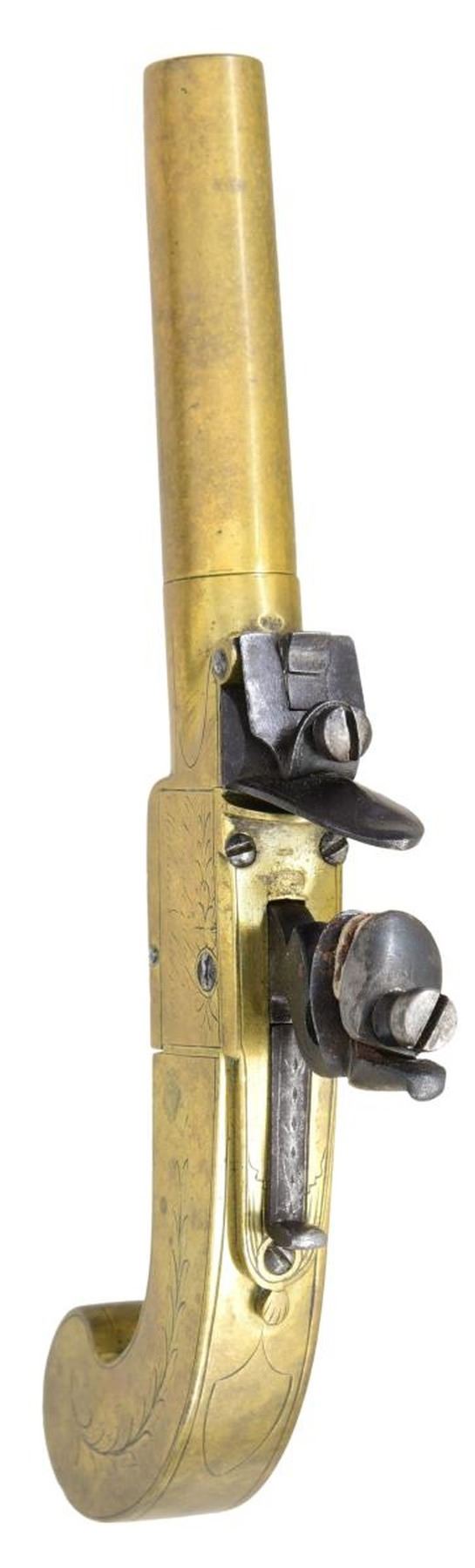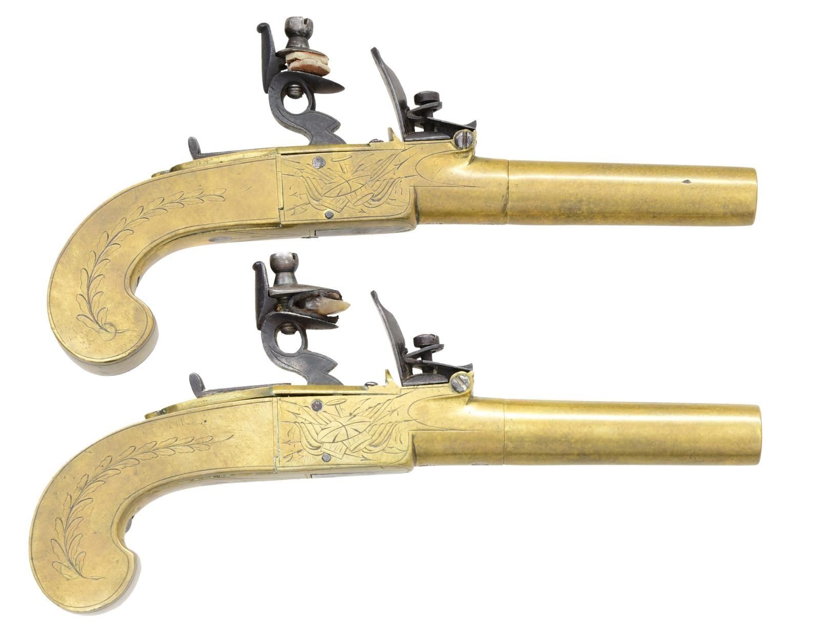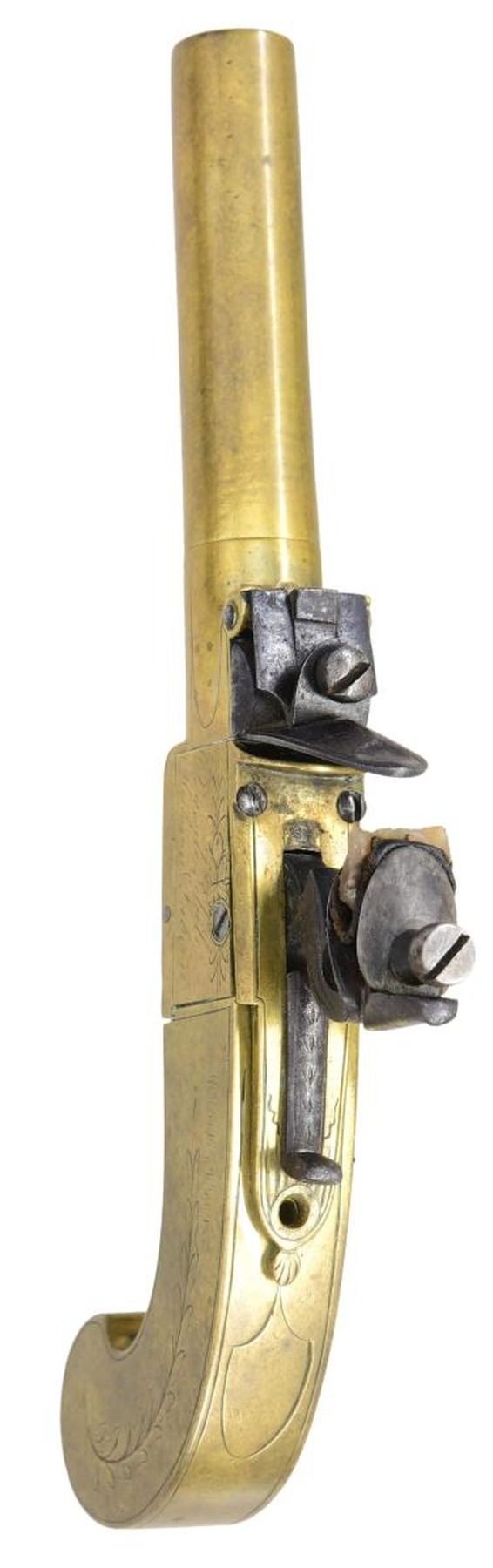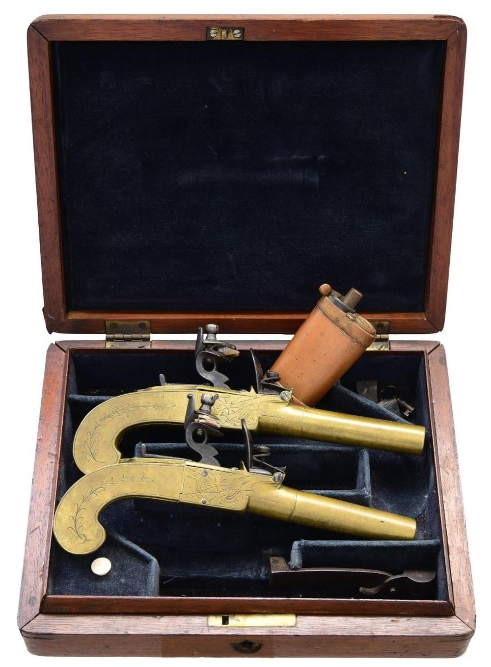 FLINTLOCK POCKET PISTOLS BY DUNDERDALE MABSON & LABRON. Cal. 42. S# NSN. This partnership was at 25 Russell Street, Birmingham, between 1807 and 1821. These unusual all-brass pistols have 2-1/2" screw-off barrels. London-proofed brass boxlock frames have steel-reinforced cocks, sliding safetys, folding triggers, and frizzens with external springs. Pistols are engraved with the maker's name on the left side under some foliate engraving. The right sides are engraved with panoplay of flags, drums, and shields. Foliate engraving is on curved, flat-sided brass grips. UNATTACHED ACCESSORIES: pistols are housed in what appears to be their original mahogany case with an inlet shield on top. The case is lined in blue velvet and contains an iron bullet mold that casts a.47 caliber ball, brass, and copper three-compartment flask. A covered compartment contains some balls. An open compartment holds a flint, a leather pad for the jaw, and what appears to be the original key held in place by some tows. CONDITION: good. Pistols show old cleaning and polishing, with some softening around edges and engraving. They are currently toned to golden mustard. Steel parts have a dark brown patina. One pistol shows upward bending of the top plate with the rear screw missing. The other will not hold at full cock. Safety is operable. Triggers extend when brought to full cock. Bores are dark but smooth. The exterior of the case shows some added oil. Key escutcheon missing. Interior cloth is good with compressions. Accessories are good. (01-24340/MGM). ANTIQUE. $3,000-5,000.