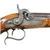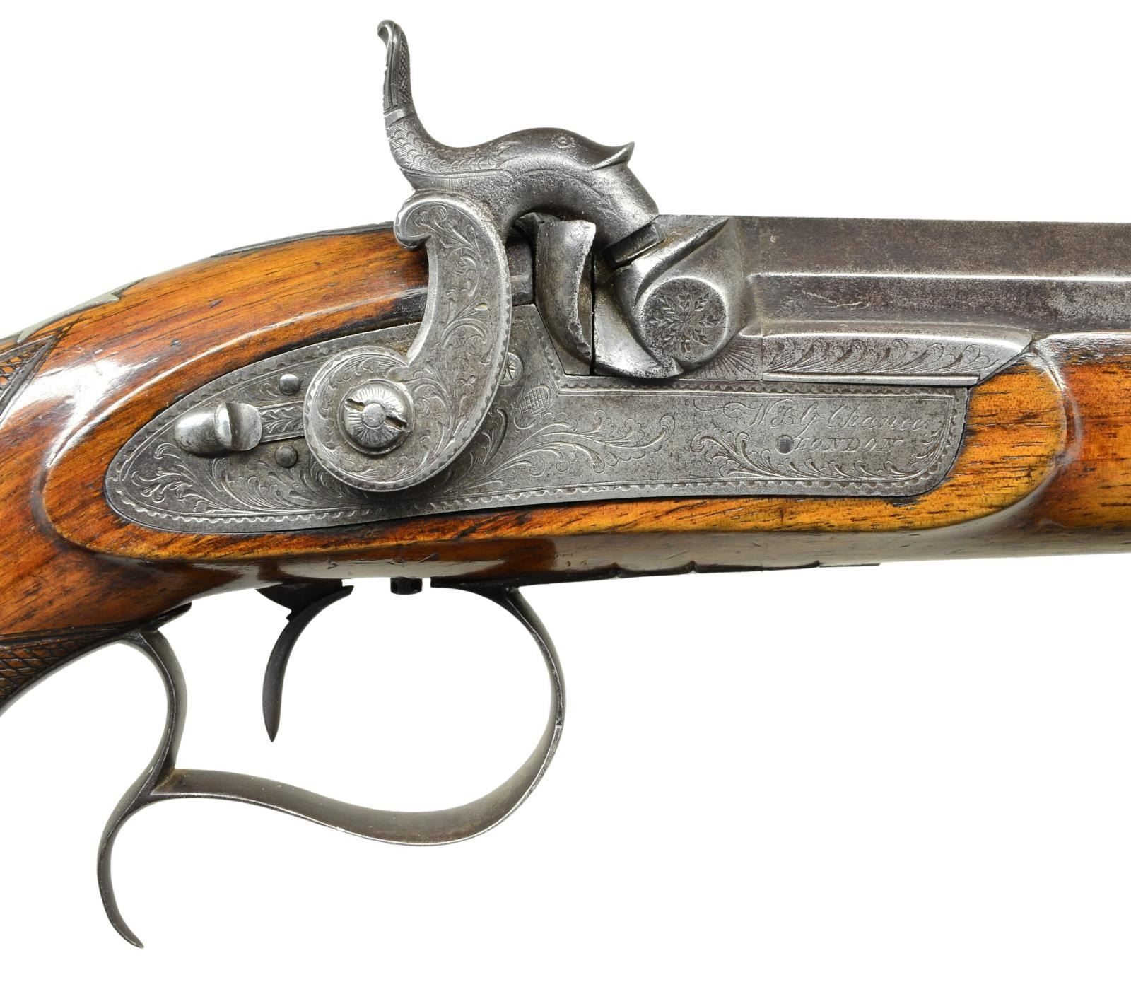 PISTOLS IMPORTED BY EYLAND & HAYDEN MADE BY W. & G. CHANCE OF LONDON. Cal. 52. S# 130 (bottom of both barrels). W. Chance worked between 1830-60. These anti-bellum pistols are engraved "Imported By Eyland & Hayden Charleston S. C." in script on top flats of 10" octagonal barrels with under ribs. Bottom of barrels are stamped with Birmingham black powder proofs "RH" and S# "130". Scroll engraved breech plugs do not have blow outs. Breech irons engraved with semi-relief shaded scroll have integral "U" notch rear sights. Front spring locks with flat faced hammers and back sliding safetys are also scroll engraved. "W & G Chance" "LONDON" is at the front of each lockplate. Triggers are set. Stocks with checkered bag grips have steel trigger guards with finger spurs. German silver mounts include nose caps, thimbles, sidebolt escutcheons and vacant shaped ovals at tops of grips. Ebony ramrods with German silver tips are held by plain pipes. UNATTACHED ACCESSORIES: guns are housed in their possibly original mahogany case with dual hook closure. A shaped brass medallion on top is engraved "WE". Case is lined in scarlet velvet and contains ebony and brass loading rod, steel nutcracker ball mould, and a copper bodied three compartment powder, ball and cap flask. There are two covered compartments with bone knobs, one contains some cast balls. CONDITION: good. Iron parts show light cleaning to gray brown patina over considerable pitting. Engraving remains clear. Stocks retain most of what appears to be their original varnish finish with added oil and a myriad of knocks, dings scratches and bumps. Bores are dark, locks triggers and safetys all work. Case retains what appears to be most of its original exterior finish. Interior cloth is good with bumps and rubs. Accessories are good. PROVENANCE: William Orbello Collection of Dueling Pistols; Collection of John Montague; James D. Julia Auction Fall 2014 Lot 3378. (01-22819/MGM). ANTIQUE. $4,000-6,000.