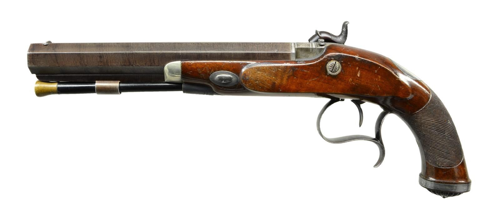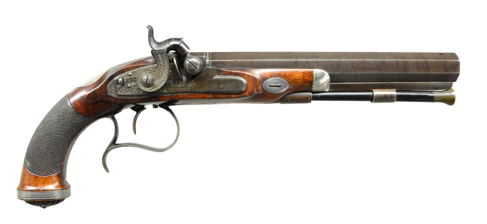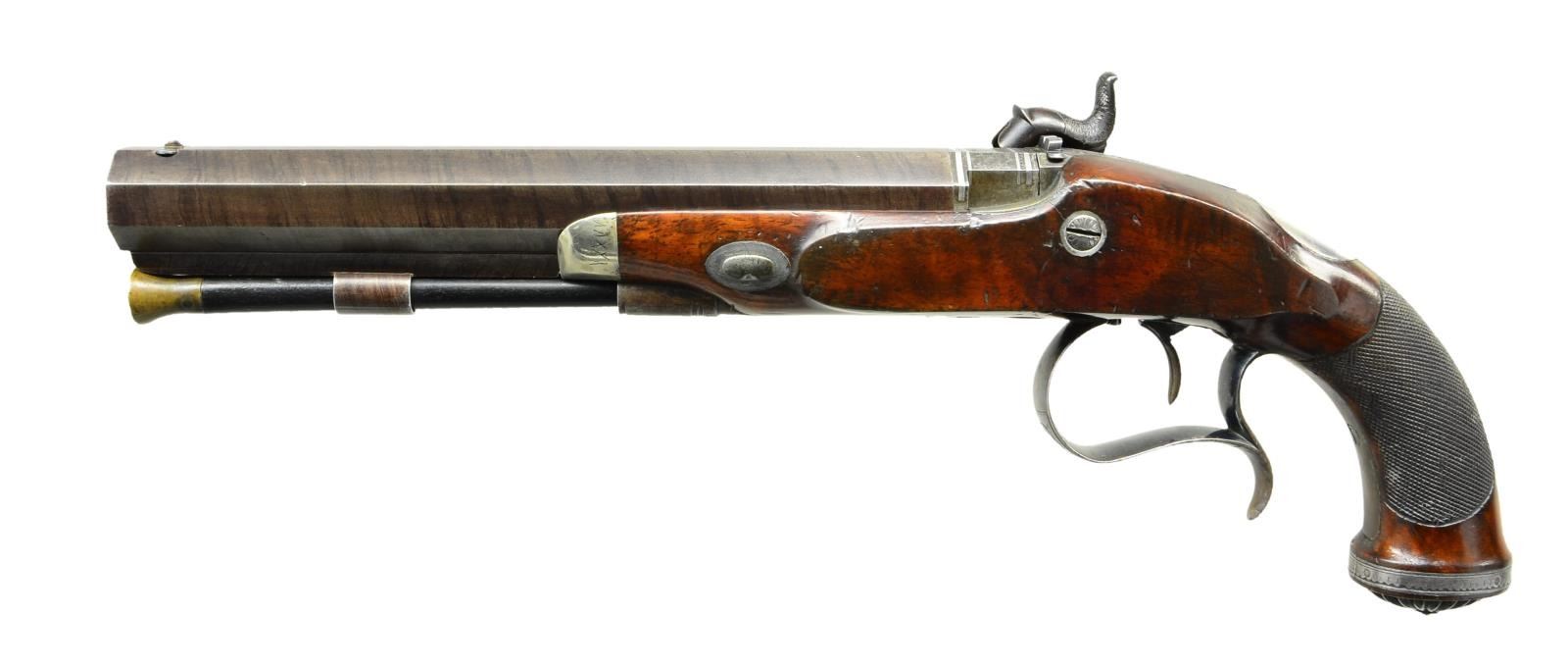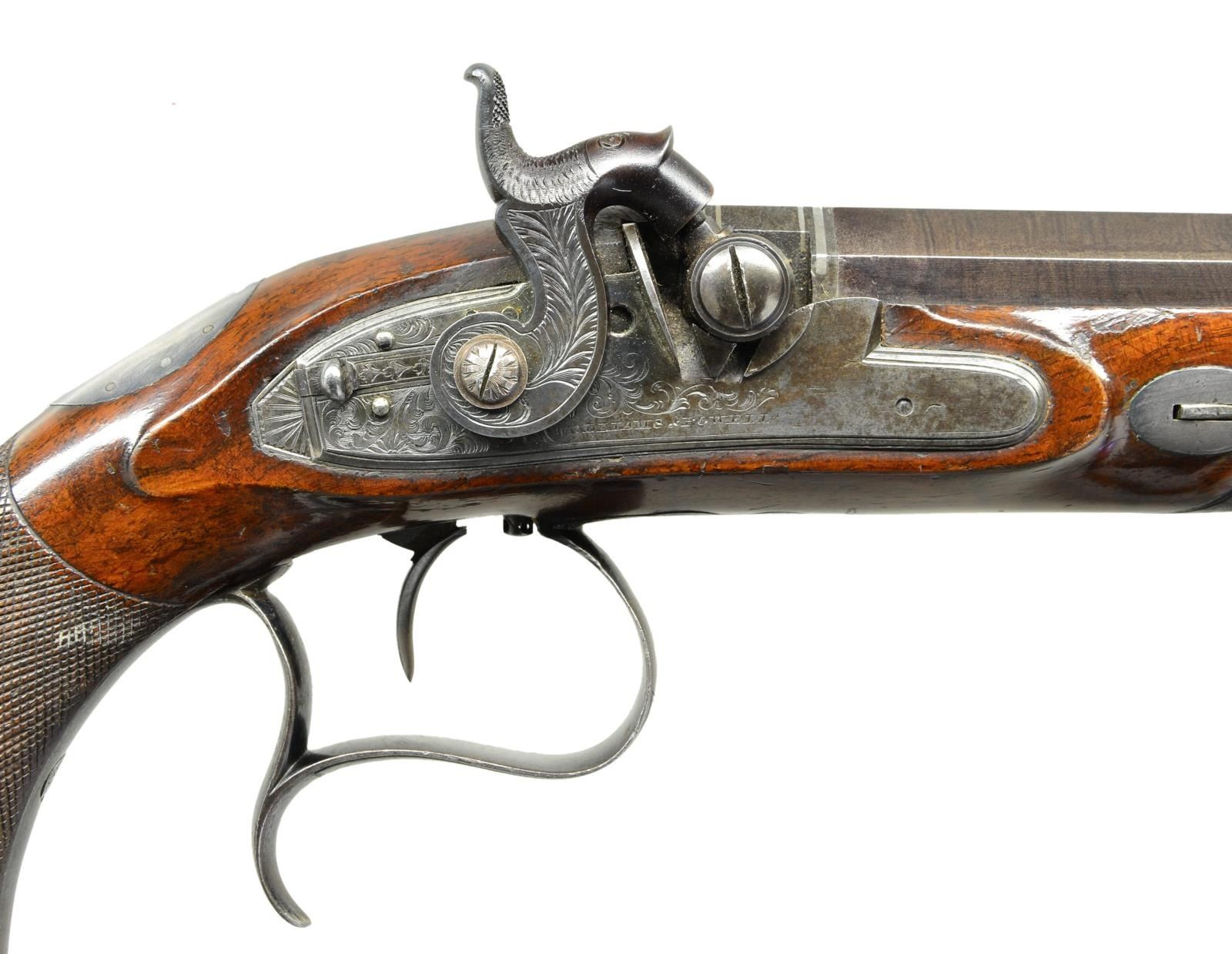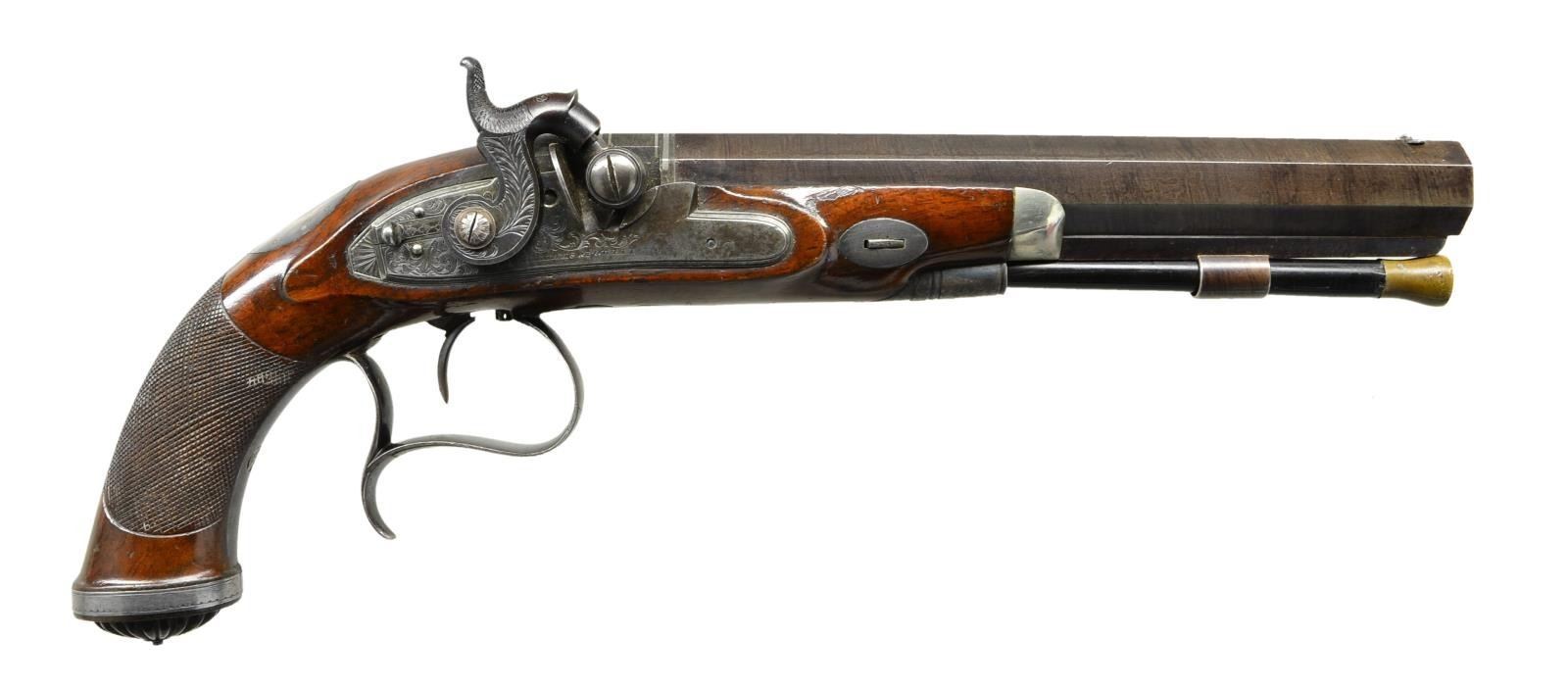 CONVERTED FROM FLINT WITH CASE AND ACCESSORIES, REPORTEDLY ONCE THE PROPERTY OF THOMAS BENTON WHO'S BROTHER JESSE SHOT ANDREW JACKSON IN A BAR FIGHT IN 1813. Cal. 66. NSN. This good quality pair of pistols have 8 1/2" twist octagon barrels with under ribs and are engraved "Liverpool" on tops. Inset patent breeches with four inlaid platinum lines are converted to percussion with well done drum and nipple. Locks with rebated squared tails are fitted with flat faced percussion hammers. Lockplates are engraved with scroll and "WILLIAMS & POWELL". (Working 1833-70). Trigger plates with set triggers have stylized pineapple finials. Scroll engraved trigger guards have finger spurs. Walnut half stocks have checkered flared grips with relief carved bottoms surrounded by silver bands. Stocks are fitted with large vacant silver ovals at tops of grips and silver forend tips. Tip of one gun has "XXXXX" hand scratched. Ebony ramrods with brass tips and tails are held by single plain pipes and matching thimbles. Stocks are attached to barrels with single captive sidebolts through oval steel escutcheons. Pistols are housed in their original mahogany case with flush mounted folding square handle. Interior is lined in green cloth and a "WILLIAMS & POWELL" "SUCCESSORS TO THE LATE" PATRICK" "GUNMAKER" "LIVERPOOL" label is in lid. Bottom compartment contains small unmarked copper bodied powder flask, ebony handled powder measure, rosewood brass and ebony loading mallet/rod and another loading rod with steel worm. Other compartments contain a turned bone dusting brush, lead balls and an empty tin of S. Walker & Co. percussion caps. Also in case is an information card attributing these pistols to the 1813 duel between Col. Thomas Hart Benton and his brother Jesse against Gen. Andrew Jackson in which Jackson was grievously wounded. Most of the further information given is also incorrect. UNATTACHED ACCESSORIES: pf high importance is a hand written slip of paper which reads "Andrew Jackson and Thos. Benton fought a duel with theses guns." "Mrs. Wooley Hendersonville NC granddaughter Thomas Benton". CONDITION: good as refinished. Barrels and locks with rebrown over a good scattering of light marks. Bright blue on trigger guards is good, possibly original. Stocks have newer oil finish over old marks and dings. Bores are good, lightly pitted; mechanically fine. Case has new oil rubbed in over many rubs and scratches. Interior cloth is fair to good, faded and with insect damage. Label is foxed and has many rubs through. Partitions are good, reglued. Accessories are good. (01-21993/MGM). ANTIQUE. $7,000-12,000.