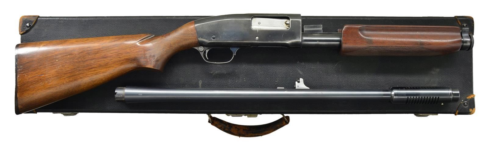 Cal. 12 Ga., 2 3/4". S# 39949. Bbls. (silver beads): 1) 20" CYL marked coding Dec. 1944 with "3" (service or repair) having number 10761 plus crossed out number and Oct. 1941 date code. 2) 23 1/8" (plus 3/4" for installed Lyman Spreader choke) CYL marked coding Feb. 1948 with "2" indicating parts ordered replacement numbered 162. Mfg. 1931-1949. Standard walnut stock set with wraparound checkered forend and plain buttstock having grooved factory black plastic buttplate; 13 3/8" LOP. UNATTACHED ACCESSORIES: wrench and original boxes for its 3 included chokes; spreader installed plus .705 Full and .680 Long Range #2. Good black vintage hard case with lock (no key) plus worn leather handle and corners. Royal blue compartmentalized interior also having multiple spring clips on lid for enclosed cleaning rod set plus 44 cartridges. CONDITION: very good receiver as refinished having light handling marks and high point wear plus function wear on mag. tube. Forend very good to excellent; buttstock with areas of thinning finish and numerous handling marks. 20" bbl. has scattered oxidation with very good bore having hint of frosting. Compensated bbl. has very good to excellent original finish and mirror like near excellent bore. (22-3487/NW). MODERN. $500-800.