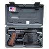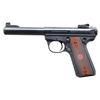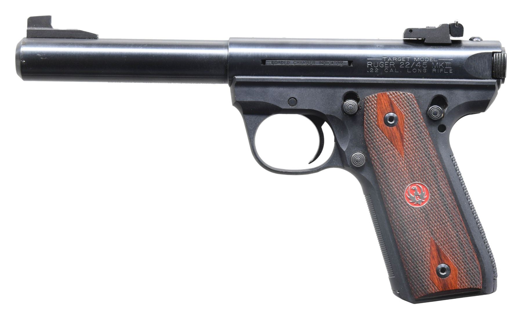 Cal. 22 LR. S# 273-45917. Bbl. 5 1/2' bull with "warning marks" discreetly on its bottom plus sights of Patridge screw attached front and receiver mounted factory adjustable rear. Test fired 04-02-2013 (2004-2016) as blued Target variation (Model 10140) having recessed crown; synthetic grip frame with Allen screw attached 1911 style replaceable double diamond checkered hardwood grips having Ruger medallions of silver eagles with red backgrounds. Has internal lock mechanism (no key; available from Ruger) and loaded chamber indicator plus receiver factory drilled and tapped for scope base. MAGS: 2 factory 10 rd. UNATTACHED ACCESSORIES: matching labeled factory grey plastic case with packaging. Black nylon clip-on IWB abbreviated holster. CONDITION: all aspects near excellent with new, unfired appearance. (25-4909/NW). MODERN. $200-350.