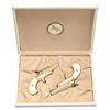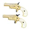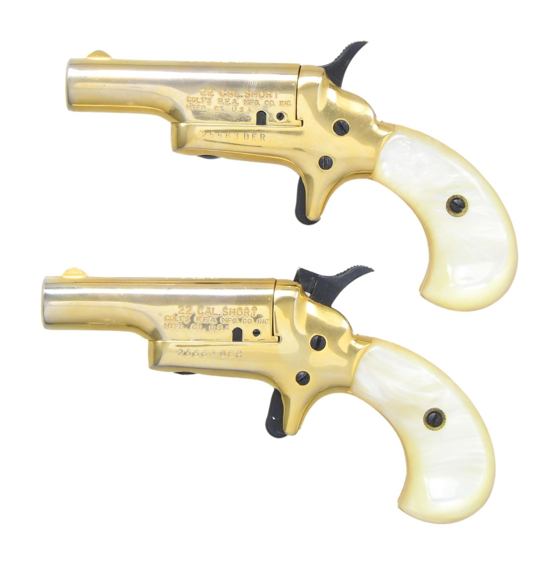 ALL: cal. 22 Short. Approx. 12,000 pairs mfg. in 1970's. Bbls. 2.5". Side pivoting actions. Gold plated finish. Pearlite grips. UNATTACHED ACCESSORIES: Lady Derringer book style case w/ shadow line interior. Case in good with stains on lid. CONDITION: both pistols has very good gold finish with light fading in areas exposed in case. Near excellent bores. 1) S# 25663DER. (25-3280/MD) 2) S# 25664DER. (25-3281/MD). ALL CURIO. $200-300.