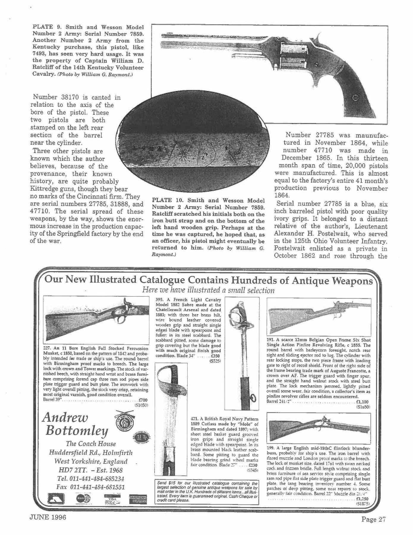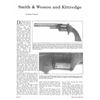 REVOLVER, S# 38407. Cal. 32, S# 234. This revolver is featured in June 1996 Gun Report article by Mike Bricker, in standard configuration, 6" blue finish, one line address, patent marked cylinder. Right side of frame below cylinder has had "KITTREDGE & CO" markings filed off. This revolver was made in summer of 1861. Mounted with varnished rosewood grips. Revolver is housed in a compartmented mahogany case with red baize lining, with reproduction cartridge pack, Civil War eagle button, and 8 loose cartridges. UNATTACHED ACCESSORIES: copy of June 1996 Gun Report article "Smith & Wesson and Kittredge". CONDITION: fine overall, complete & matching serial numbers and assembly markings, retaining about 40% of its original fading blue finish, markings all crisp and discernible. Mechanically functional, crisp rifled bore with pitting. Casing has looseness in corners, reproduction label in lid, chipped striped edge veneer, functional key. PROVENANCE: Lifelong Collection of Robert "Mike" Bricker. (01-25008/JS). ANTIQUE. $1,500-2,000.