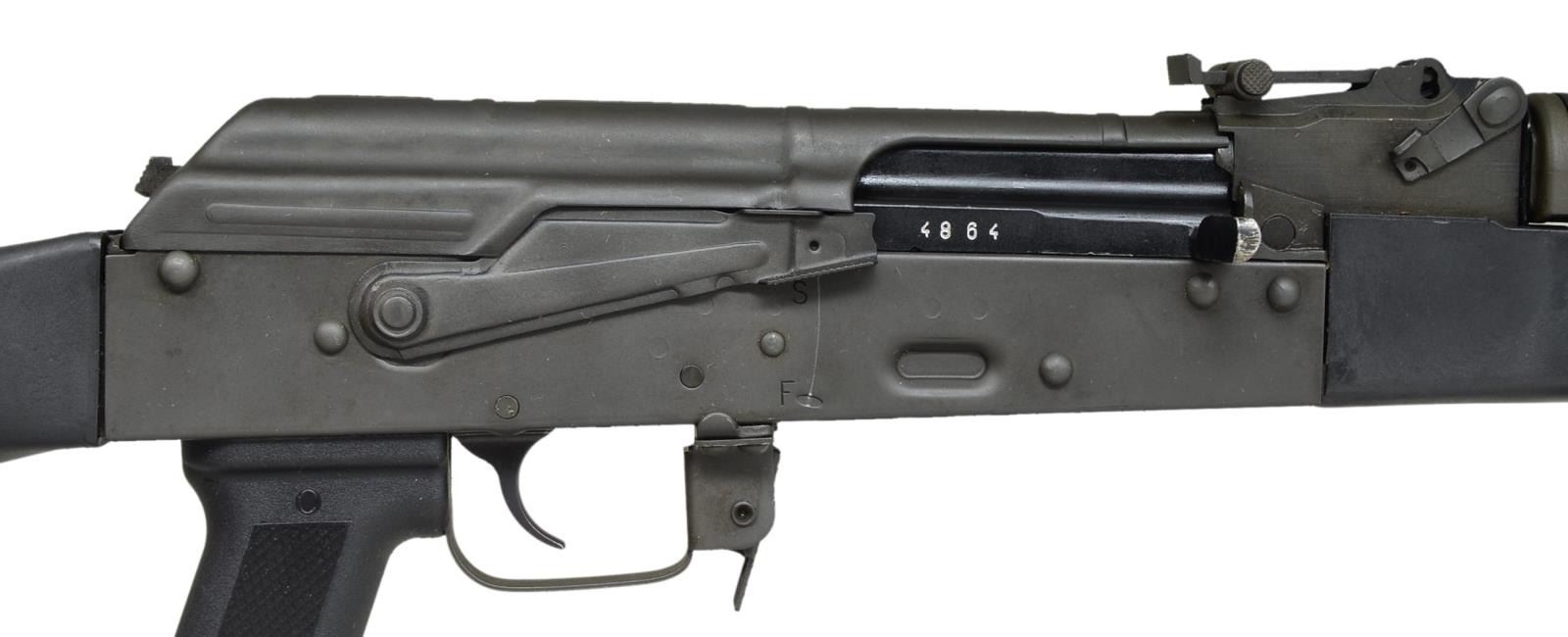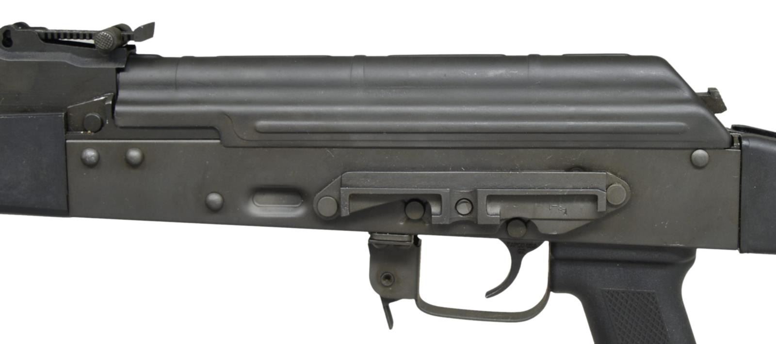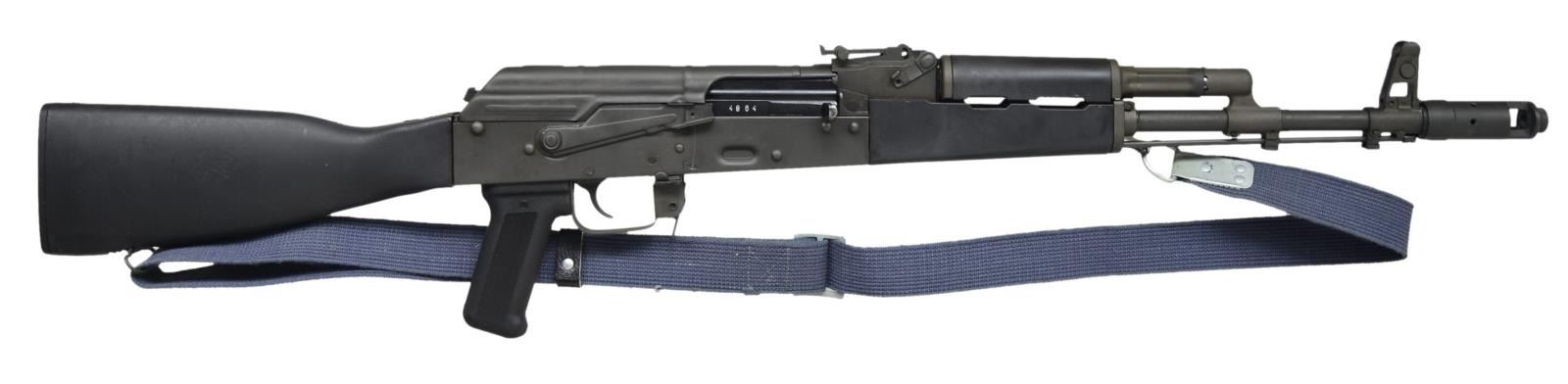 Cal. 5.45x39. S# J000210. Bbl. 16". An extremely clean AK variant built on a NODAK Spud stamped receiver, complete w/ left side scope mount. Slim line black plastic furniture all around, 24mm right hand thread Bulgarian style brake. On board cleaning rod held captive through bayonet lugs below front sight & gas lock. Protected post front sight w/ elevation adj. rear sight from 100-1000m. Tapco G2 trigger. Left side front sling attachment point, currently affixed to denim blue cloth web sling through rear stock mounting point. CONDITION: firearm appears unused by all outward aspects; the finish is unblemished & furniture is unmarked. Very light line of thinning on receiver below safety/selector. Bore is shiny w/ excellent rifling. Fire control mechanism appears to function correctly when cycled by hand. (21-699/JZ). MODERN. $400-600.