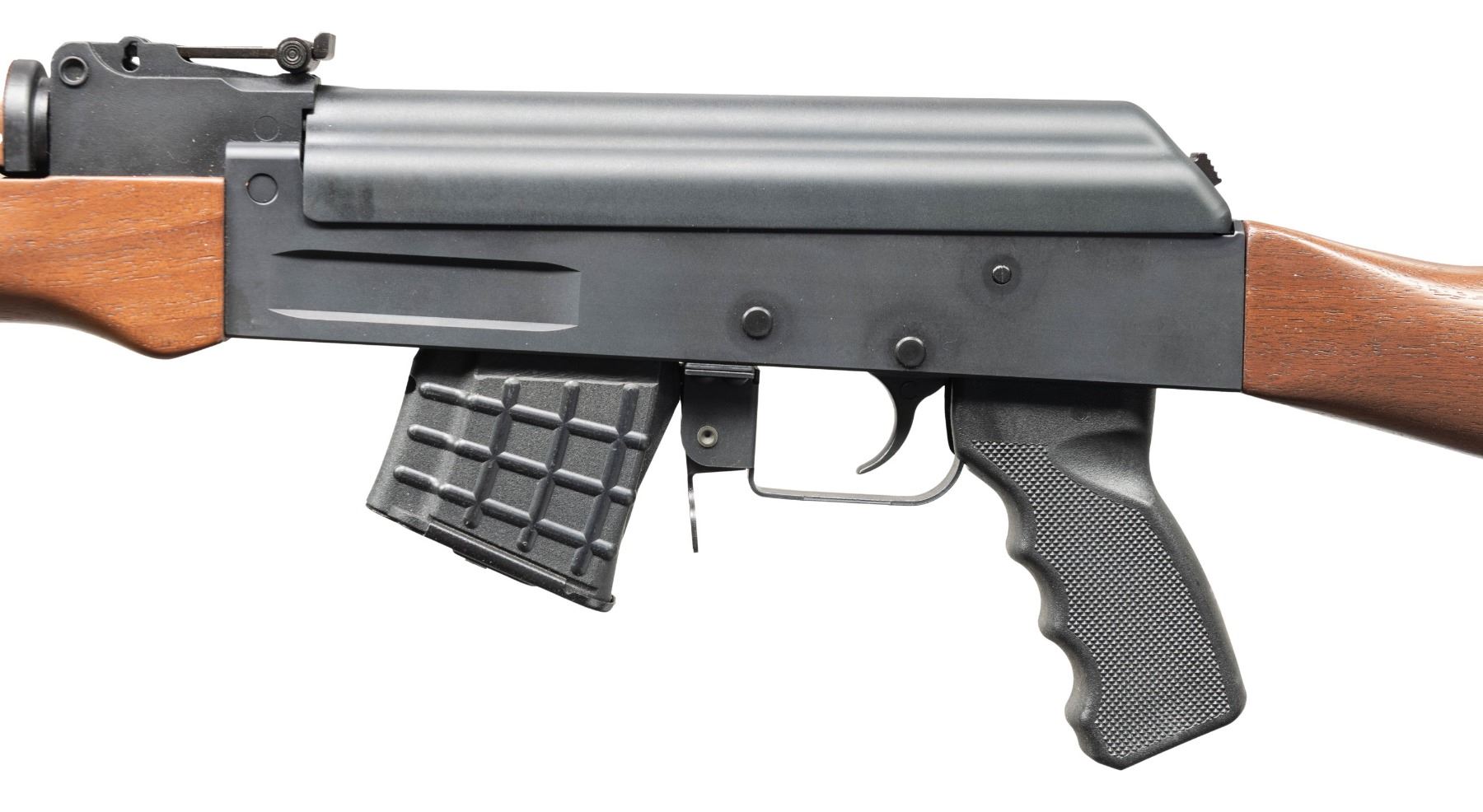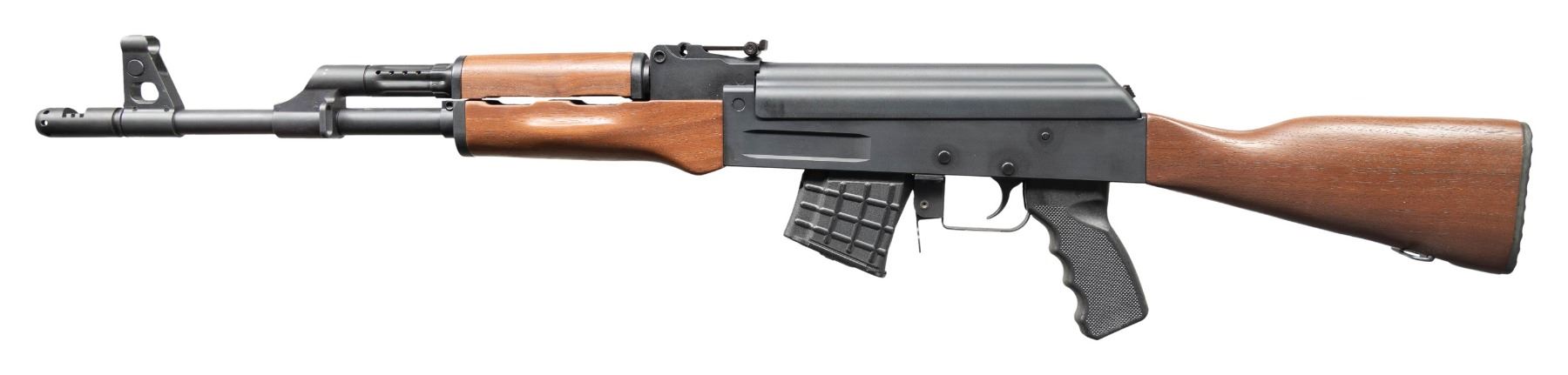 Cal. 7.62x39. S# C39V2A19911. Bbl. 16" with muzzle brake. Standard AK style sights. US made milled AK style rifle. Matte black finish. Hardwood stock & forend. Finger groove black pistol grip. MAGS: 1-10 waffle pattern polymer & unmarked. CONDITION: all aspects near excellent with some light handling & operational wear. Bright near excellent bore. PROVENANCE: Estate Collection of John "Jack" Dhooghe. (25-5509/MJC). MODERN. $600-900.