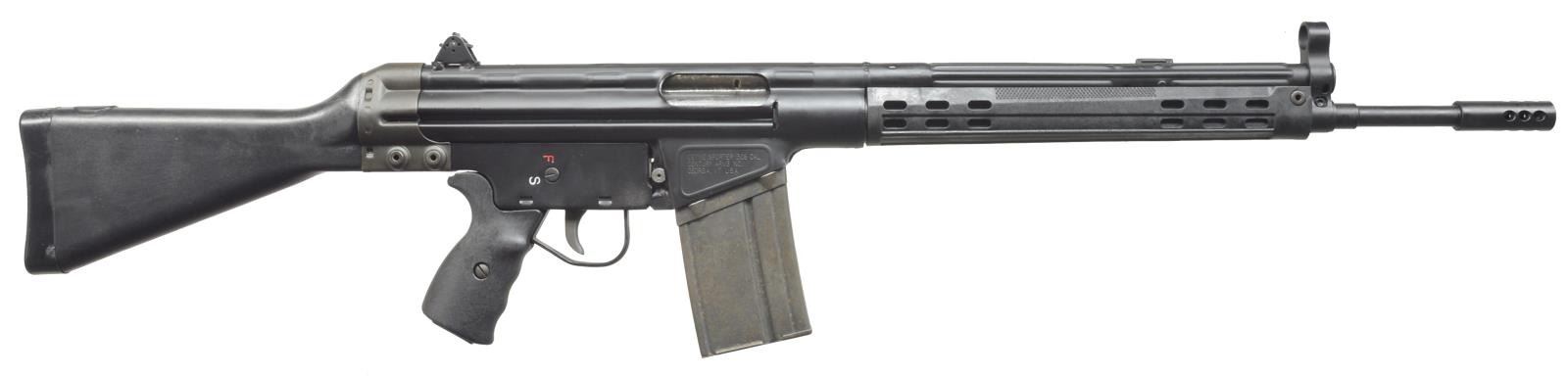Cal. 308 Win. S# C47814. Bbl. 18 1/2" plus 12 port muzzle brake. Mfg. 2002-2011 w/ synthetic HK style stock set. HK style shielded front sight; fixed rear w/ 3 apertures & 1 V notch. Matte black finished, HK91 clone that uses HK or CETME mags. MAGS: 2 very good steel 20 rds. CONDITION: near excellent overall appearance. Fair to good bore w/ wear & even moderate frosting throughout. (20-2507/NW). MODERN. $450-600.
