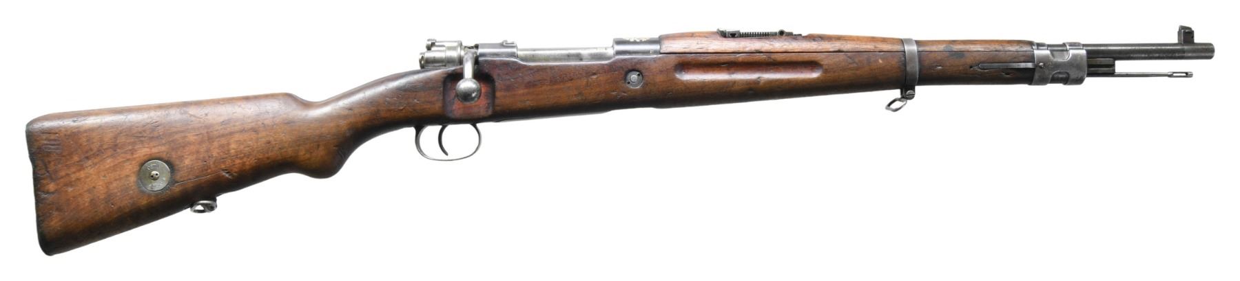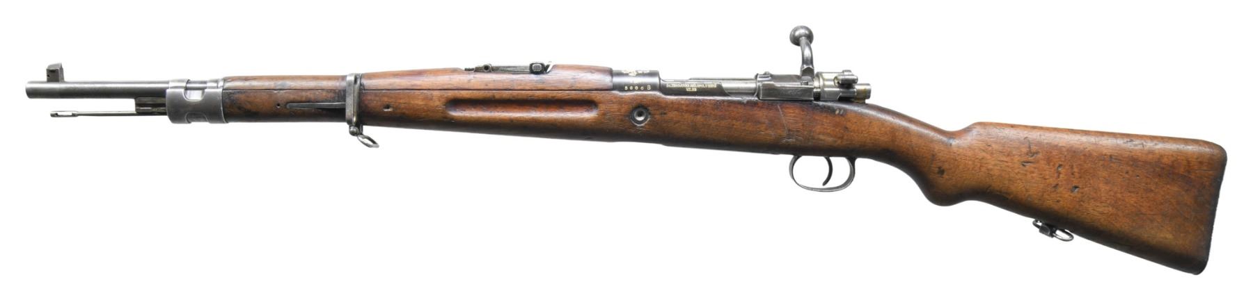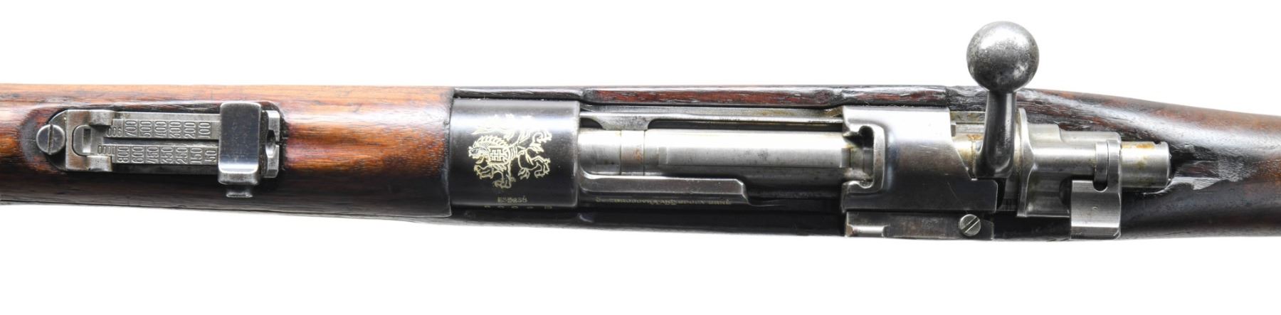 Cal. 8x57 (8mm Mauser). S# 5006B. Bbl. 19 1/4". Blade front sight without hood. Tangent rear sight graduated to 1000m. Matching numbers on stock disc & receiver. Bolt is close in serial with a B suffix but numbered "5081B". CETN marking on disc denotes issue by Czech Gendarmerie. Receiver top has bold Czech lion crest. Left side of receiver has Czech "E3 (Lion crest) 38" for 1938 acceptance. Various receiver markings have added white highlight. Blued finish. Walnut stock set with both bottom mounted & left side sling provisions. Cleaning rod present. CONDITION: stock set shows a thin handguard cracks, a few small gouges, a light chip behind upper tang, scattered finish wear, dings & handling marks. Metal is a mix of silvery-gray & dull gray with traces of original blue on receiver, scattered oxidation, handling marks & some moderate pitting. Action functions properly when hand cycled. Bore is dark with scattered pitting & oxidation but strong rifling. (25-5074/MJC). CURIO. $1000-1500.