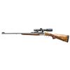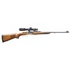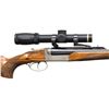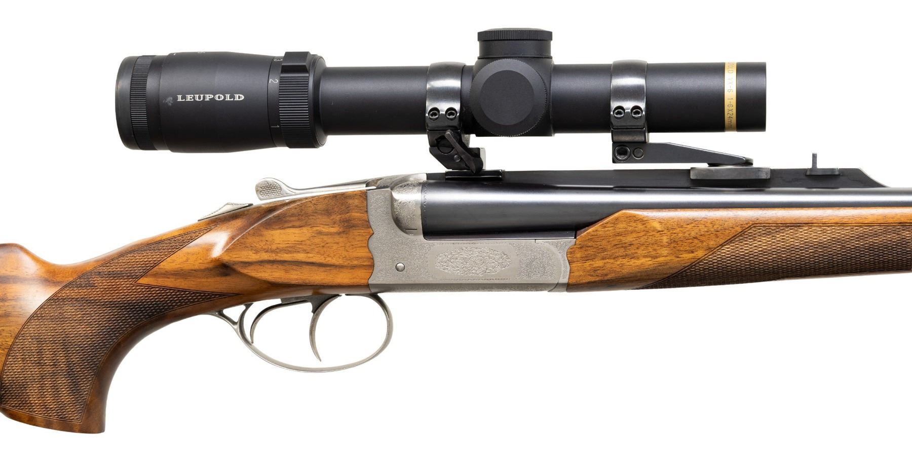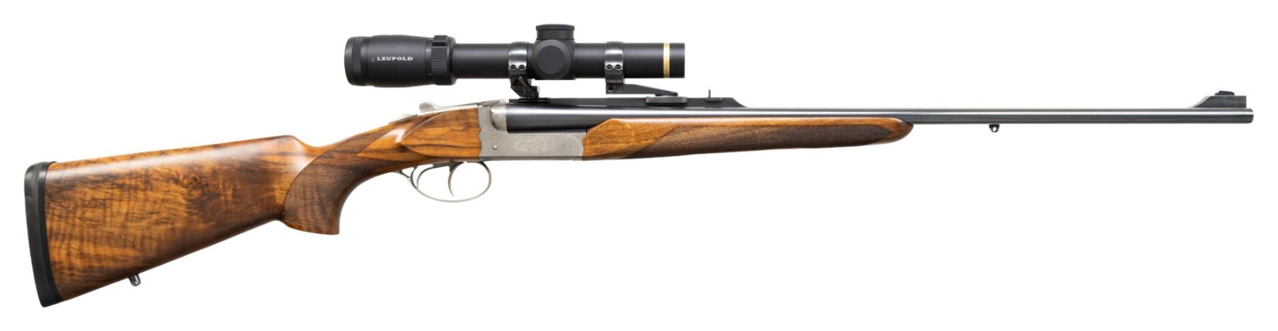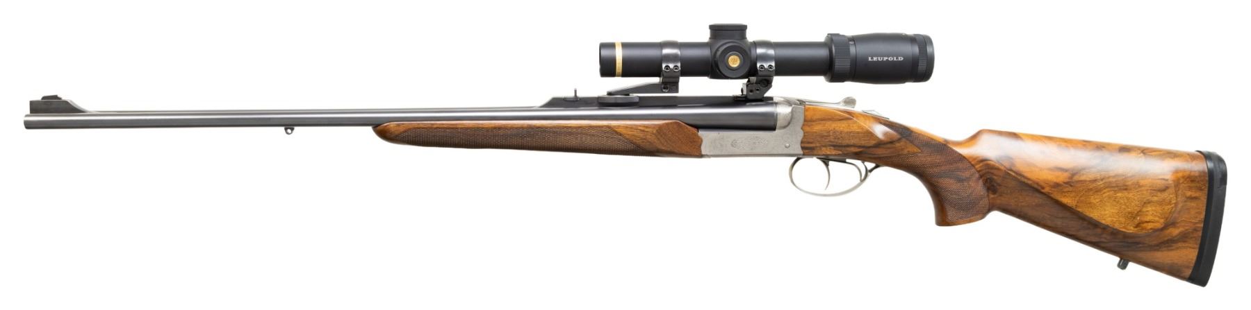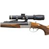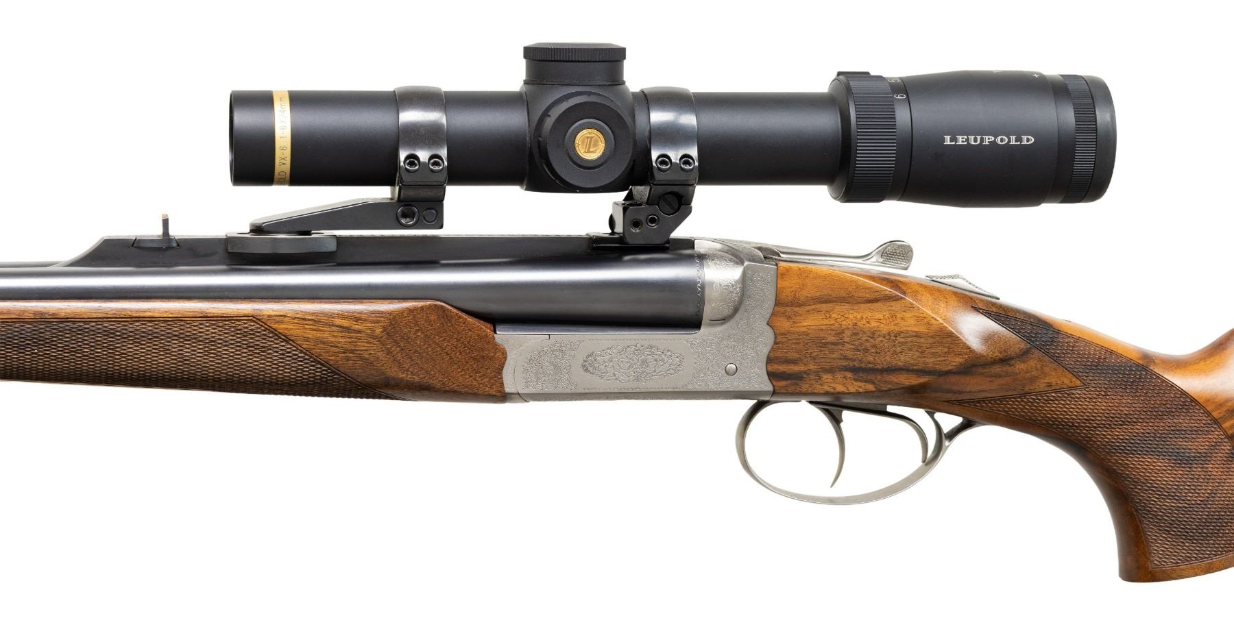 Cal. 9.3 x 74R. S# 47845. Bbls 23 5/8". Ramp mounted bead front sight with standing leaf rear sight and scope blocks on the engraved quarter rib. Scalloped boxlock action with scroll and floral ornamentation. Dbl triggers, ejectors, trim beavertail forearm and pistol grip cheekpiece stock of fancy European walnut with hand checkering. LOP: 14" over a solid black Decelerator pad. Fine French made rifle imported by Kebco LLC of Silver Springs, MD. UNATTACHED ACCESSORIES: molded case with red cloth fitted interior. Case contains a Leupold VX-6x42mm matte finish scope with Duplex reticle on QD rings for factory mount. CONDITION: near excellent retaining over 98% metal finish. Breech face shows dark spots. Stock shows few light handling marks. Scope has bright optics. PROVENANCE: From the Buckstix Collection. (25-6359/DS). MODERN. $4,000-6,000.