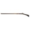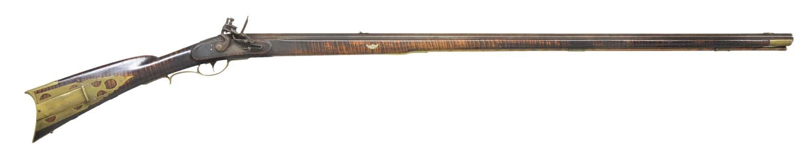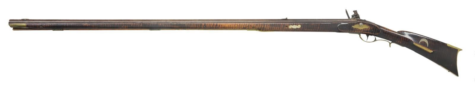 RIFLE. Cal. about 50. NSN. Bbl. 42 5/8” octagon measuring 7/8” across flats at muzzle. Top flat is engraved “C B” w/ star stampings around front & rear sight areas. Muzzle has circle of punch marks. Brass blade front sight w/ fixed V notch rear sight. Engraved trade lock is marked w/ illegible name over “Warranted”. Plain trigger. Pin fastened full length Roman nose cheek piece stock of curly maple. Right side has brass rectangular lid pierced & segmented patchbox. Other brass fittings include crescent buttplate, toe plate, finger curl trigger guard, faceted thimble, 2 faceted pipes & nose cap. Brass ornamentation consists of engraved cheek piece plate & engraved side plate w/ initials “MSH”. German silver ornamentation is composed of old man in the moon on right side of forearm w/ geometric shape on left & oval wrist plate. Hardwood ramrod. American Gunsmiths by Frank Sellers has a listing for “BAUM, CHARLES, New Berlin, Pennsylvania. Flintlock and percussion Kentucky rifles. (Gabel)”. CONDITION: bbl. & lock have a patina appearance showing thinning on edges w/ scattered surface corrosion & pitting that becomes heaviest in breech area. Stock has an aged darkened original appearance w/ expected scratches & marks showing wood erosion above the lock. Forearm has a line of checking between thimble & first pipe. Small chips are found around the stock pins. Functioning lock. Dark pitted bore retains partially intact rifling. PROVENANCE: Collection of Dr. John Persing. (01-22305/DS). ANTIQUE. $5,000-7,000.