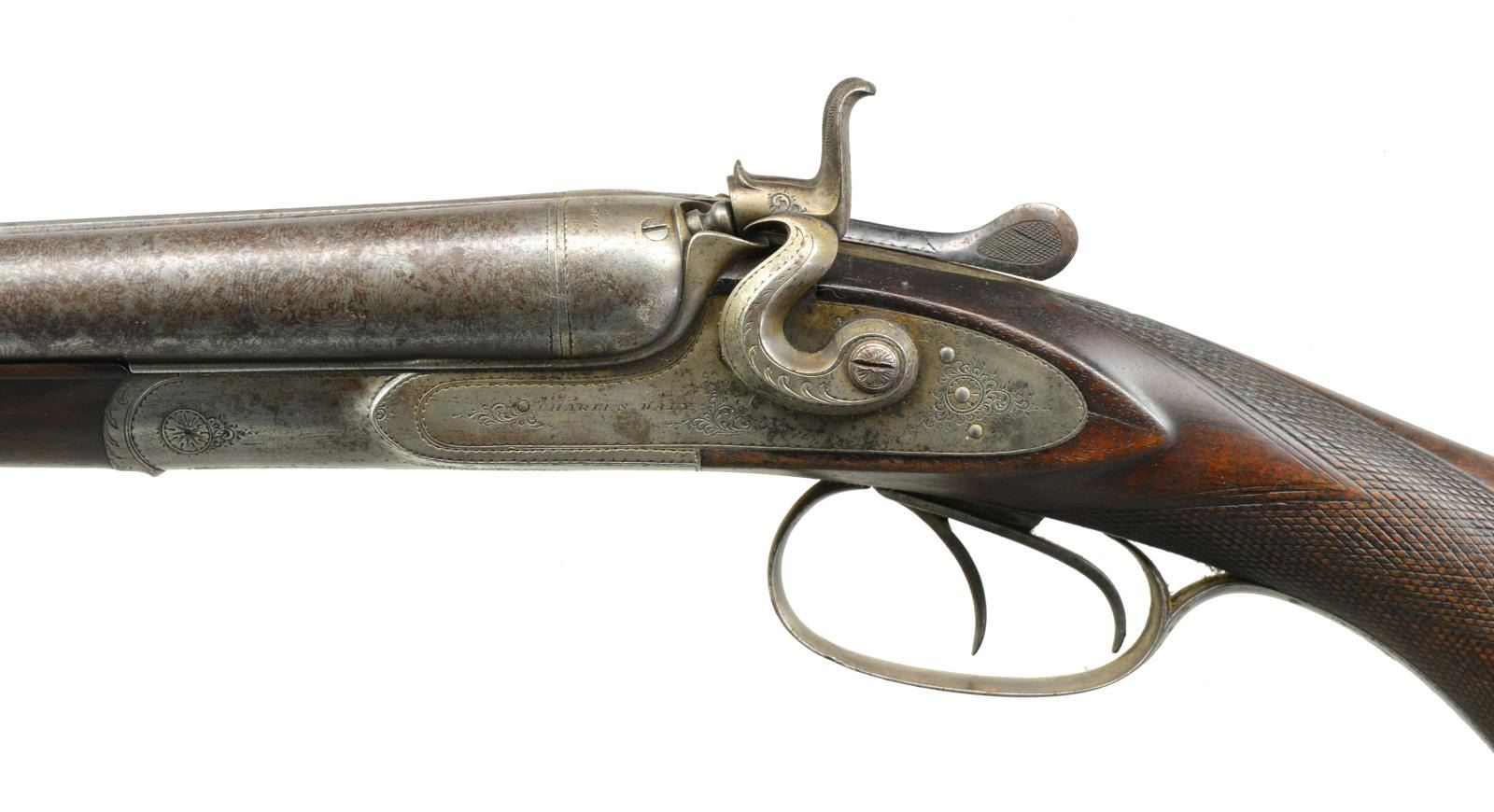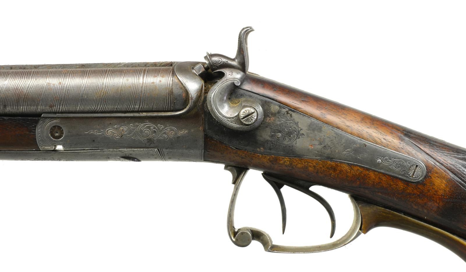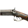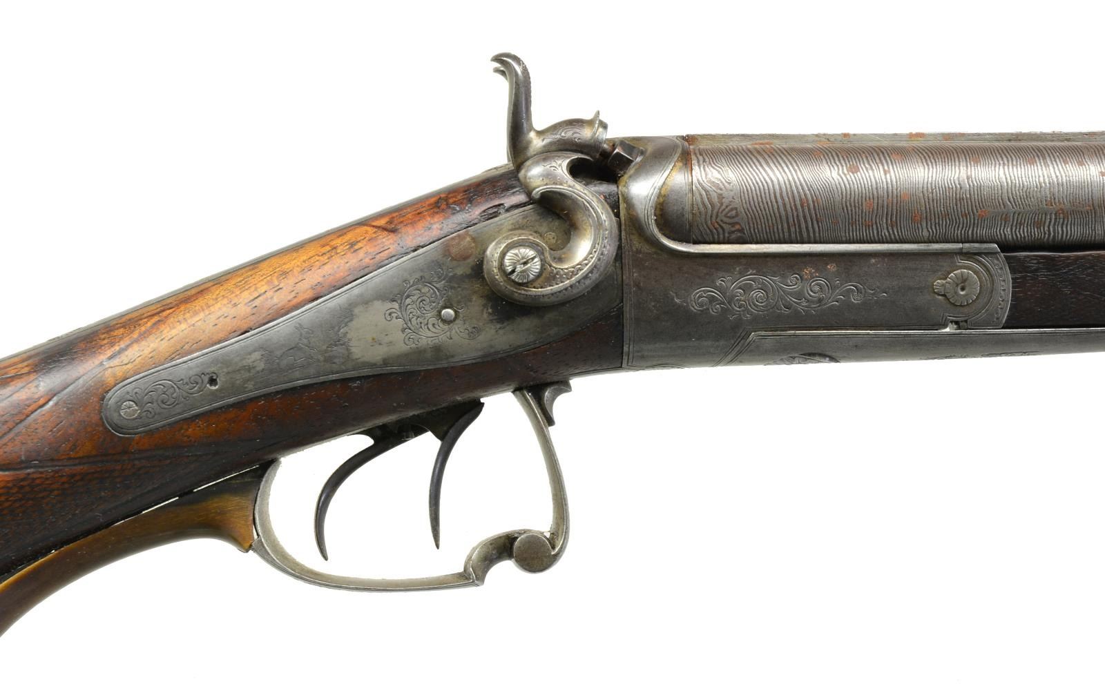 1) CHARLES DALY PRUSSIAN HAMMER. Cal. 12 Ga., 2 1/2". S# 1165. Bbls. 28" of Laminated Steel w/ Mod. & Full fixed chokes. Case colored top lever exposed hammer sidelock action w/ dbl. triggers & extractors. Action, trigger guard & forearm iron have borderline engraving w/ scroll highlights. Splinter forearm & rnd. knob stock of fancy European walnut w/ hand checkering & sling swivels having German silver oval name plate in toeline. LOP: 13 3/4" over original checkered horn buttplate. CONDITION: metal finish is fading to gray showing scattered spots of surface corrosion & light pitting. Forearm is shortened at tip w/ lg. chips along right bbl. channel. Stock shows heavy wear w/ numerous handling marks. Sound mechanics. Pitted bores. Left bbl. has sm. dent 11 1/2" from breech. (01-17984/DS). 2) UNMARKED GERMAN UNDERLEVER COMBO. Cal. 16 Ga., 2" / Unidentified 40mm cartridge using approx. 1 1/2" case. NSN. Bbls. 25" of deeply etched Twist Steel w/ dovetail German silver blade front sight & fixed V notch rear sight. Right bbl. is rifle for unidentified cartridge, left bore is 16 Ga. smooth bore. Rnd. bodied underlever back lock hammer action w/ attached pivoting forearm. Dbl. triggers, front trigger is set. Extractors. Action & locks have highlights of scroll engraving w/ shore birds on left lock & rabbits on right lock. Curled iron trigger guard w/ carved horn extension. Splinter forearm & straight grip stock of checkered fancy European walnut w/ sling swivels. LOP: 13 7/8" to steel butt. CONDITION: bbls. have cleaned gray appearance w/ surface corrosion. Action finish is fading to mottled gray w/ red rust inside of receiver. Forearm has heavily worn checkering w/ chips at tip & along bbl. channel. Stock shows heavy finish & checkering wear w/ numerous dents, scratches & handling marks having sm. cracks around buttplate. Locks are sound. Bores have darkened appearance w/ scattered light pitting. (01-17985/DS). BOTH ANTIQUE. $700-1,000.