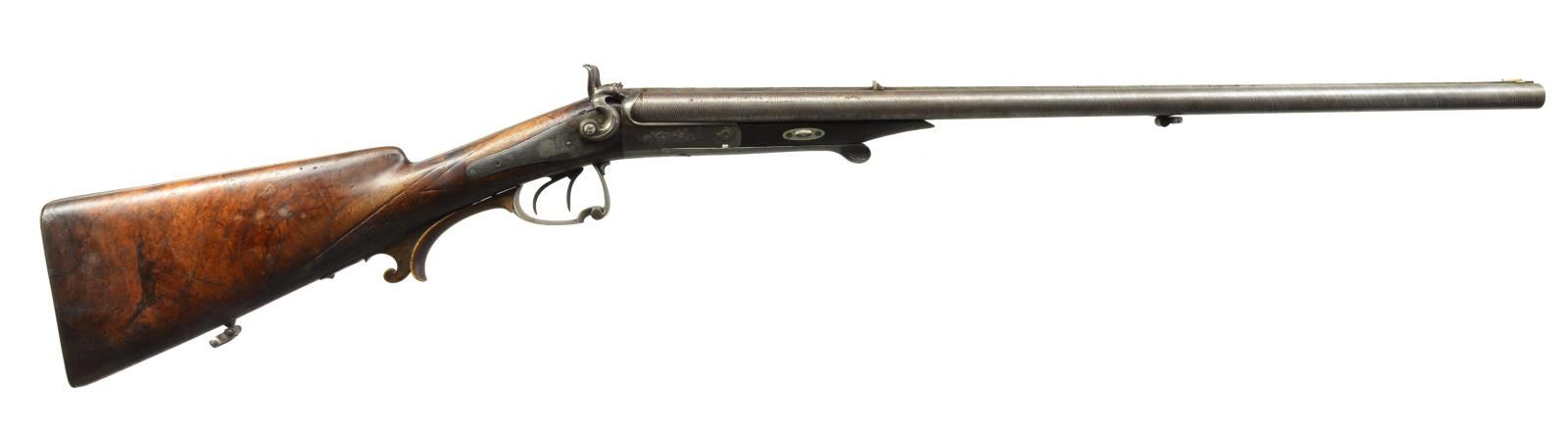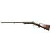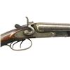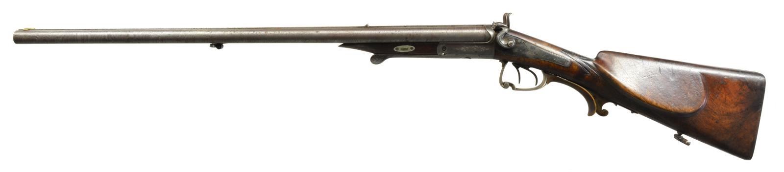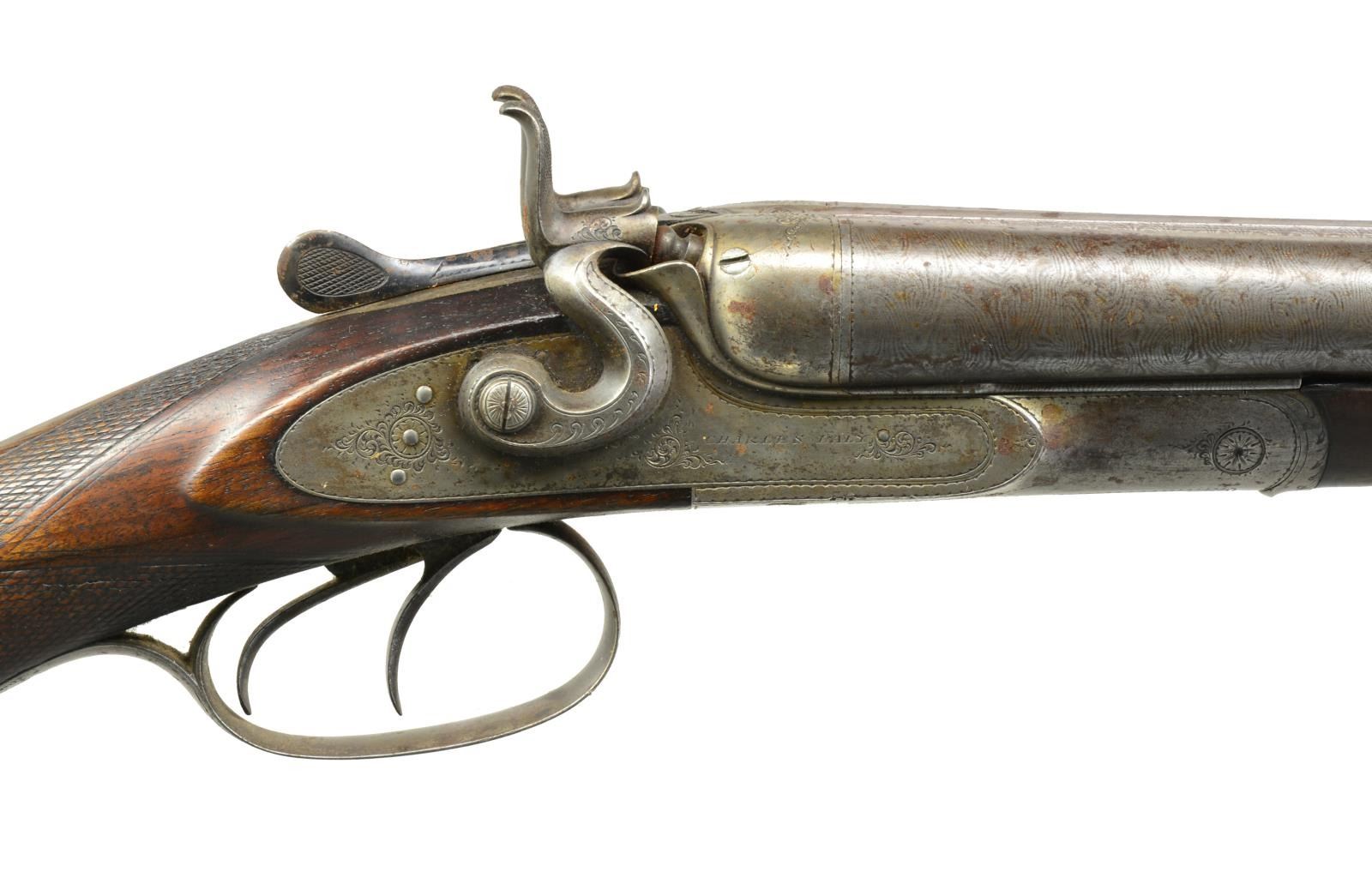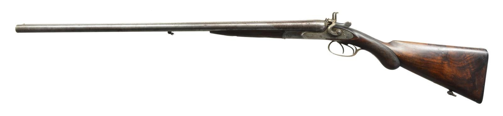 1) CHARLES DALY PRUSSIAN HAMMER. Cal. 12 Ga., 2 1/2". S# 1165. Bbls. 28" of Laminated Steel w/ Mod. & Full fixed chokes. Case colored top lever exposed hammer sidelock action w/ dbl. triggers & extractors. Action, trigger guard & forearm iron have borderline engraving w/ scroll highlights. Splinter forearm & rnd. knob stock of fancy European walnut w/ hand checkering & sling swivels having German silver oval name plate in toeline. LOP: 13 3/4" over original checkered horn buttplate. CONDITION: metal finish is fading to gray showing scattered spots of surface corrosion & light pitting. Forearm is shortened at tip w/ lg. chips along right bbl. channel. Stock shows heavy wear w/ numerous handling marks. Sound mechanics. Pitted bores. Left bbl. has sm. dent 11 1/2" from breech. (01-17984/DS). 2) UNMARKED GERMAN UNDERLEVER COMBO. Cal. 16 Ga., 2" / Unidentified 40mm cartridge using approx. 1 1/2" case. NSN. Bbls. 25" of deeply etched Twist Steel w/ dovetail German silver blade front sight & fixed V notch rear sight. Right bbl. is rifle for unidentified cartridge, left bore is 16 Ga. smooth bore. Rnd. bodied underlever back lock hammer action w/ attached pivoting forearm. Dbl. triggers, front trigger is set. Extractors. Action & locks have highlights of scroll engraving w/ shore birds on left lock & rabbits on right lock. Curled iron trigger guard w/ carved horn extension. Splinter forearm & straight grip stock of checkered fancy European walnut w/ sling swivels. LOP: 13 7/8" to steel butt. CONDITION: bbls. have cleaned gray appearance w/ surface corrosion. Action finish is fading to mottled gray w/ red rust inside of receiver. Forearm has heavily worn checkering w/ chips at tip & along bbl. channel. Stock shows heavy finish & checkering wear w/ numerous dents, scratches & handling marks having sm. cracks around buttplate. Locks are sound. Bores have darkened appearance w/ scattered light pitting. (01-17985/DS). BOTH ANTIQUE. $700-1,000.
