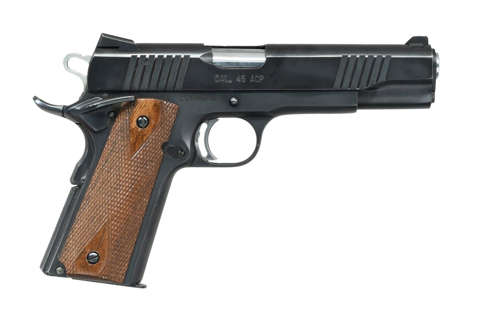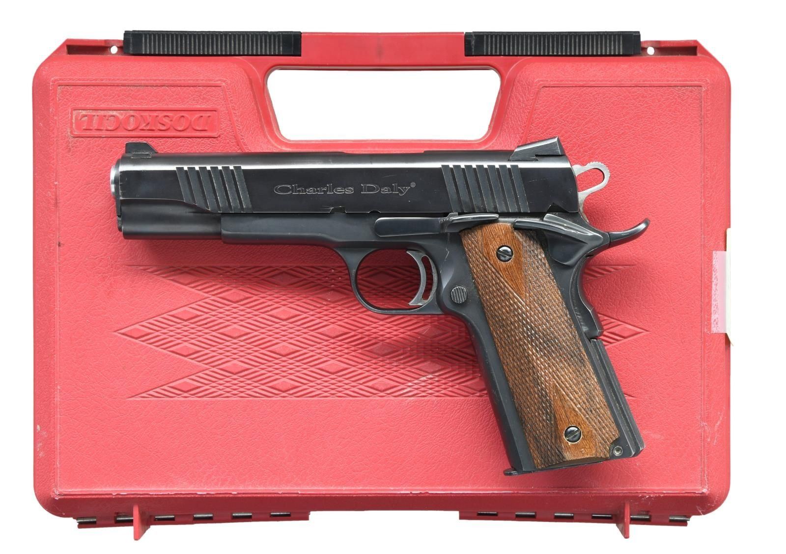 Cal. 45 ACP. S# CD017970. Bbl. 5". Blade front sght. Novak style rear sight. Charles Daly imported 1911 style pistol made in Phillipines. Extended ambi safety. Front & rear slide serrations. Extended slide stop. Extended beavertail grip safety. Blue finish. Checkered hardwood grips. MAGS: 2-7 rd. UNATTACHED ACCESSORIES: aftermarket hardcase. CONDITION: grips show some light dings & handling marks. Metal retains 93% blue w/ a slide stock reassembly mark on left side of frame, some scattered edge & handling wear. Very good bore. (23-6173/MJC). MODERN. $300-400.