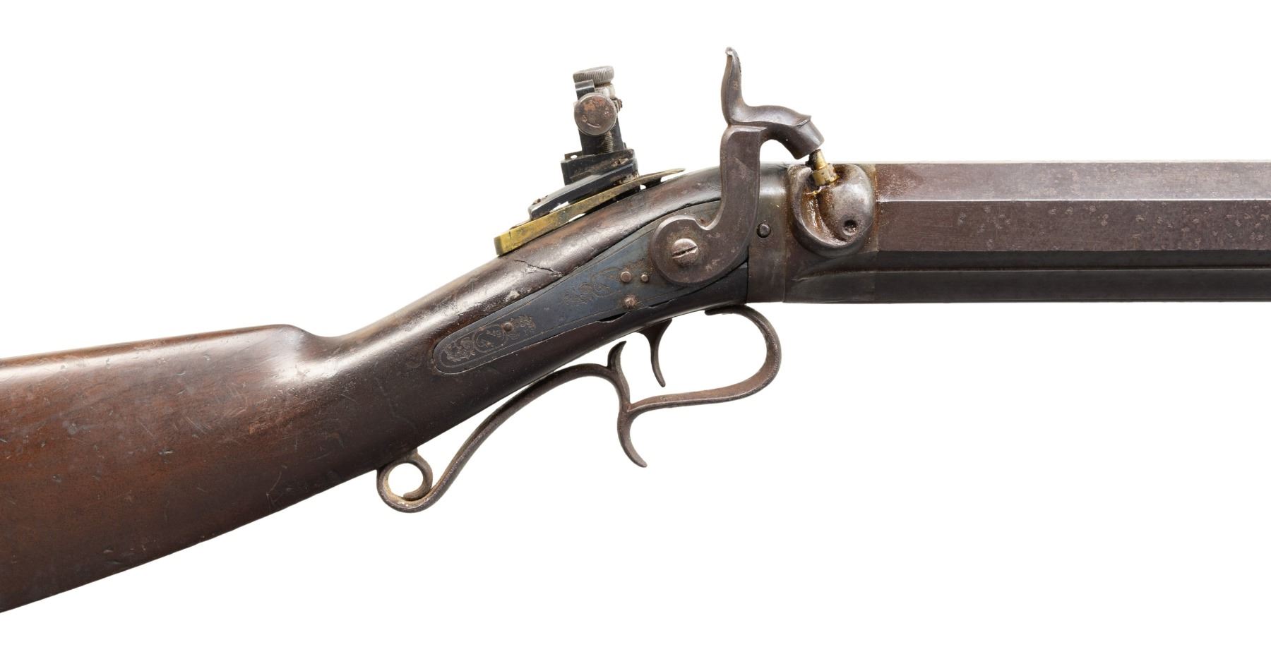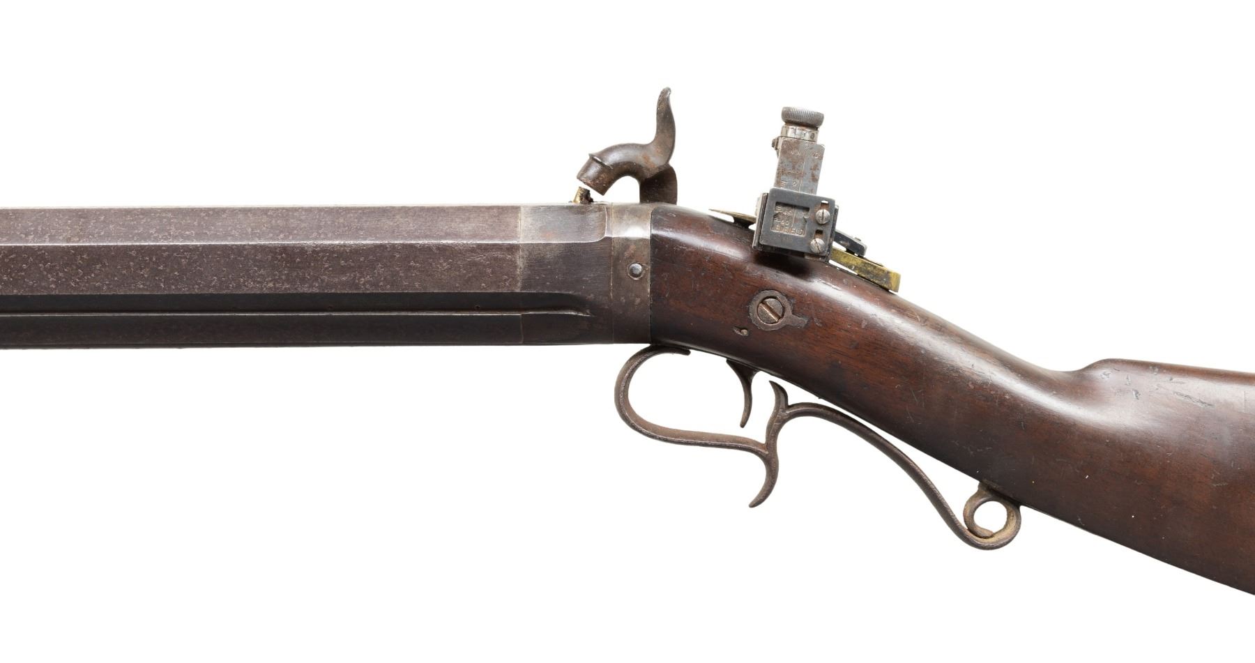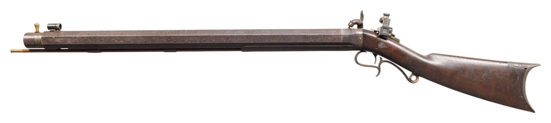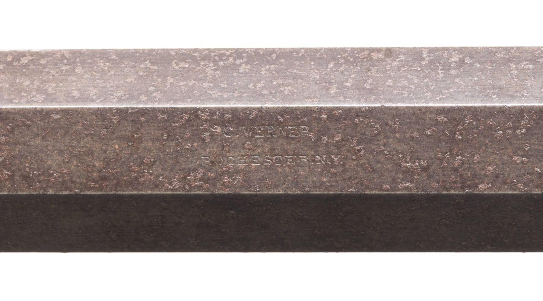 PERCUSSION TARGET RIFLE. Cal. 45. NSN. Charles L Werner (1855-1876) of Rochester, New York made percussion target rifles and air gun. Oct. 26" w/ 1.25" muzzle starter measuring 1 3/8" diameter. Underside of bbl. has large dovetail for target rest, 2 pipes & base for hardwood brass tipped ramrod. Modern globe front sight & Redfield receiver sight having brass tab. Back action lock w/ single trigger. Walnut buttstock w/ crescent buttplate & finger curl triggerguard. CONDITION: metal has brown patina appearance with oxidation throughout. Replacement nipple. Wood has worn appearance with repaired breaks & cracks at top of wrist. Bore shows strong rifling. Muzzle starter is stuck in place. Lock appears mechanically fine. PROVENANCE: Estate Collection of Groves Herrick. (01-28313/MD). ANTIQUE. $500-900.