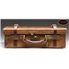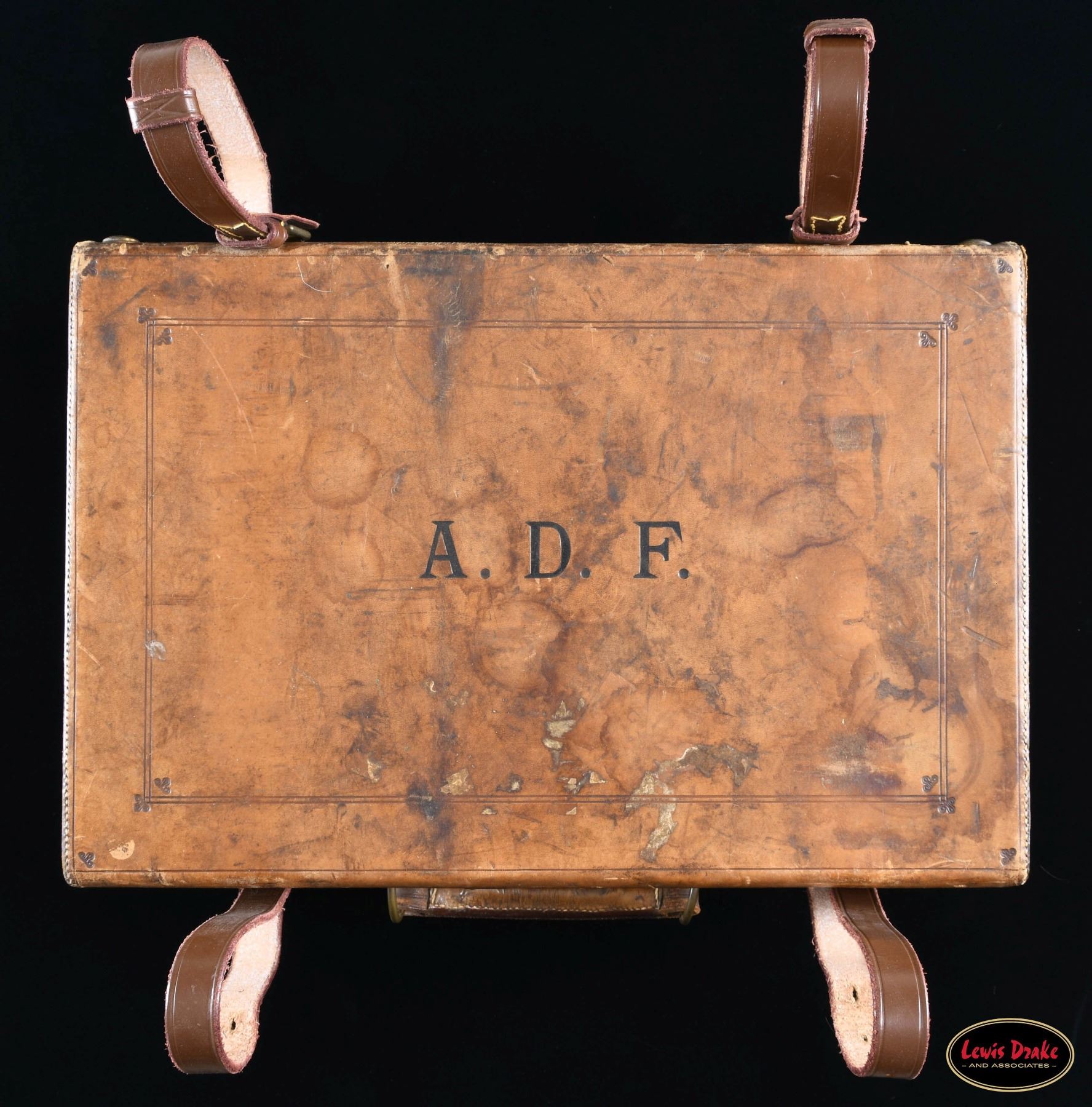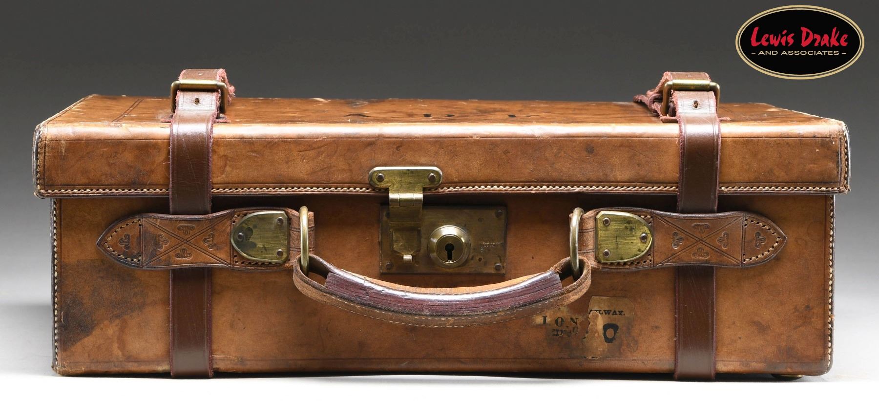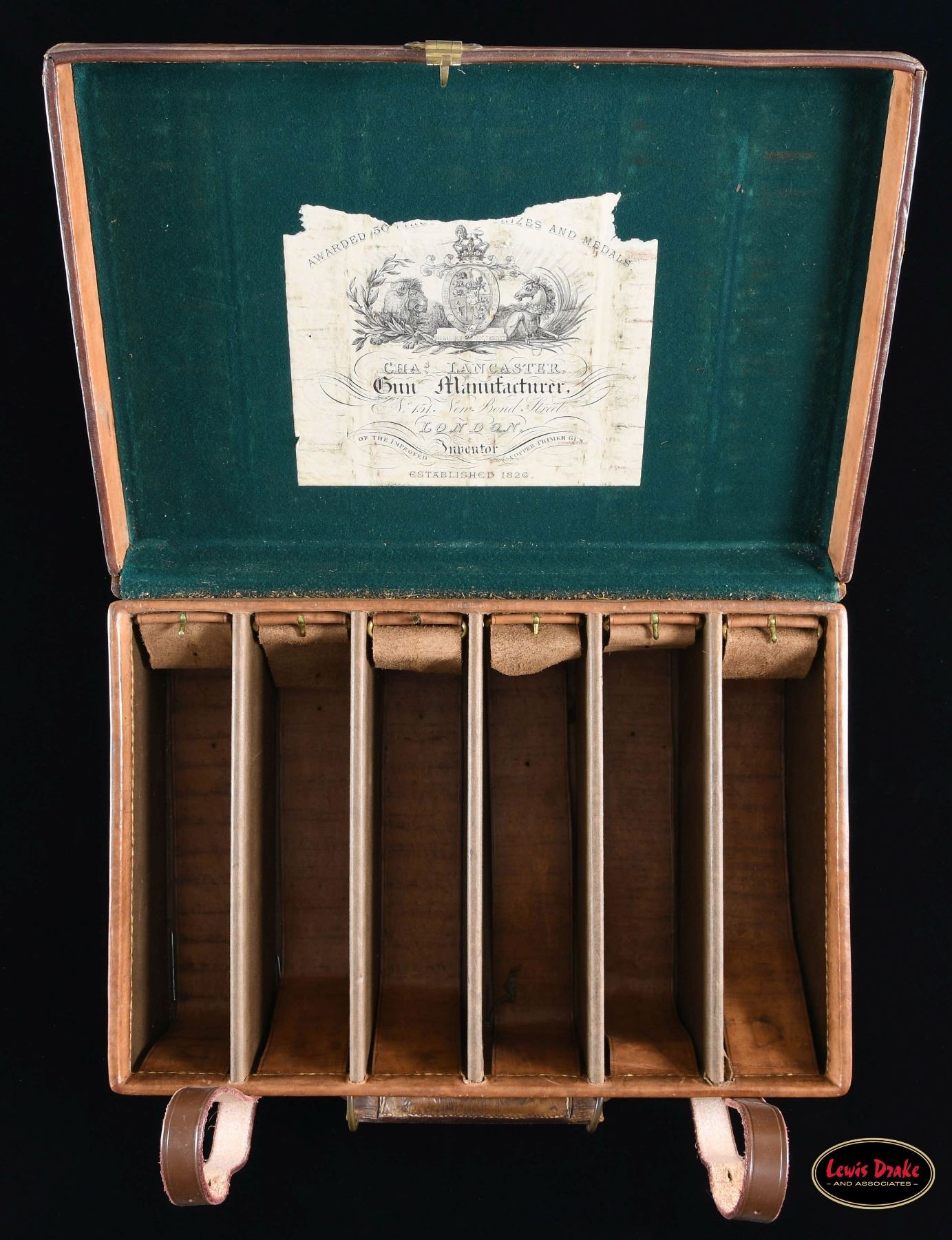 MAGAZINE CASE. Brown leather case measures approx. 18" x 12" x 6"; lid has stamped "A.D.F" & parts of South Coast Railway label on side. Interior of lid has green velour with most of Charles Lancaster label. Interior has 6 compartments to hold cartridges. CONDITION: case in good overall intact appearance showing scuffs, wear & stains. Leather straps intact & sturdy. Interior straps appear intact & sturdy with light staining. PROVENANCE: from the renowned collection of quality sporting arms from Lewis Drake together with inventory of Lewis Drake Associates. (02-23566/MD). $500-1,000.