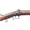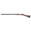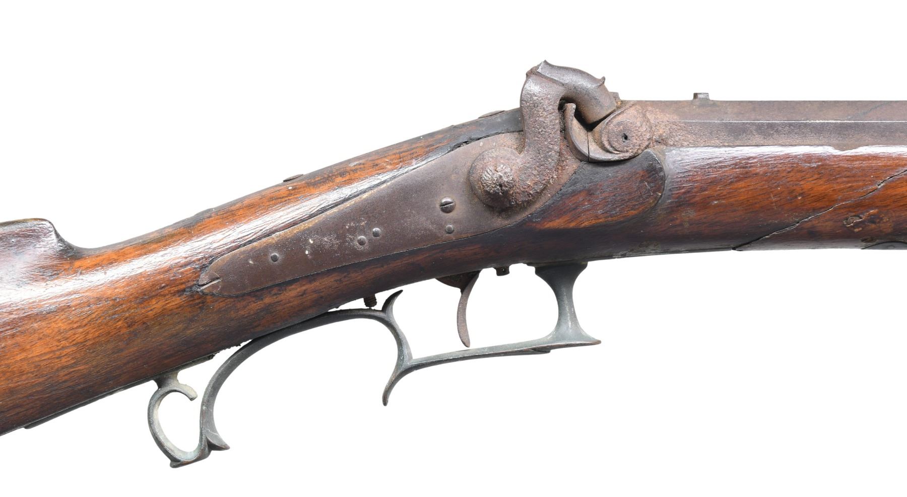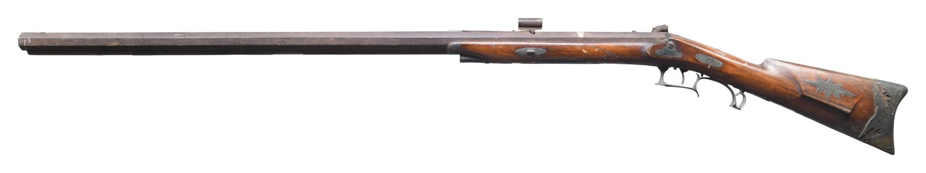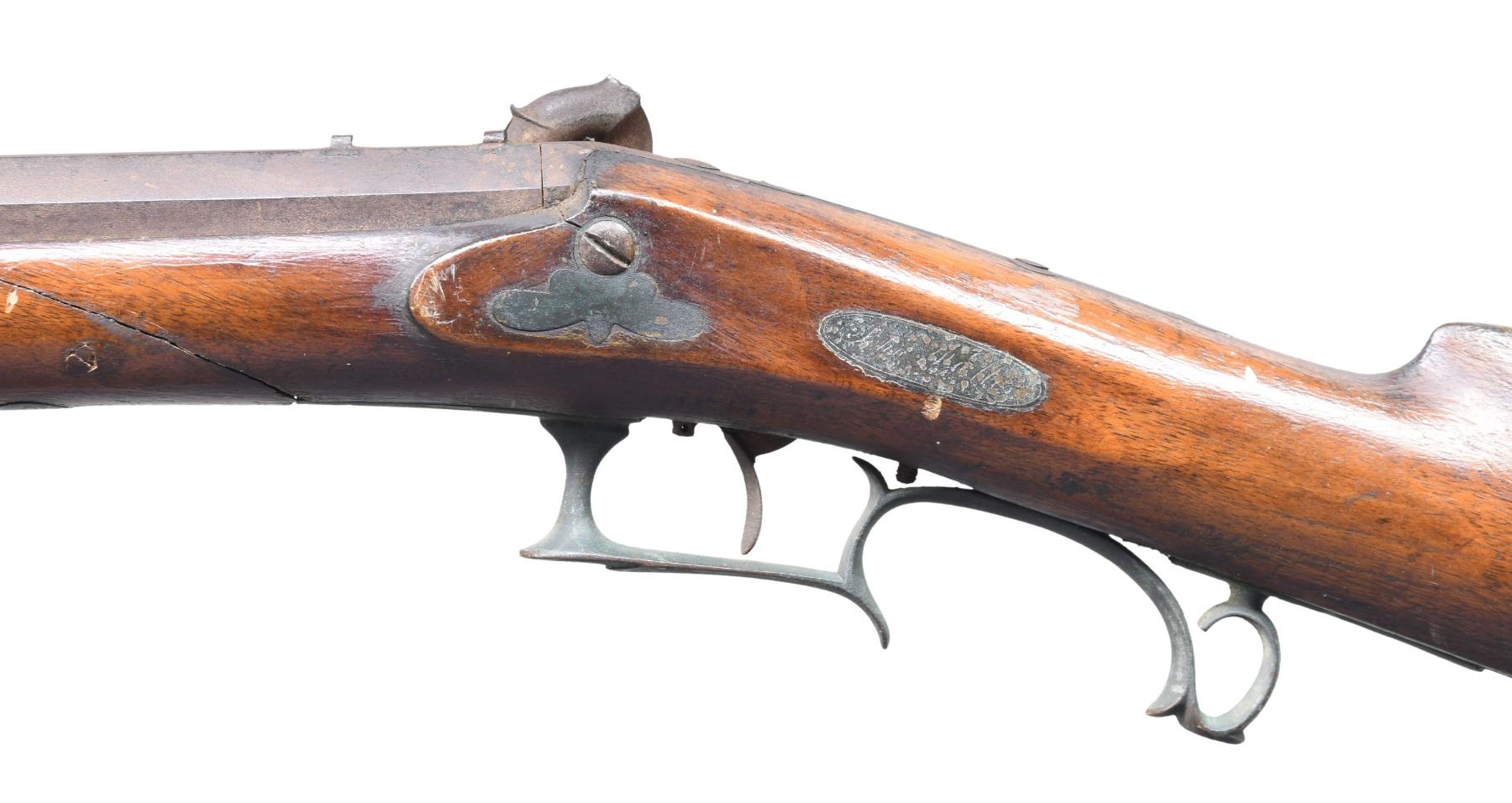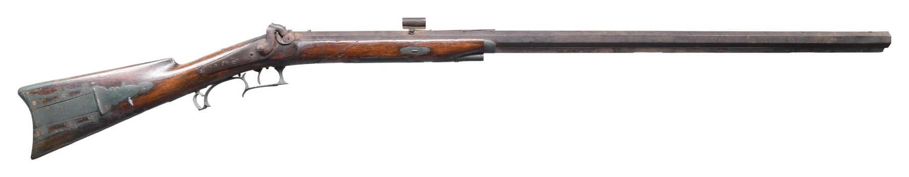 SPORTING RIFLE. Cal. 45. NSN. Bbl. 36" heavy oct. No front sight present. Bbl. mounted globe rear sight. Percussion half-stock rifle attributed to 19th century gunsmith Charles Raker of Bedford County, PA. No visible markings on bbl. or lock. Trigger spur broken off & missing. Single trigger. Half-length stock with patchbox. Inside of patchbox marked "LEWIS". No ramrod present. Left side cheekpiece with star decoration. CONDITION: stock shows notable crack ahead of lock running from front of trigger guard to both top sides of forend, a few other smaller cracks, scattered flaking finish & handling wear. Metal has an attic find dark gray patina with scattered oxidation & light pitting. Hammer is frozen & not functioning when hand cycled. Dark bore with scattered oxidation but evident rifling. (01-26995/MJC). ANTIQUE. $500-800.