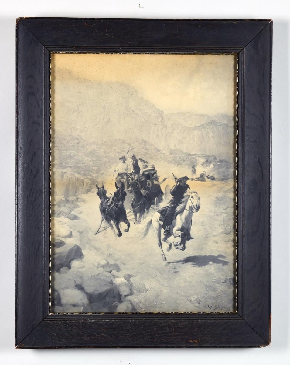 THE MAIL". Circa 1900. Platinum print of a stagecoach fleeing from a band of Indians on horseback. Housed in oak frame under glass. Signed lower left. SIZE: overall 25" x 19", sight 20 1/2" x 15". CONDITION: toning, otherwise good. PROVENANCE: Martin Lane Historic & Western Americana Lifetime Collection. (02-21594/TG). $300-500.