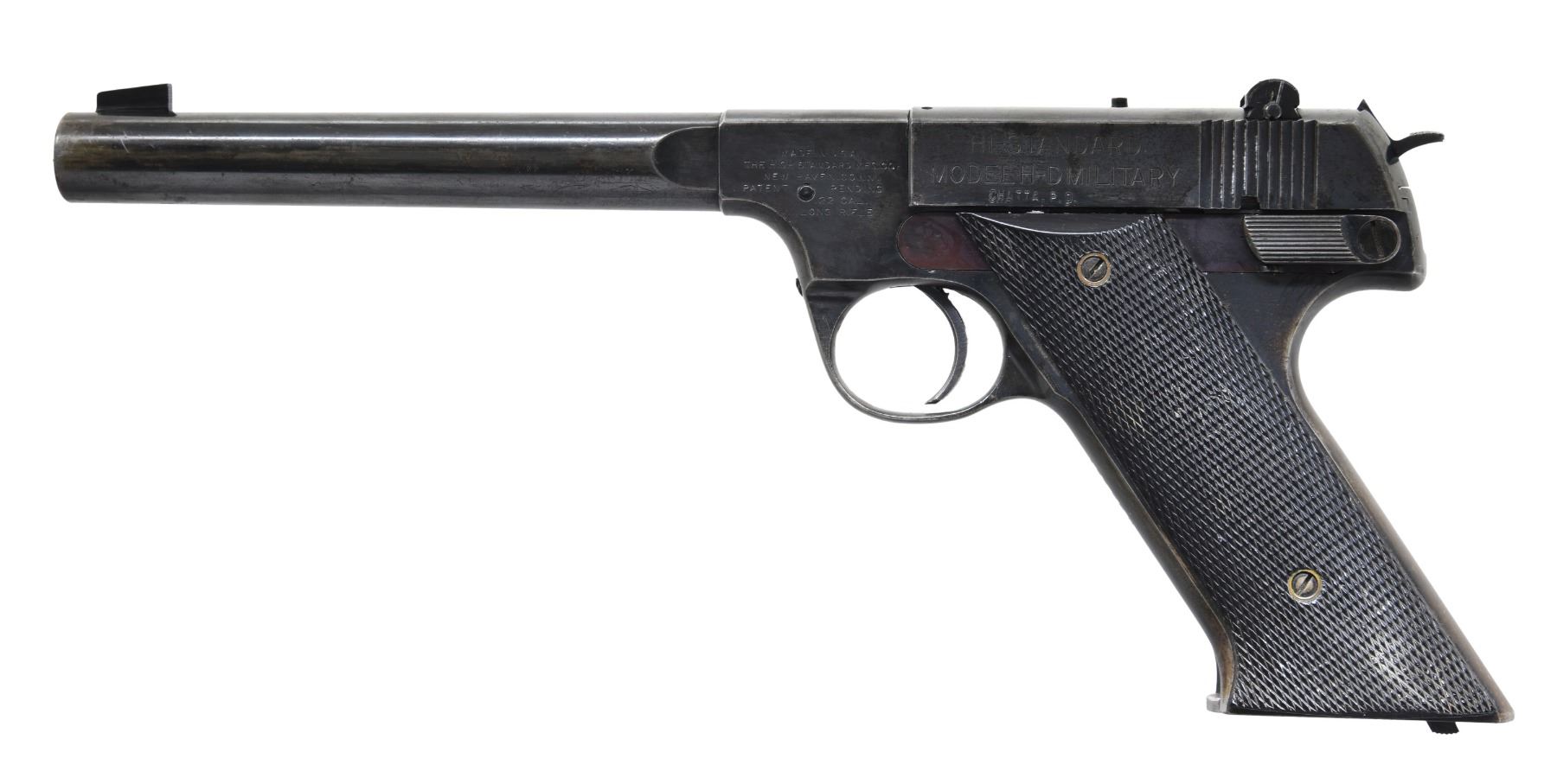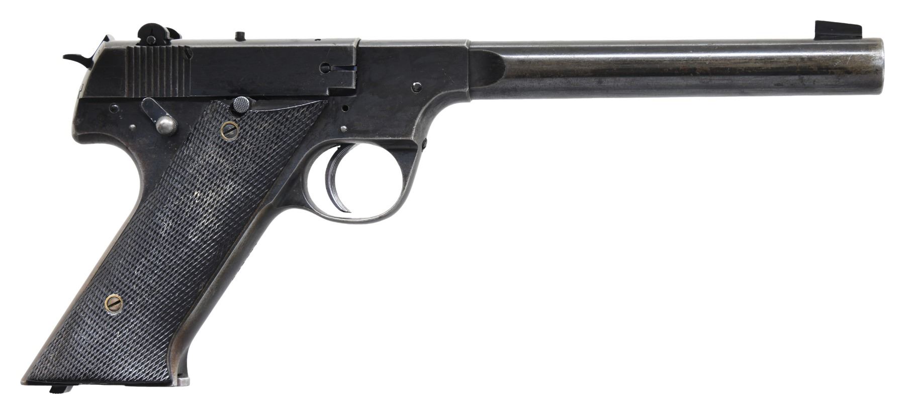 MILITARY SEMI AUTO PISTOL. Cal. 22 LR. S# 166850. Bbl. 6 3/4". Blade front sight. Adjustable square notch rear sight. Left side of slide marked "CHATTA, P.D." for Chattanooga, TN police department. Blued finish. Checkered hardwood grips. MAGS: 1-10 rd. CONDITION: grips have a dark appearance with some chipping, dirt staining & handling marks. Metal retains 50% blue with overall fading to gray throughout, some handling marks, edge wear & moderate oxidation. Slide is sluggish & loose but functional when hand cycled. Safety & trigger are functional when hand cycled. Bright near excellent bore. (25-2079/MJC). CURIO. $400-600.