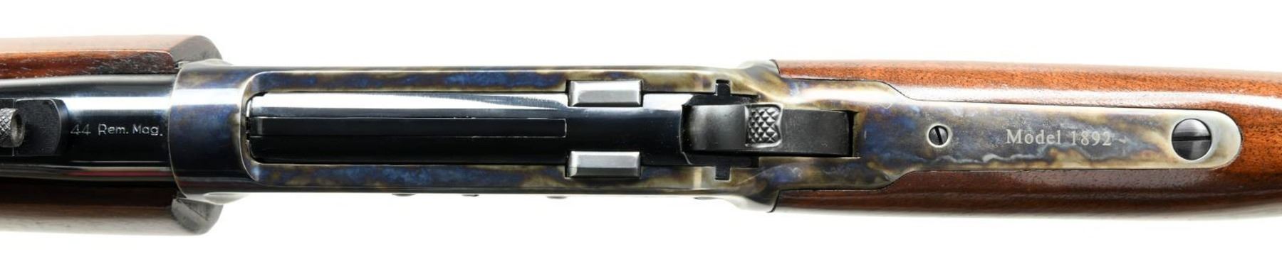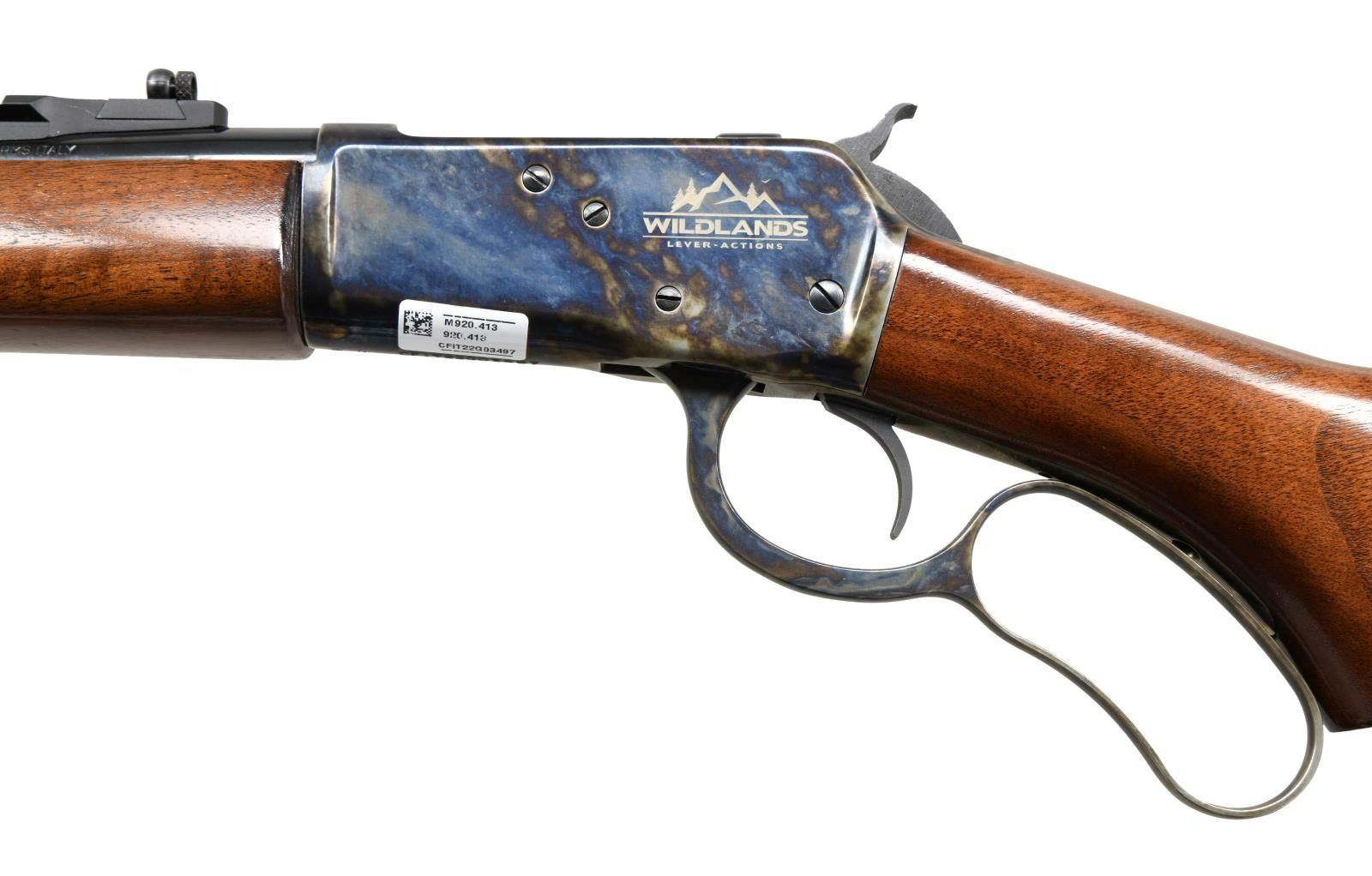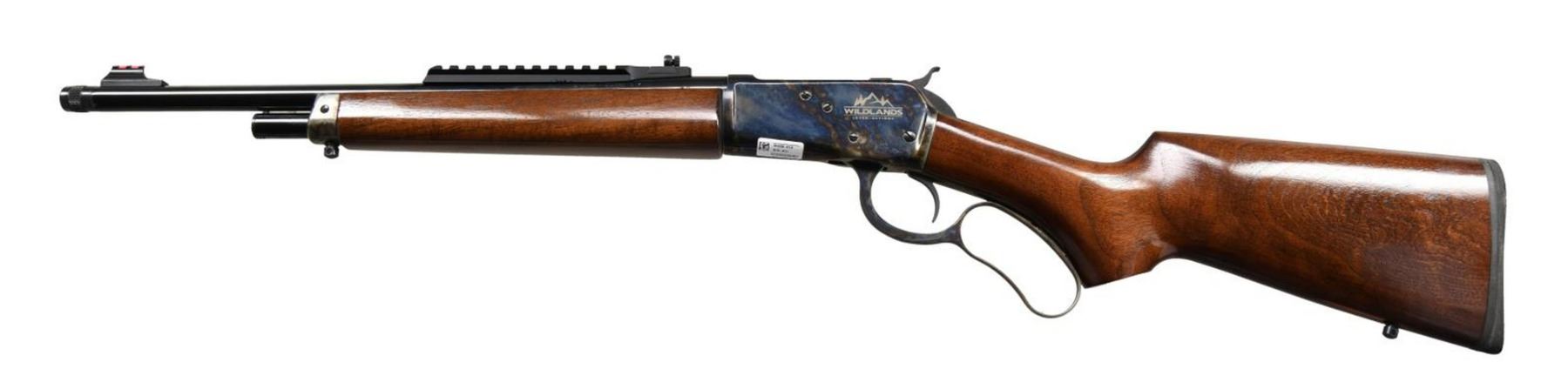 WITH MATCHING FACTORY BOX. Cal. 44 Rem Mag. S# CFIT22G03497. Bbl 16 1/2". Model 1892 Wildlands lever action rifle mfg. by Chiappa Firearms of Italy and imported by Chiappa Firearms LTD. of Dayton, OH. The left side of the bbl. is marked "CHIAPPA FIREARMS ITALY" above Italian proofs, with Chiappa's importer information on the right, and the cal. designation over the top of the breech. The left side of the receiver is marked with a silhouette of mountains and trees above "WILDLANDS/ LEVER-ACTIONS". Receiver, lever, and forend cap exhibit a case color hardened finish, with the bbl. and mag. tube being blued. Plain wood pistol grip buttstock with plain wood forend. Red fiber optic front sight with aperture rear sight. Threaded muzzle nut with black anodized aluminum picatinny rail. UNATTACHED ACCESSORIES: matching factory box. CONDITION: near new, with metal components retaining virtually all of their original factory applied finishes overall. Brilliant mirror bore, exhibiting well defined rifling throughout. Wood furniture is excellent overall. Box shows some mild exterior wear, but is otherwise sturdy and serviceable. PROVENANCE: The Collection of Gun Sport Ltd owned by Jon R. Thomas. (23-3172/MLW). MODERN. $700-1,000.
