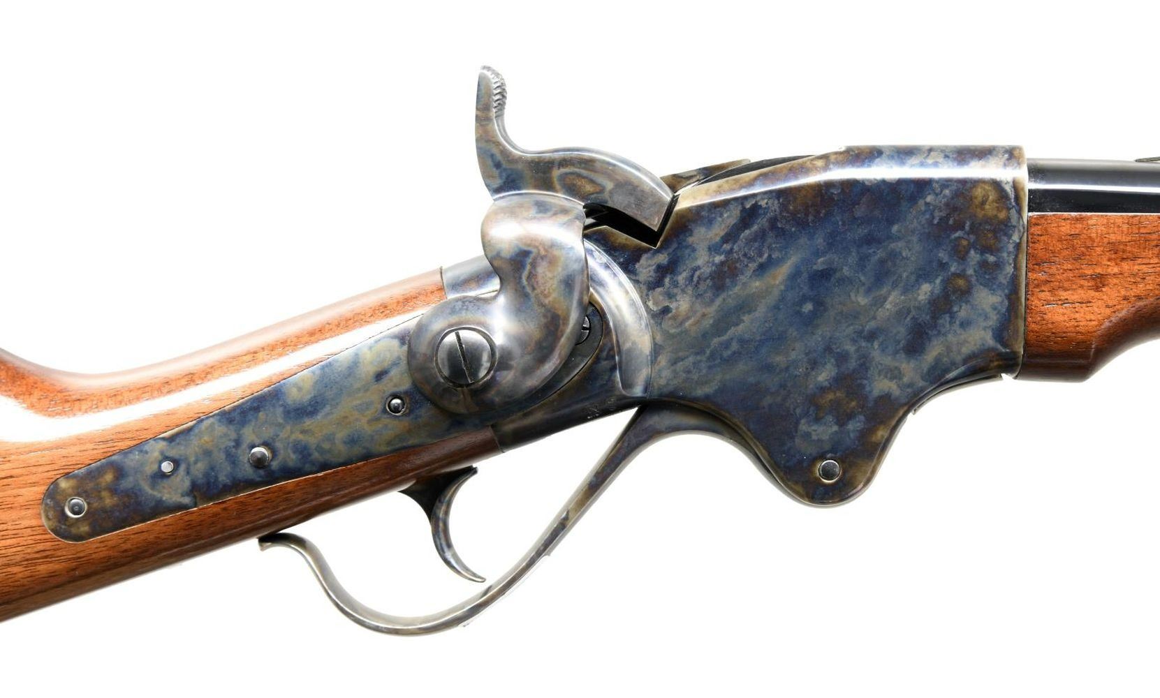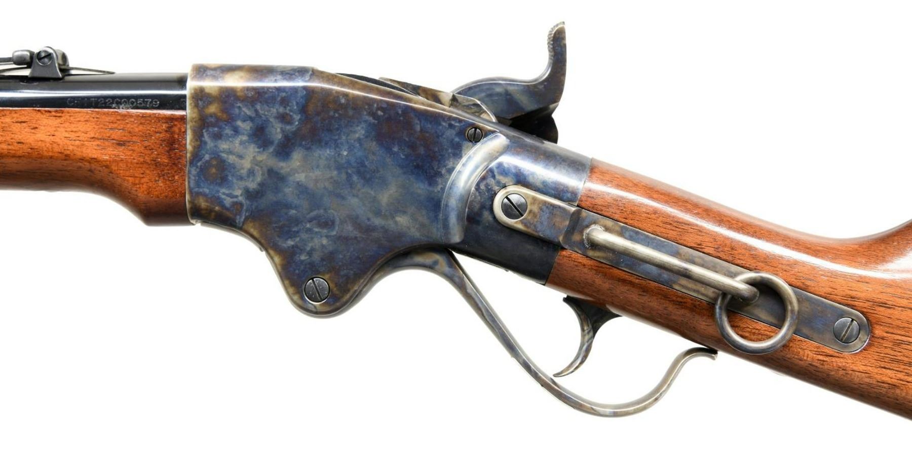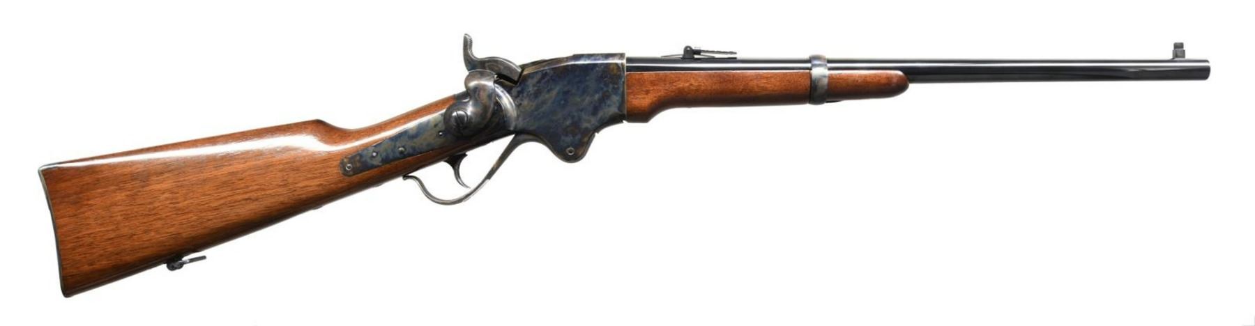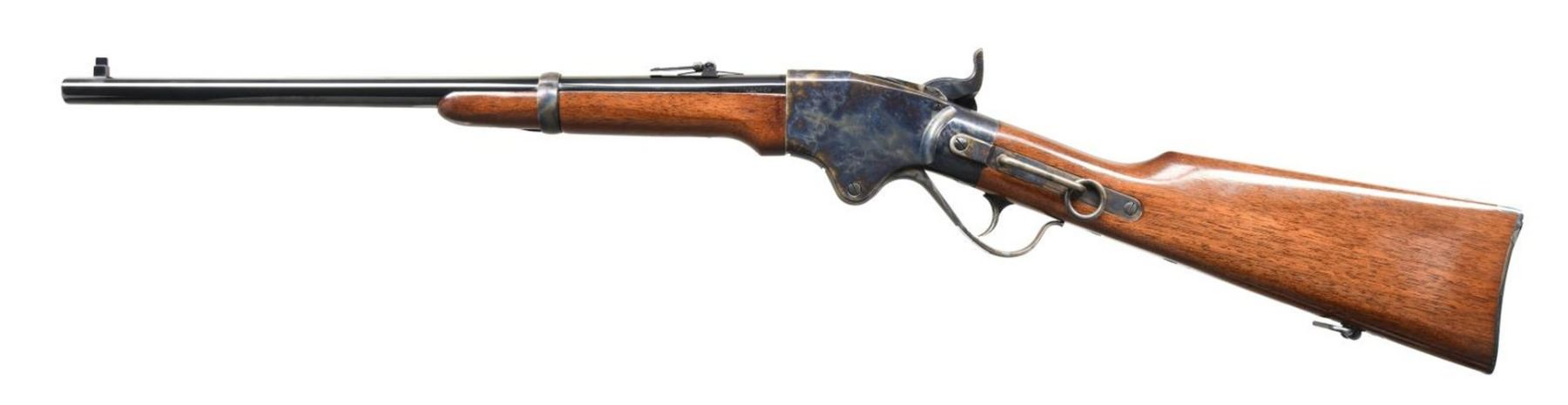 CARBINE WITH MATCHING CASE. Cal. 45 Colt. S# CFIT22C00579. Bbl 20". Model 1860 Spencer carbine mfg. by Chiappa Firearms in Italy, imported by Chiappa Firearms LTD. of Dayton, OH, and retailed by Taylor's & Co. The top of the bbl. is marked with Chiappa's mfg. information, with the cal. designation on the underside, and the S# on the left. Top of receiver exhibits the model designation above Chiappa's importer information, with the S# at the rear. Frame, lever, trigger, hammer, breechblock, saddle ring, buttplate, and bbl. band exhibit a case color hardened finish, with the bbl. being blued. Smooth plain wood straight grip buttstock and forend. Blade front sight with flip up ladder rear sight. UNATTACHED ACCESSORIES: matching Taylor's & Co. retailer hard case. CONDITION: near new, with metal components retaining virtually all of their original factory finishes overall. Mirror bore, exhibiting well defined rifling throughout. Wood furniture is excellent. Case is very good, with some mild marks from handling and storage. PROVENANCE: The Collection of Gun Sport Ltd owned by Jon R. Thomas. (23-3220/MLW). MODERN. $800-1,200.